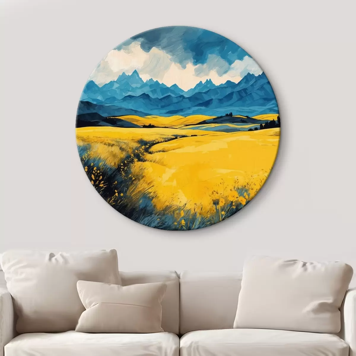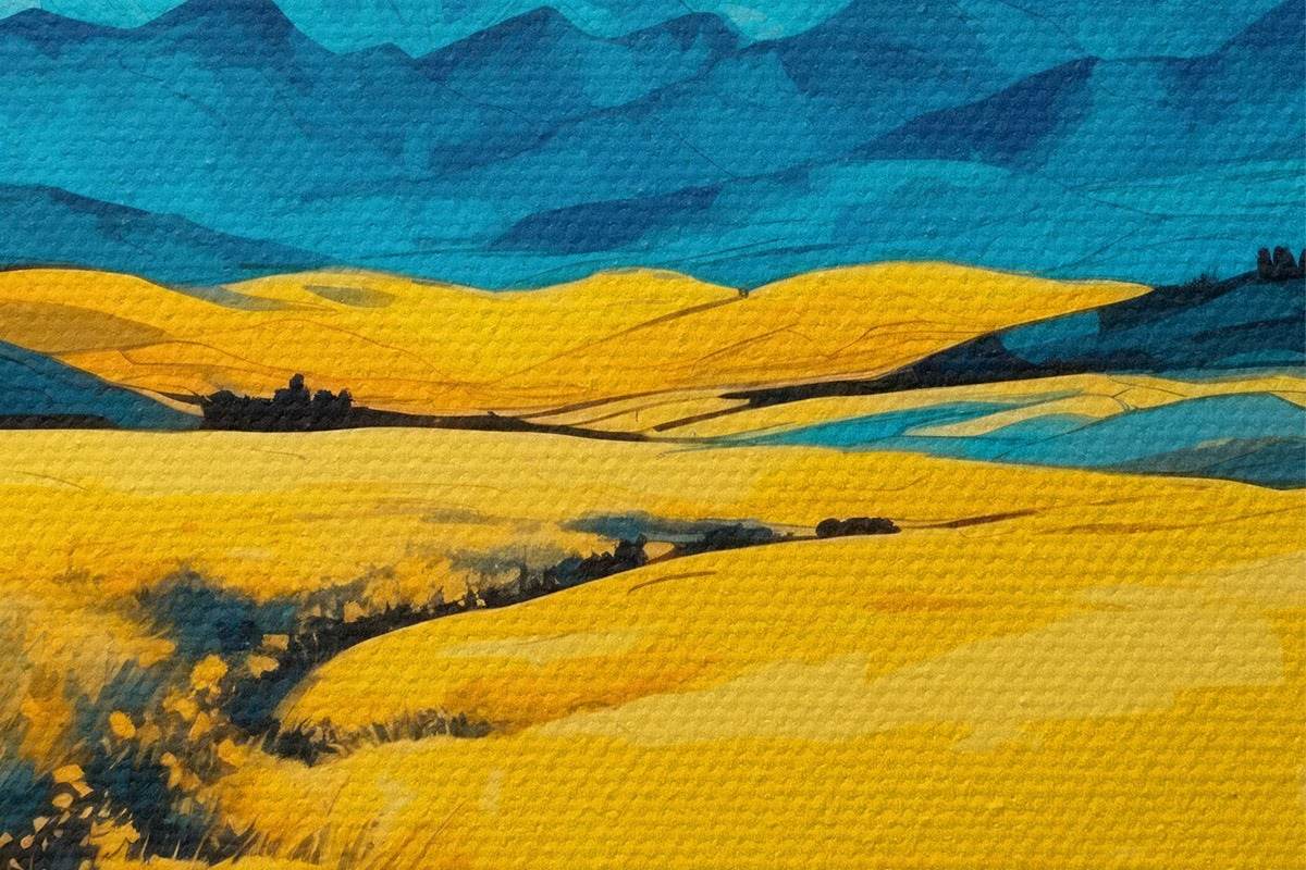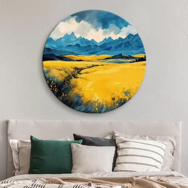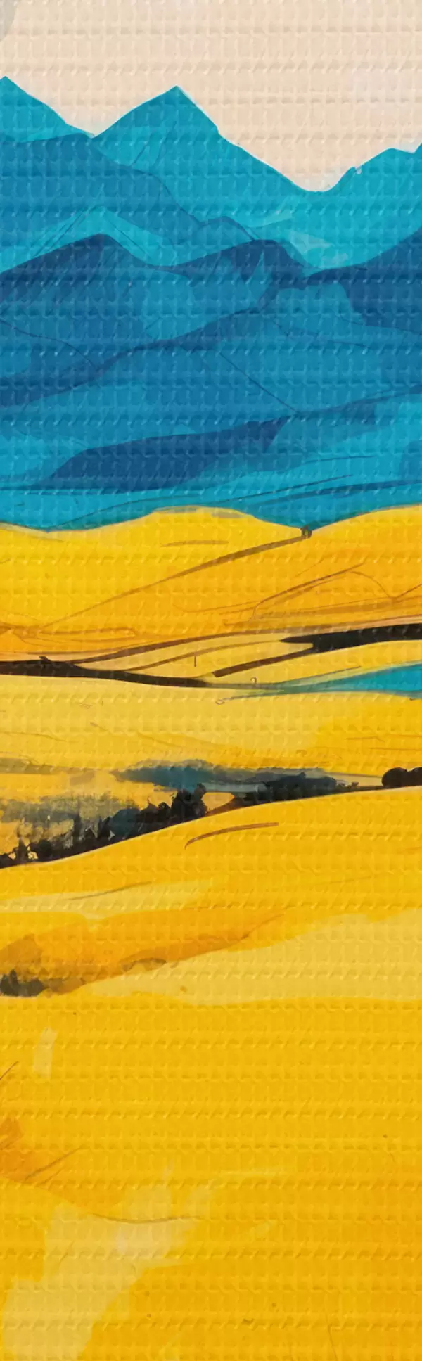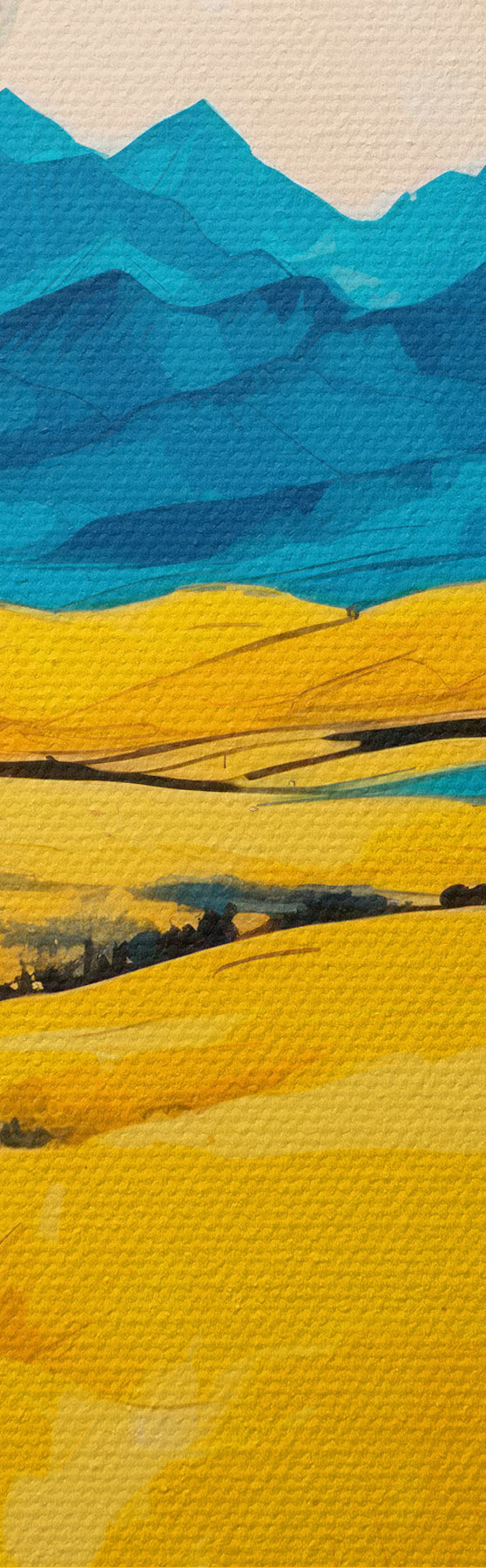 Nuotrauka Geltonas laukas kalnų fone akvarelės tapybos stiliumi Nr r43117