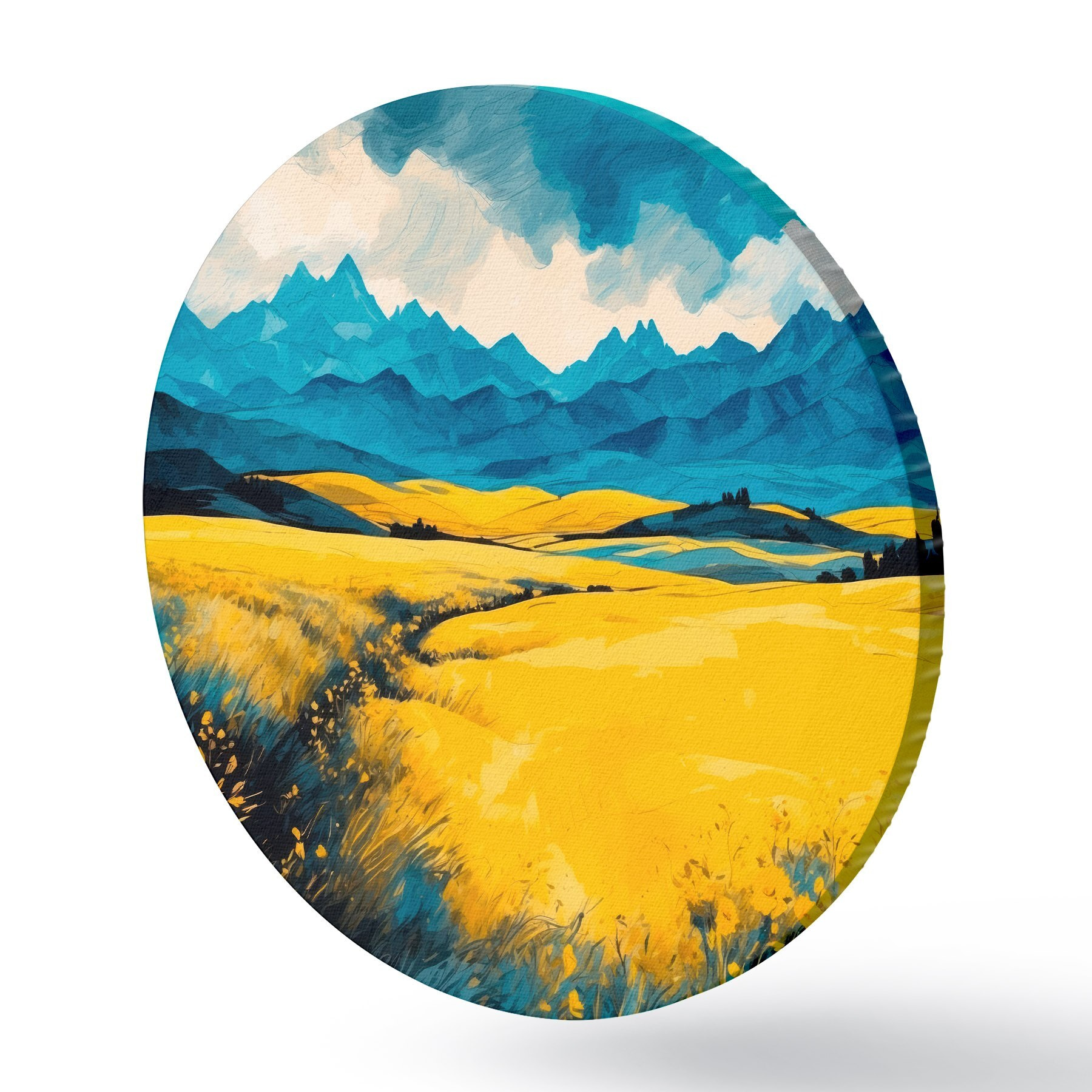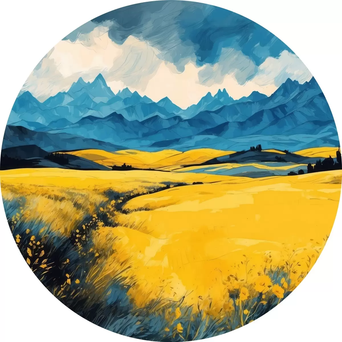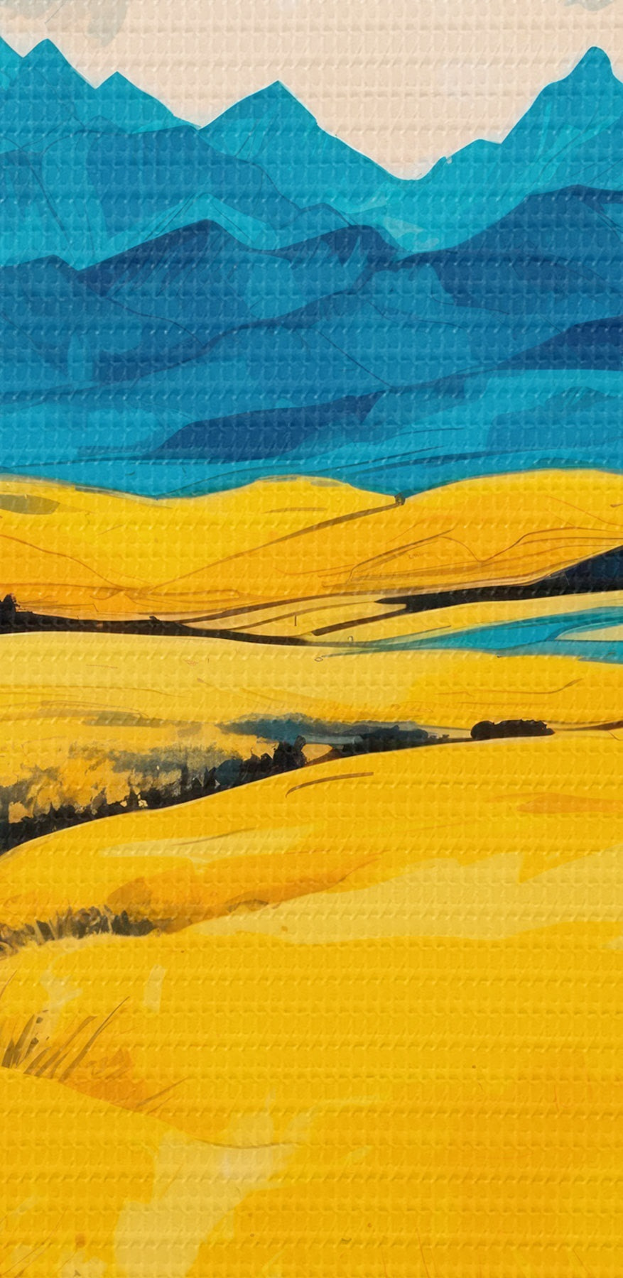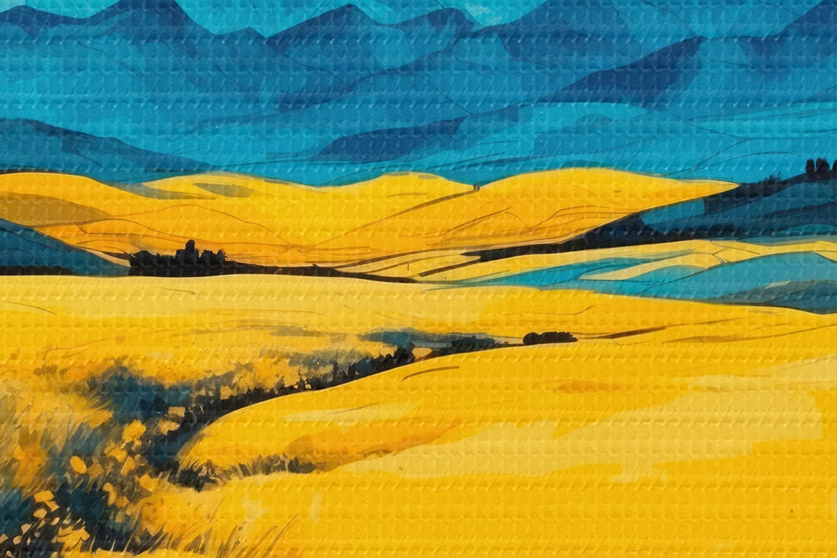 Nuotrauka Geltonas laukas kalnų fone akvarelės tapybos stiliumi Nr r43117