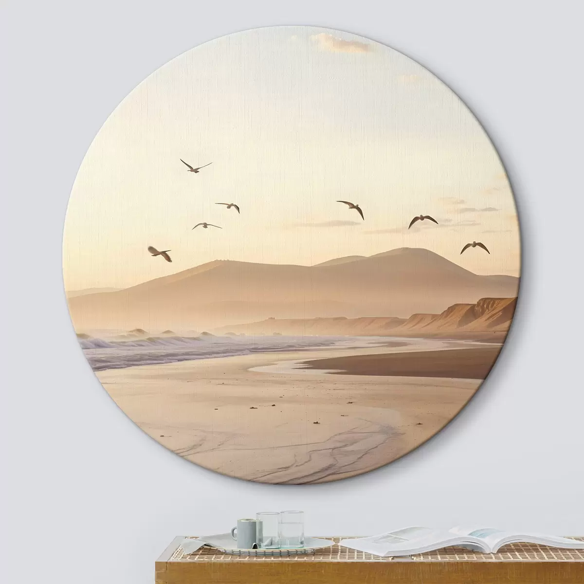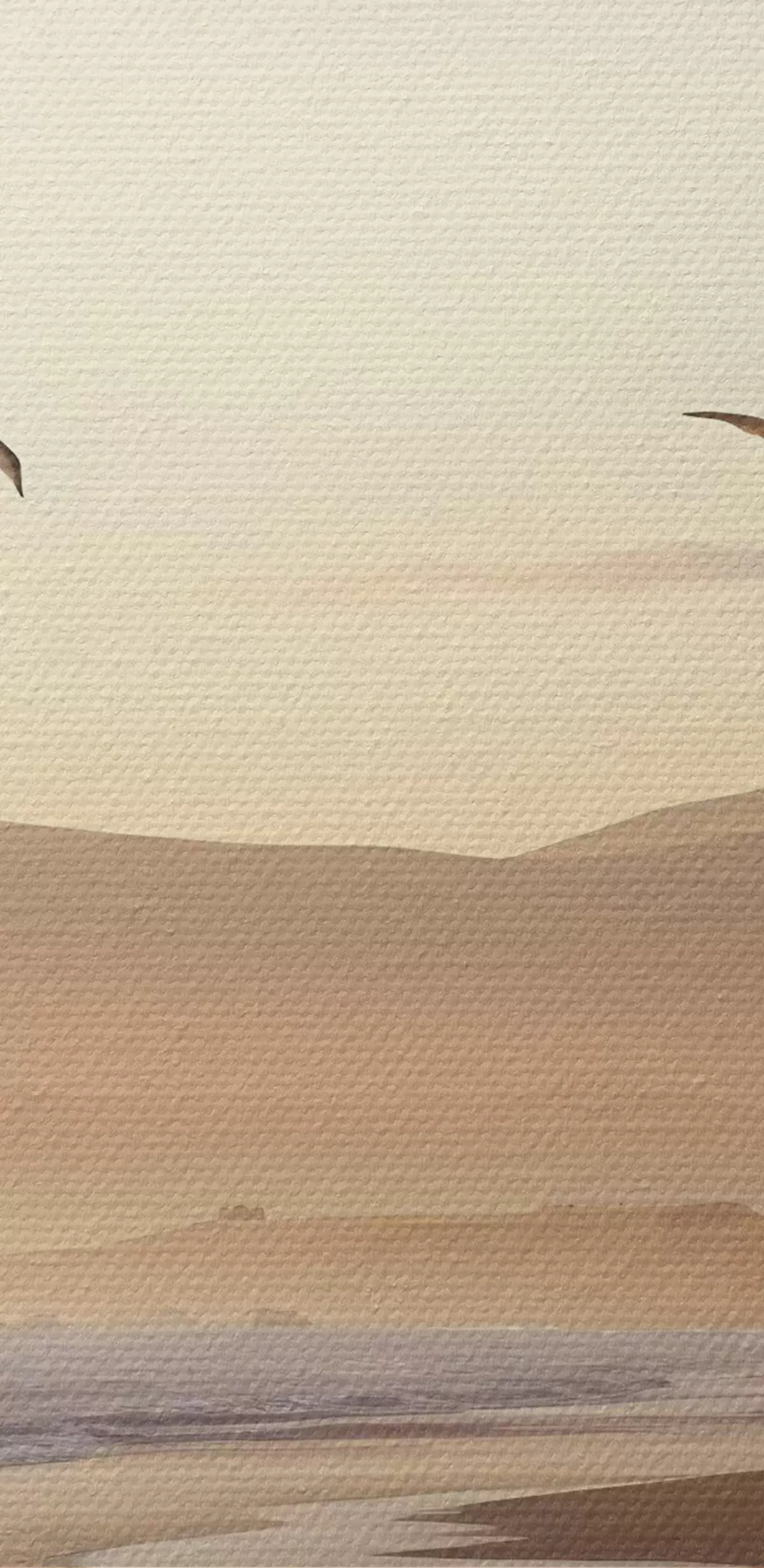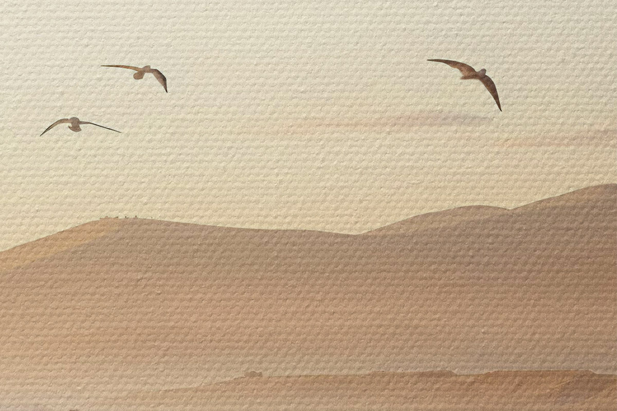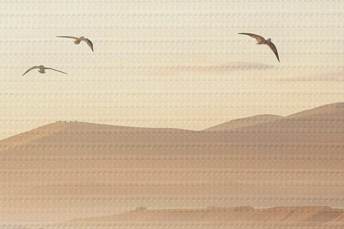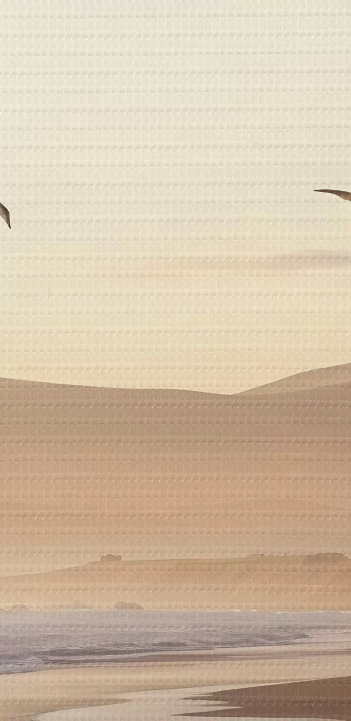Nuotrauka Paukščiai, skrendantys virš paplūdimio su vandenynu, kalnai fone, šiltos spalvos, minkšta pastelinė paletė Nr r43162