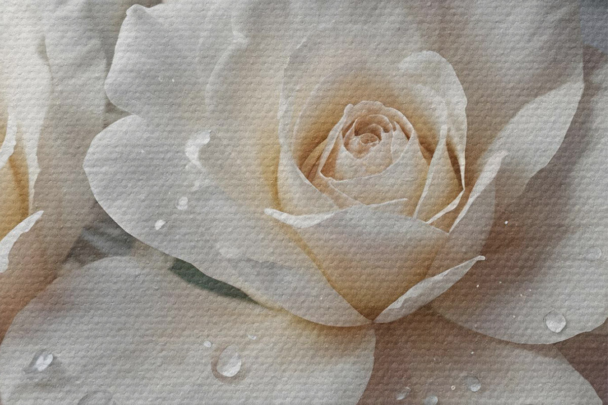 Nuotrauka Grupė baltų rožių su vandens lašais ant žiedlapių, keletas žalių lapų, prislopintas fonas, švelni šviesa Nr r43163