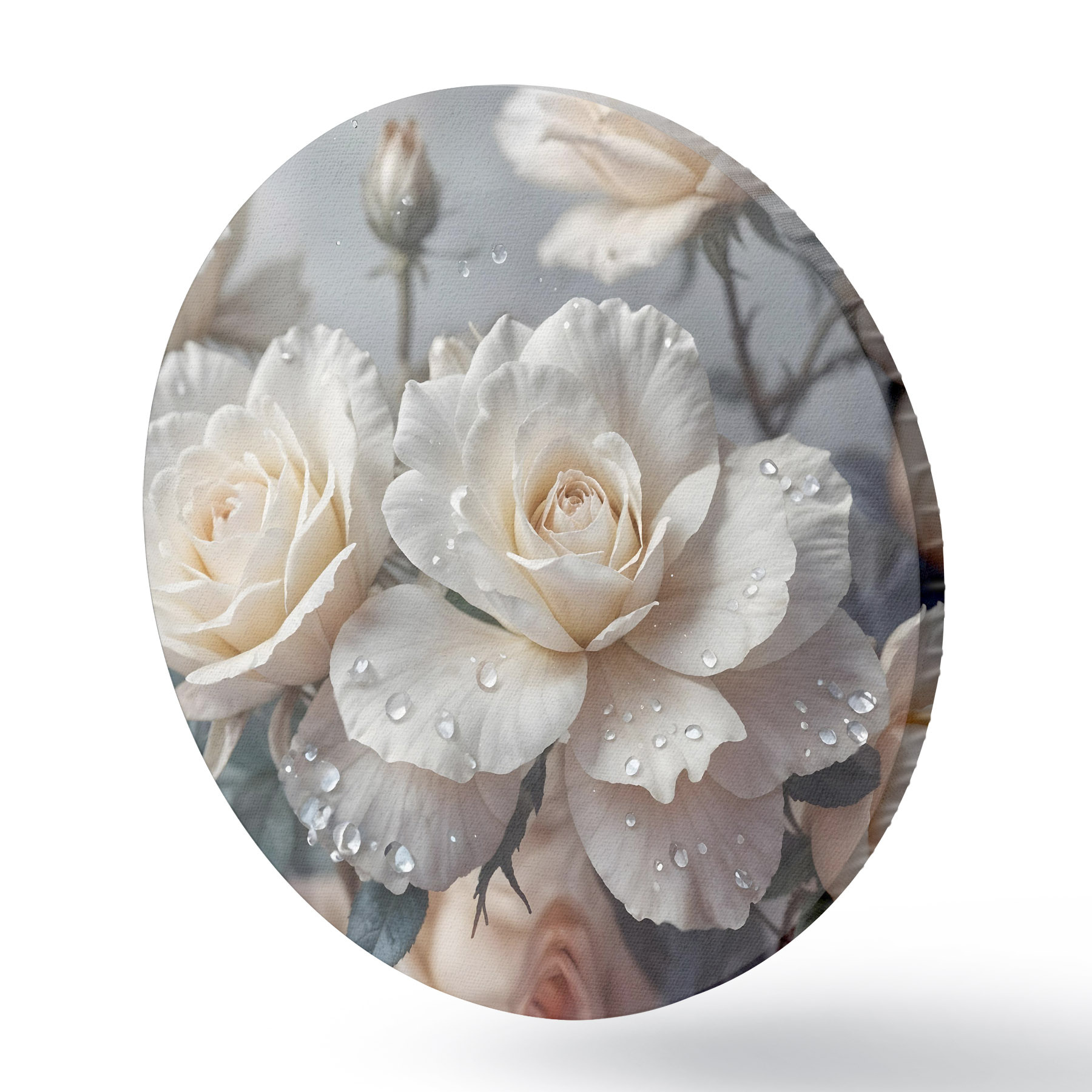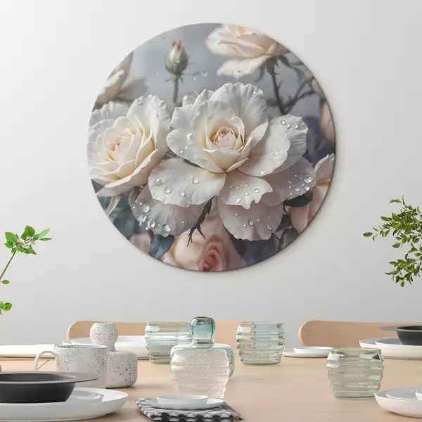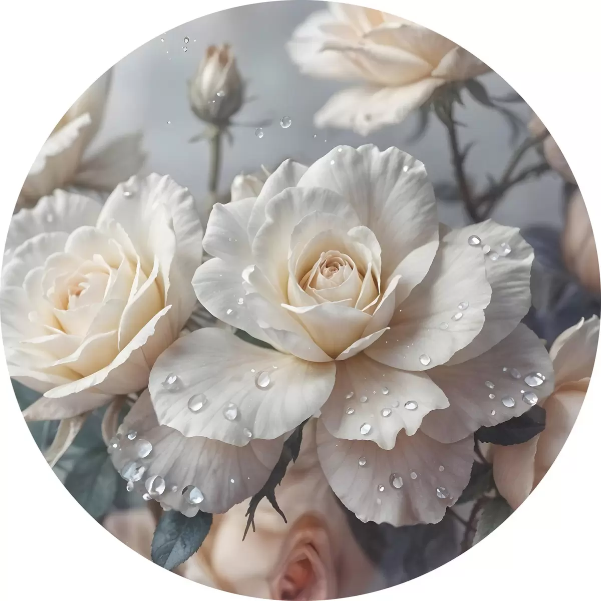 Nuotrauka Grupė baltų rožių su vandens lašais ant žiedlapių, keletas žalių lapų, prislopintas fonas, švelni šviesa Nr r43163
