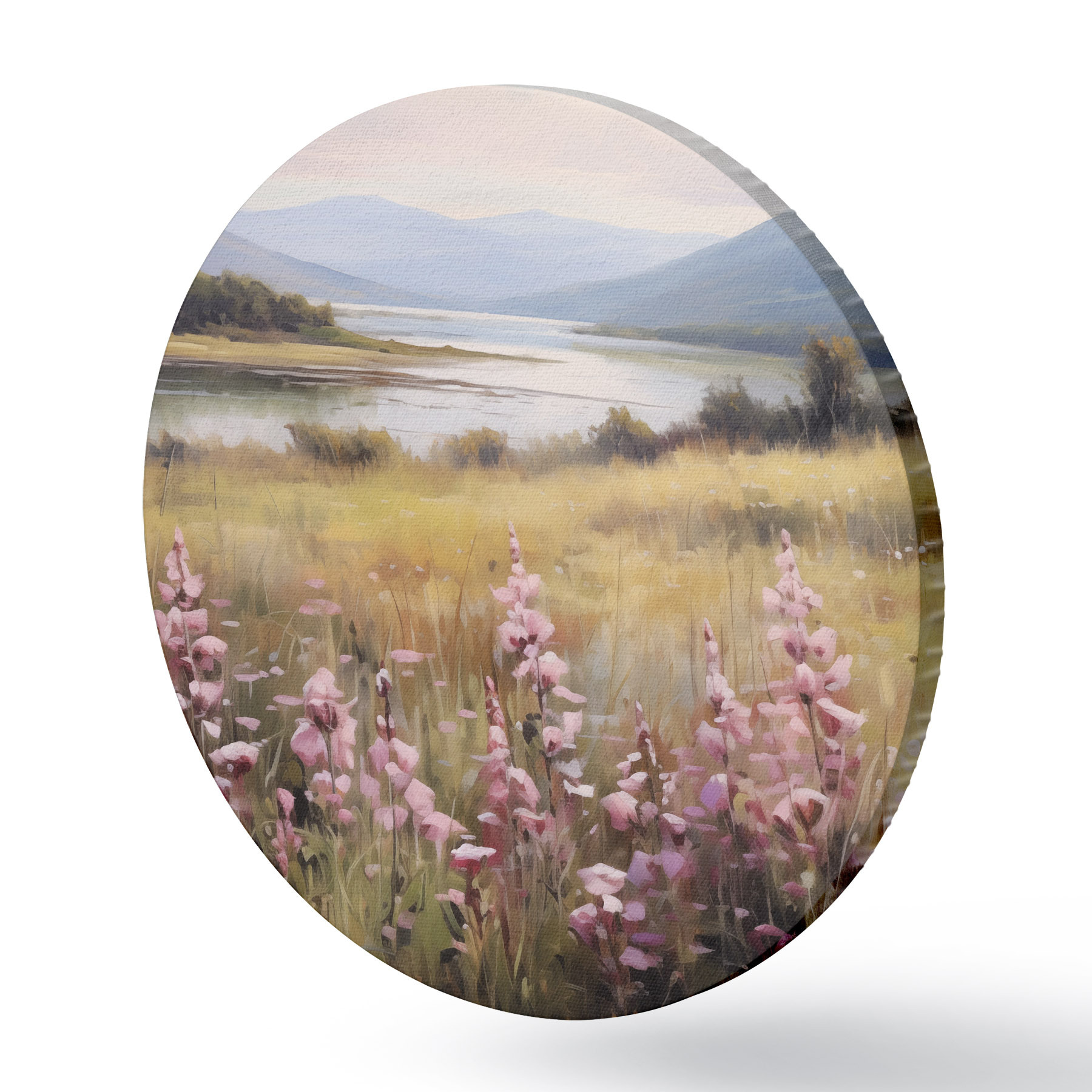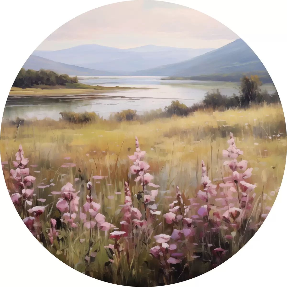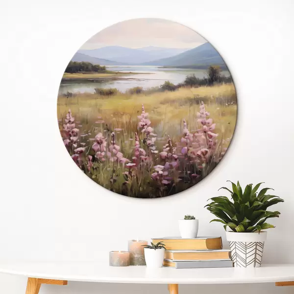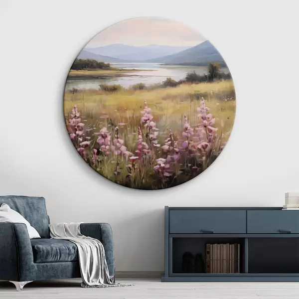 Nuotrauka Peizažas su rausvų gėlių lauku, ežeru ir kalnais fone, po debesuotu dangumi Nr r43165