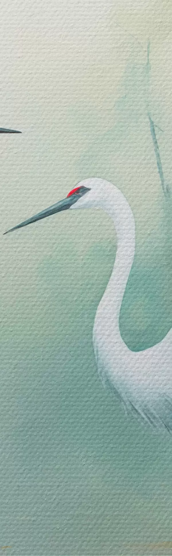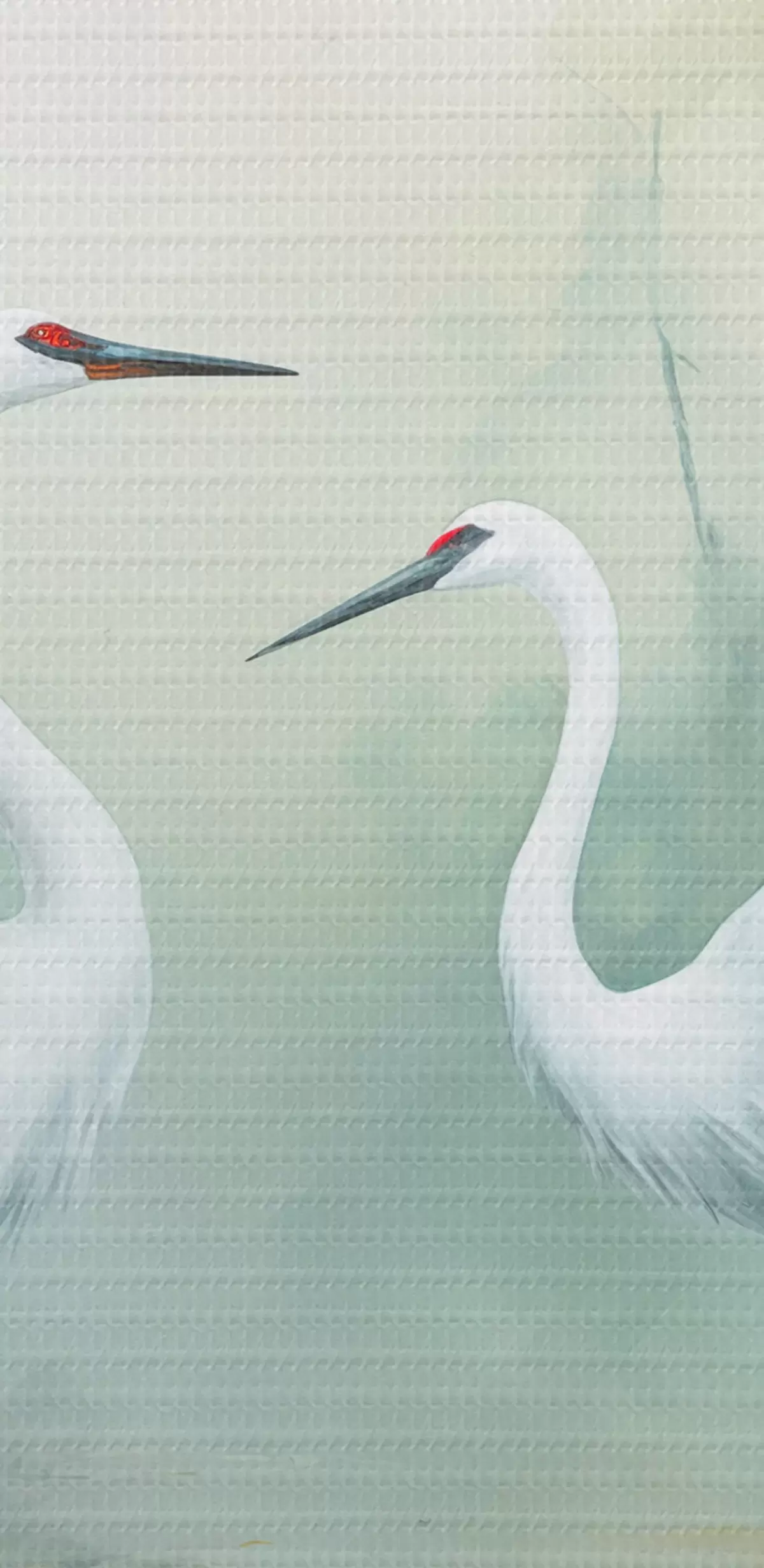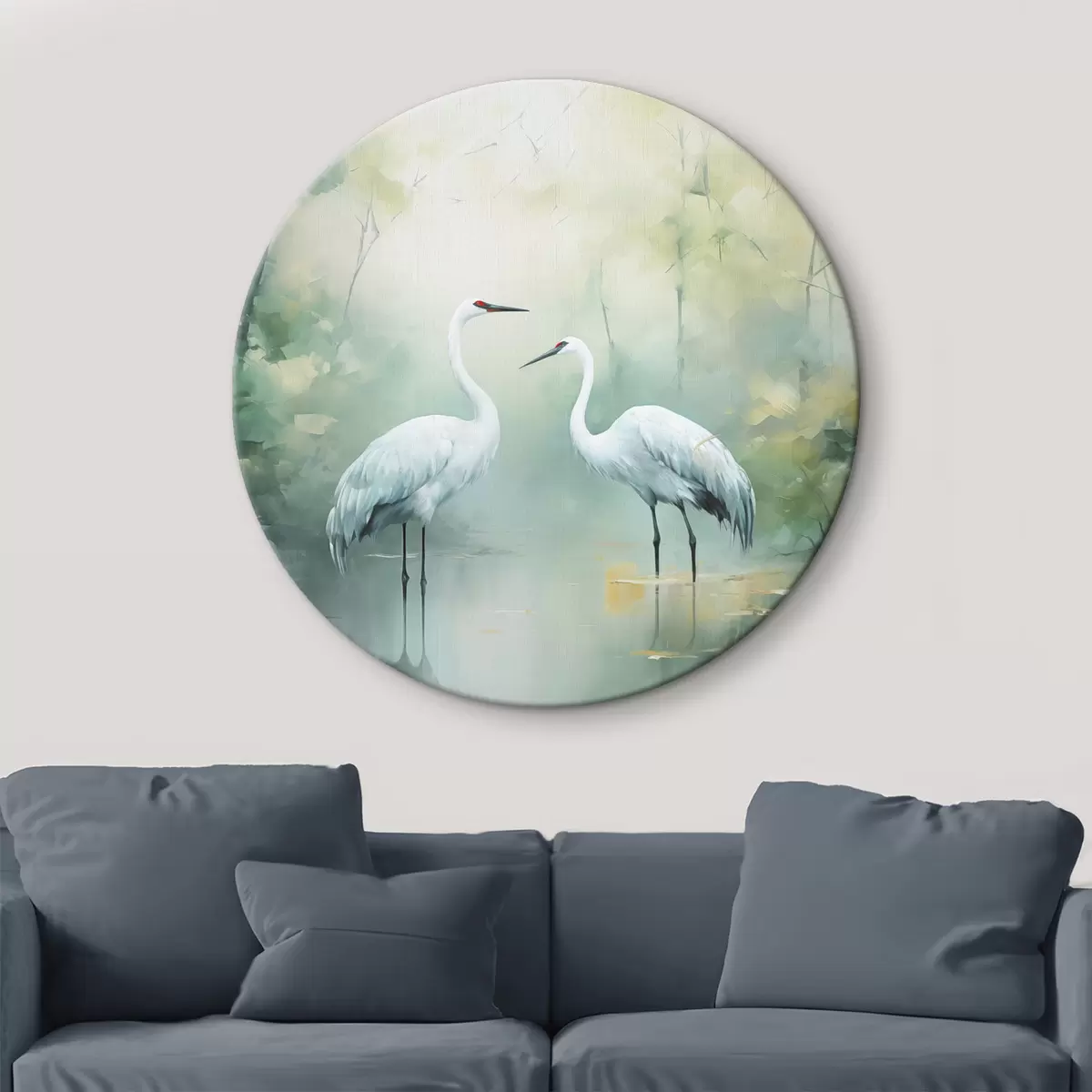 Nuotrauka Tvenkinyje stovinčios dvi baltos gervės, apsuptos sodraus žalio miško su švelniu, išsklaidytu apšvietimu Nr r43166