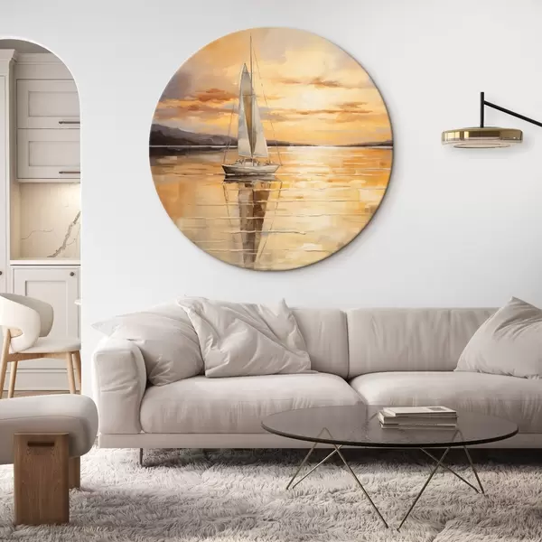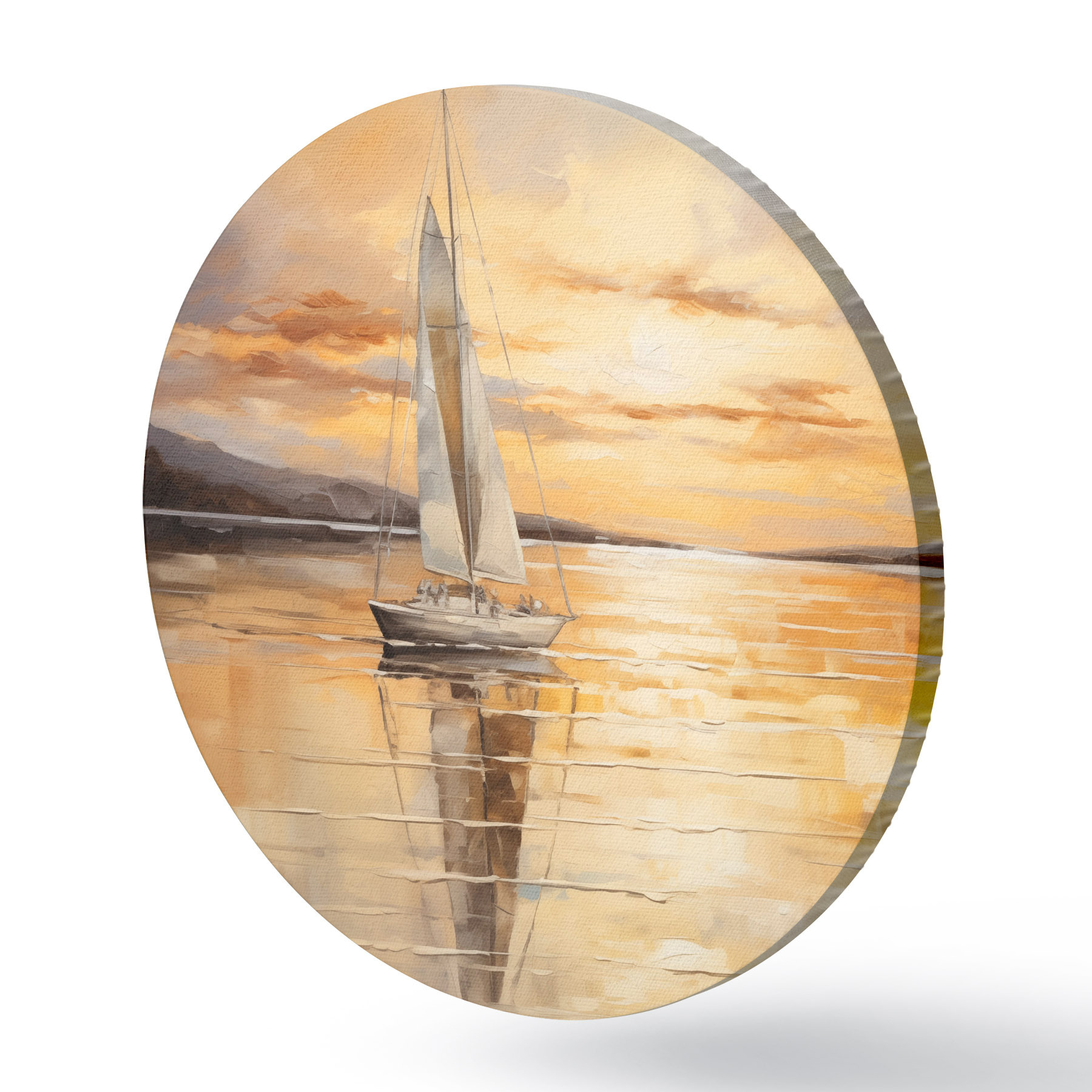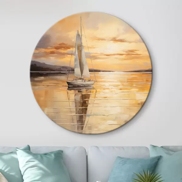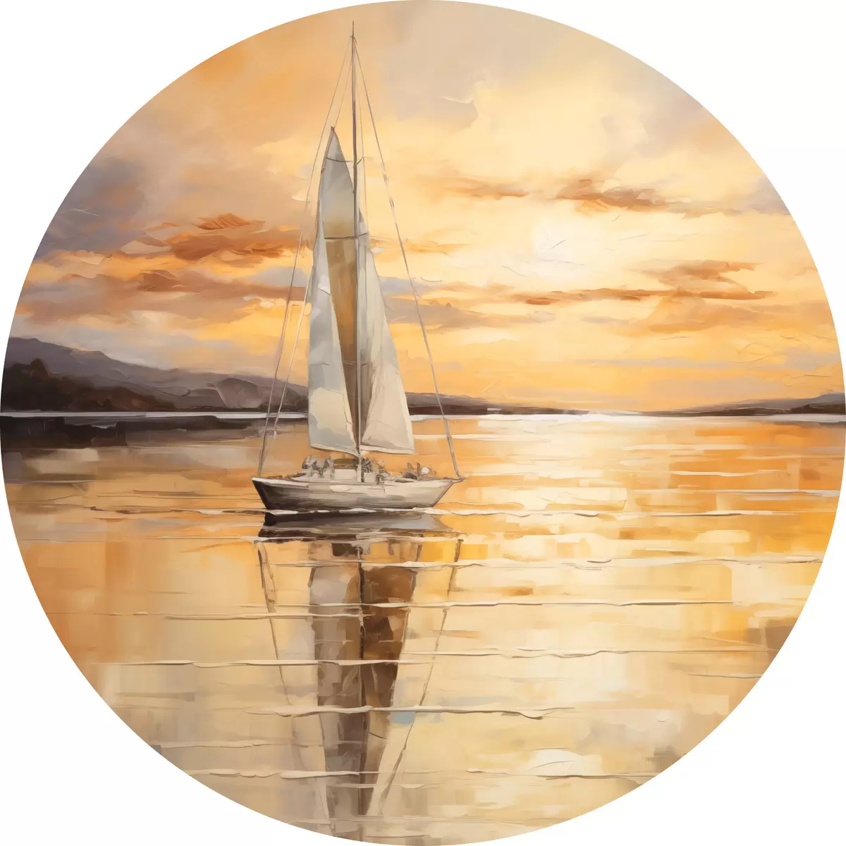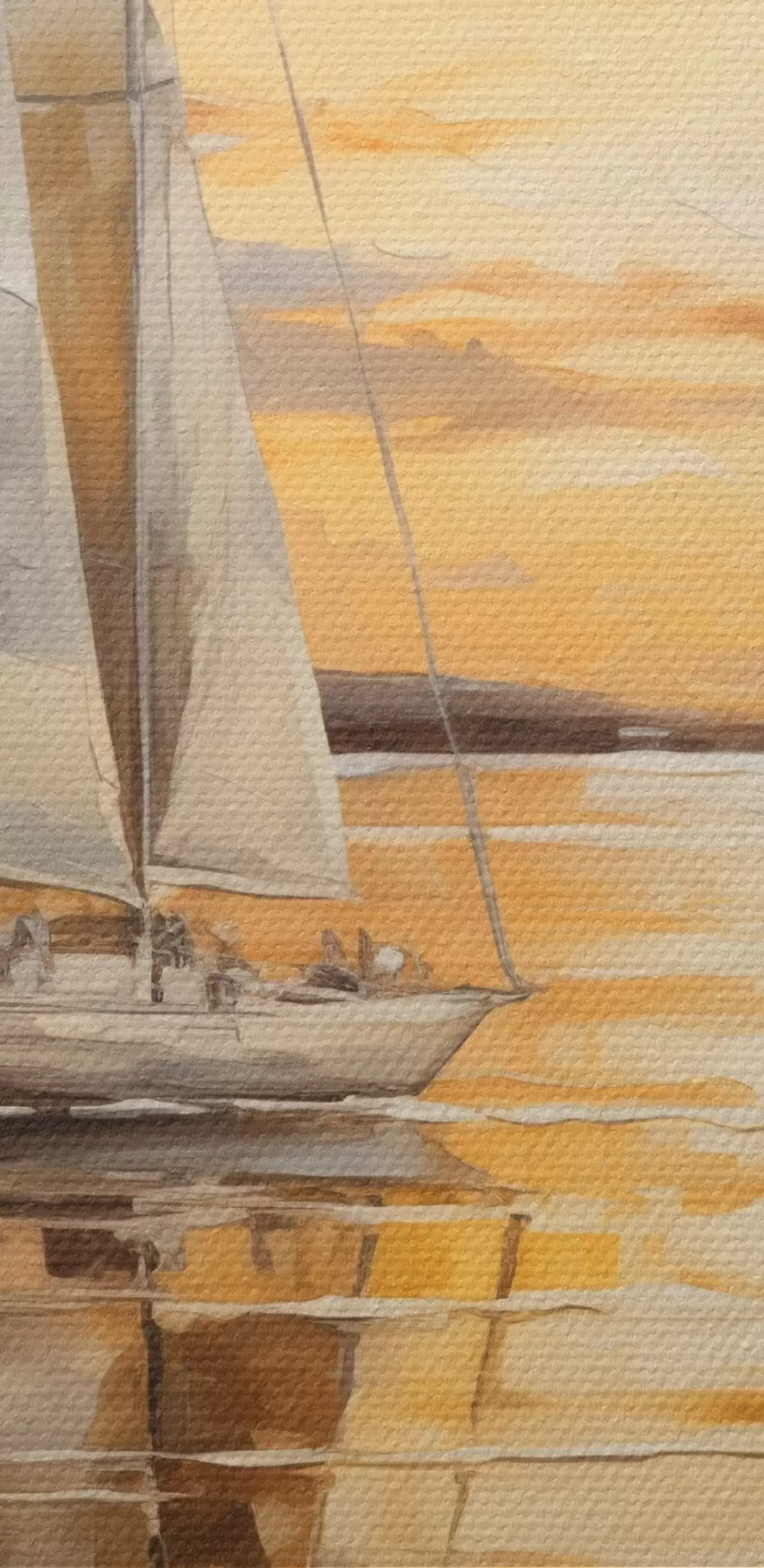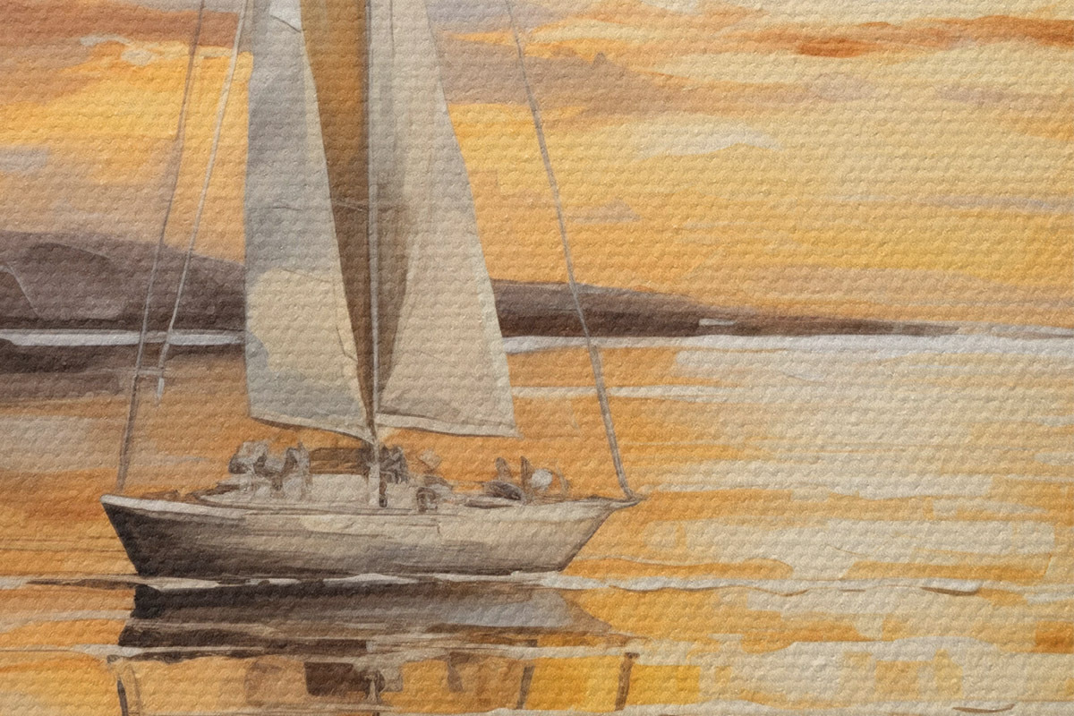 Nuotrauka Peizažas su burlaiviu ramioje jūroje, oranžiniu ir geltonu dangumi, tolimais kalnais Nr r43169