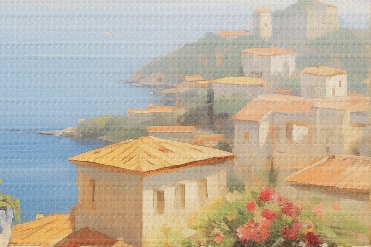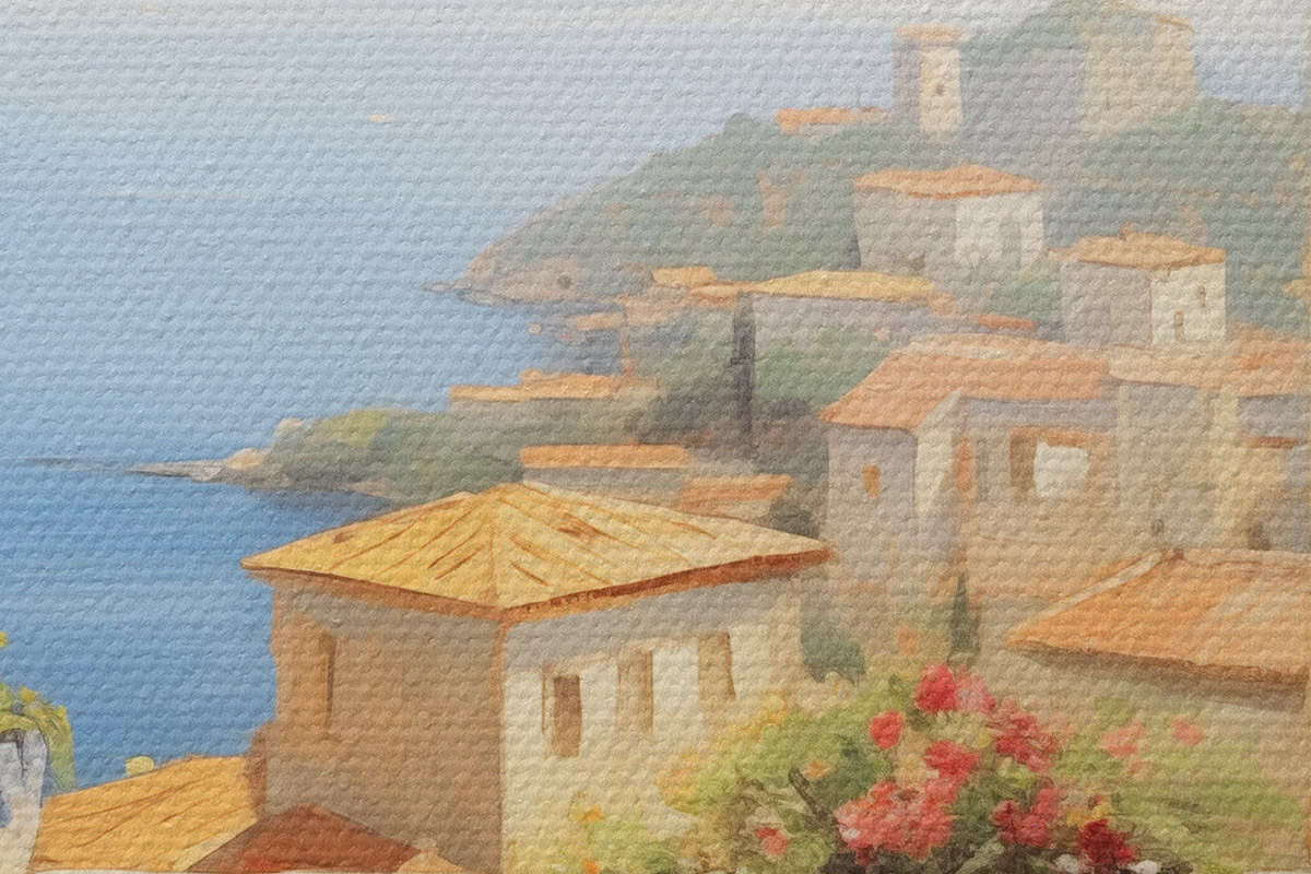 Nuotrauka Tapyba aliejiniais dažais balkono su gėlėmis imitacija, su vaizdu į jūrą, namus pakrantėje, saulėtą dieną, mėlynas dangus Nr r43173