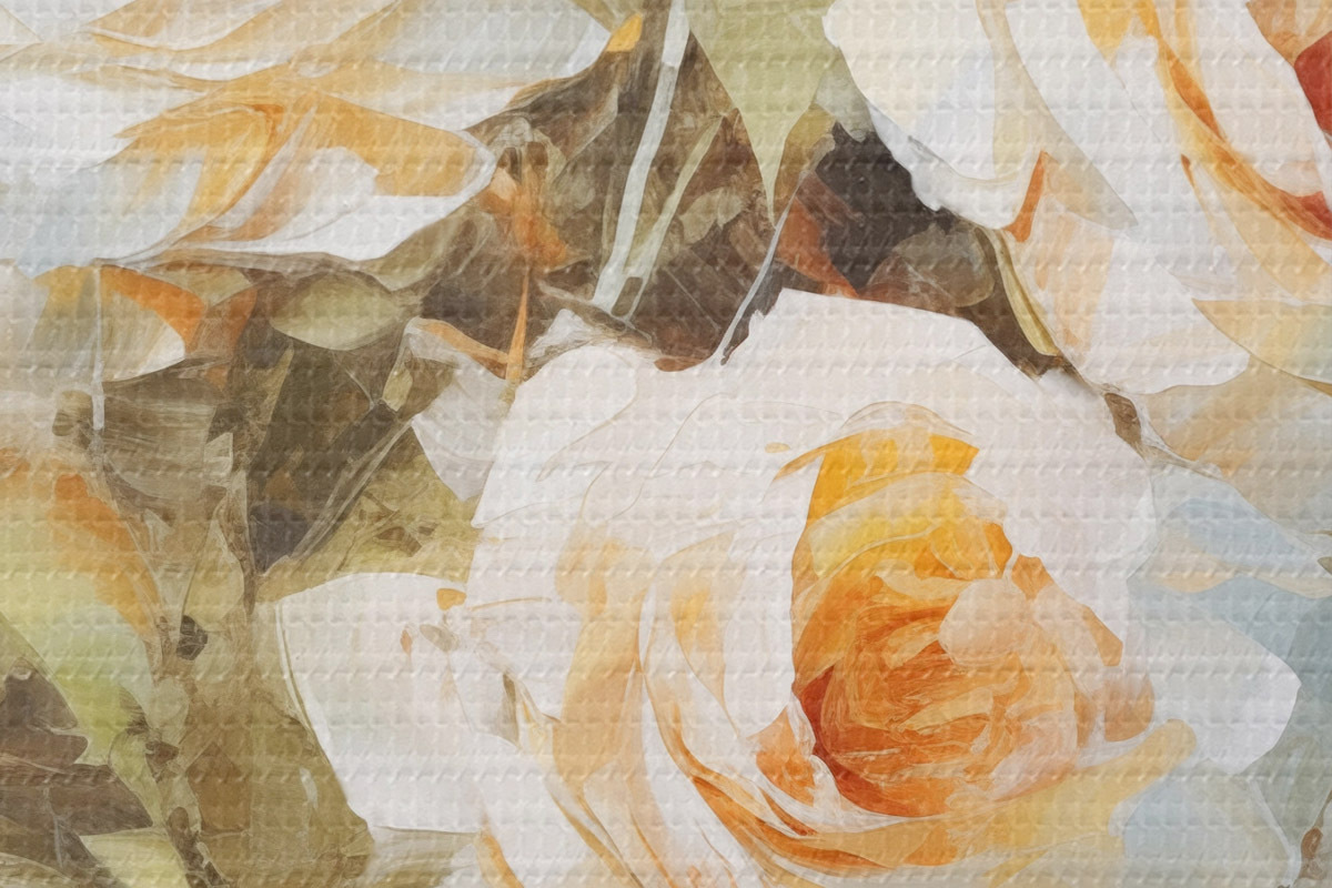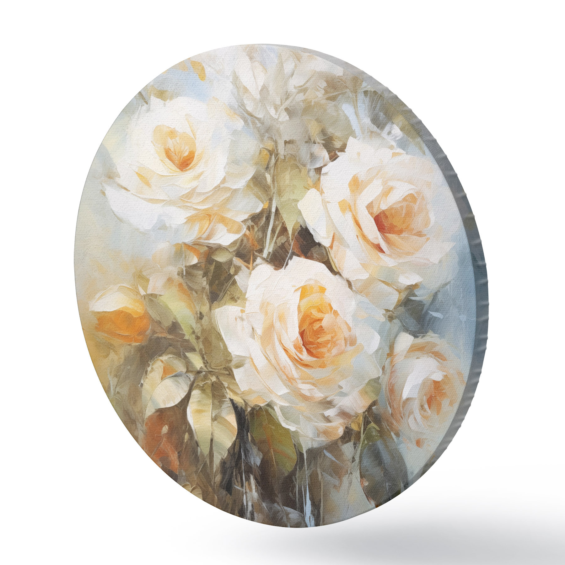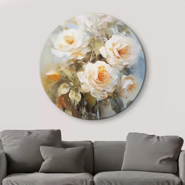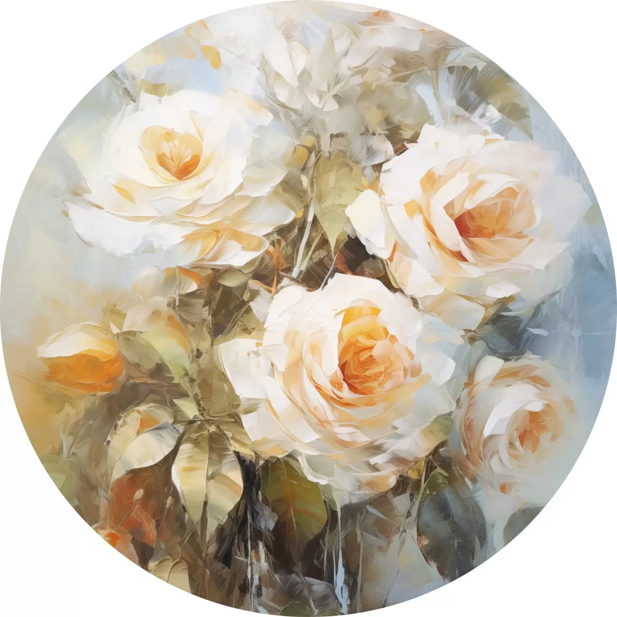 Nuotrauka Baltos rožės su oranžine spalva švelniame, šviesiai mėlyname fone, su matomais teptuko potėpiais ir tapybiniu stiliumi Nr r43175