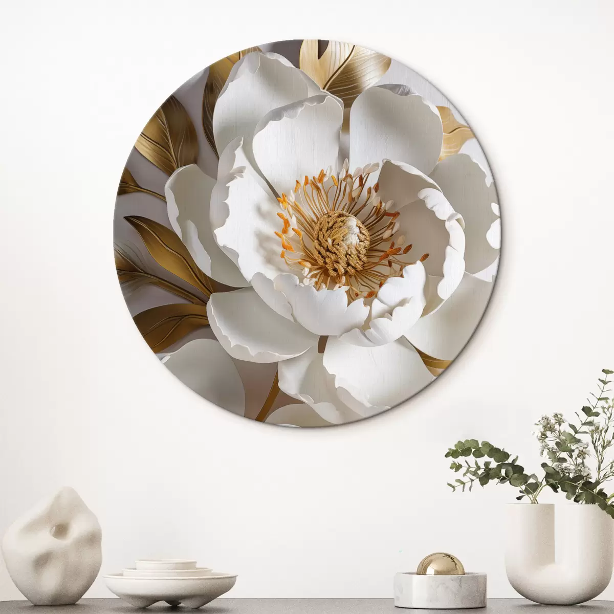 Nuotrauka Baltos subtilios detalios dekoratyvinės bijūnų gėlės su geltonais lapais, fonas yra šviesiai pilkos spalvos Nr r43176