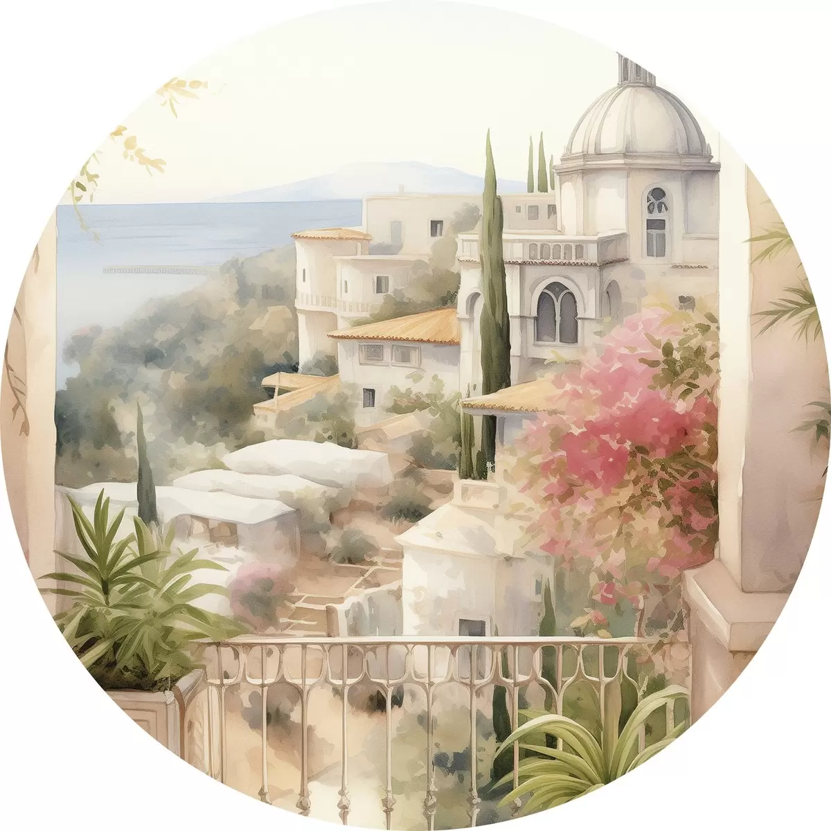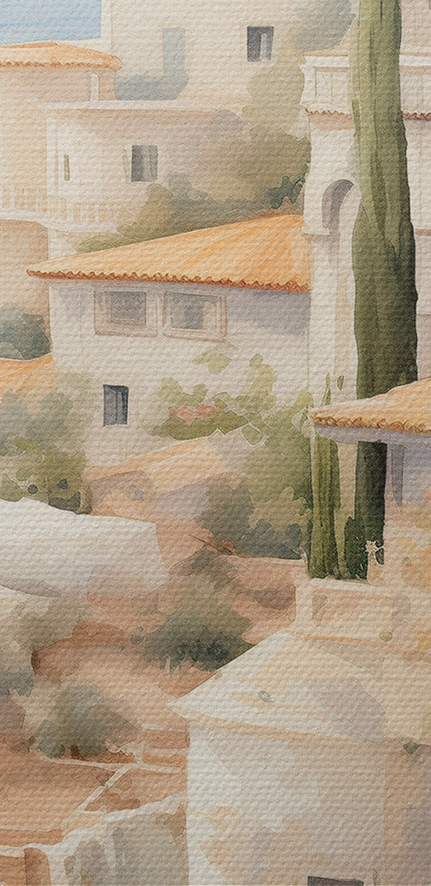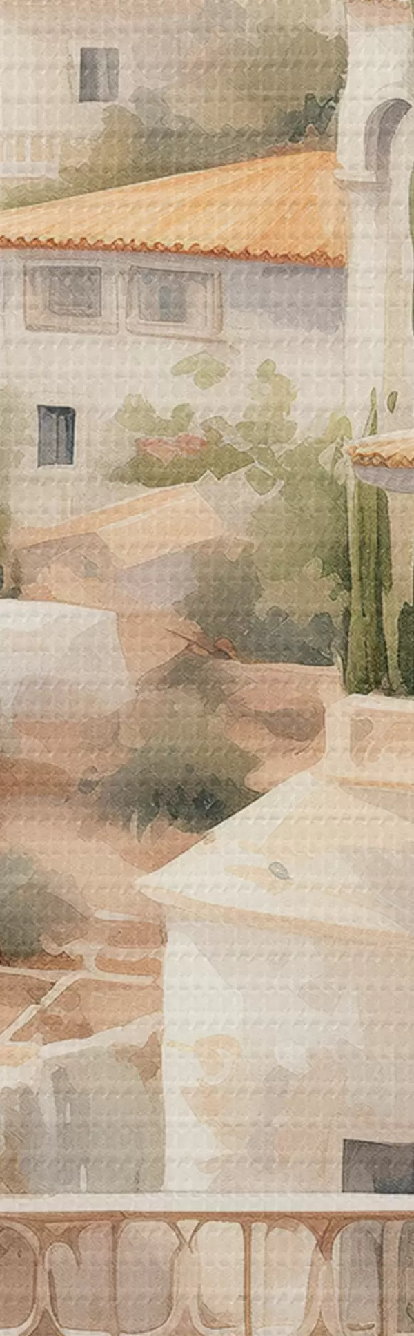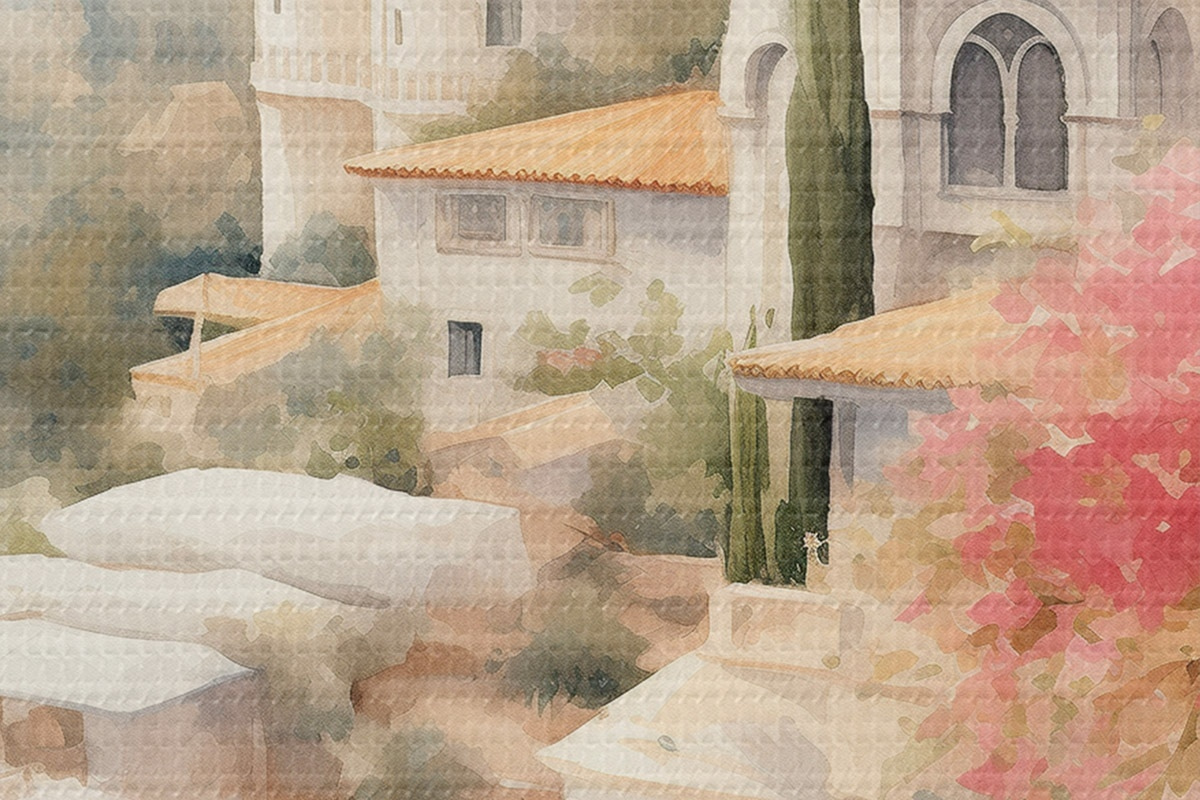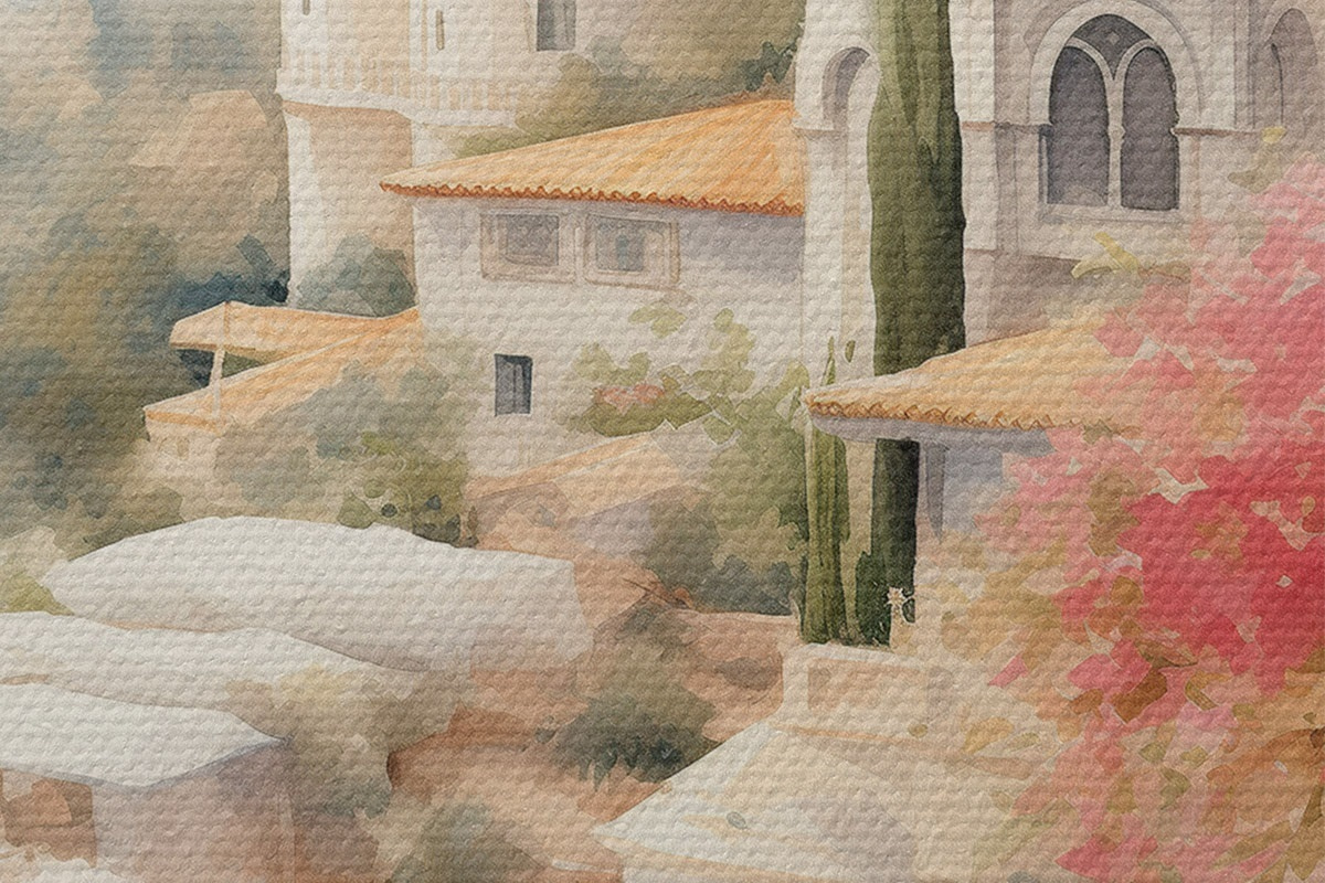 Nuotrauka Ispanijos vasaros kraštovaizdis, Viduržemio jūros regiono architektūra, akvarelės stilius Nr r43181