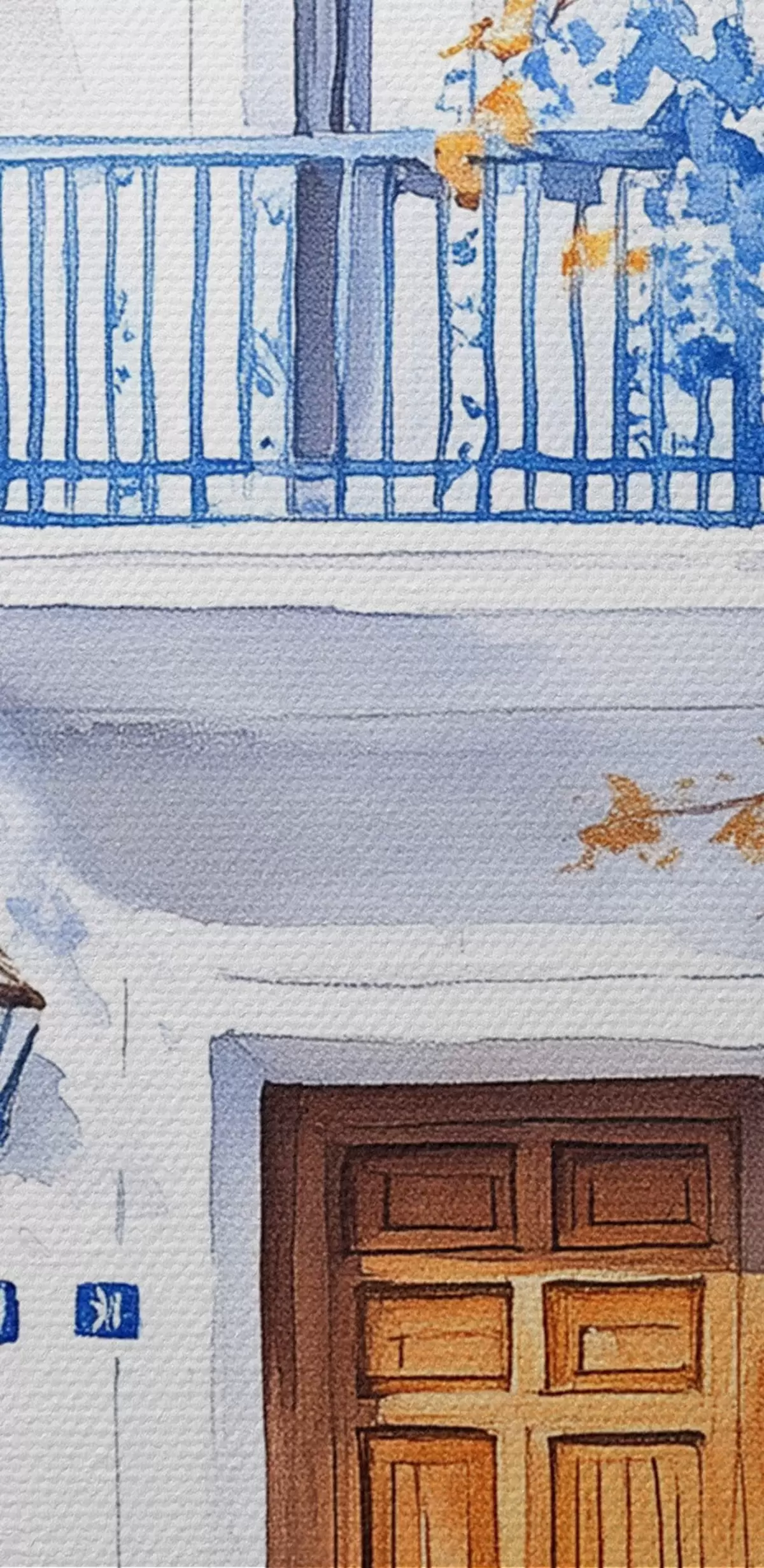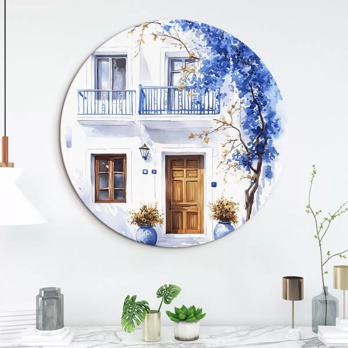Nuotrauka Žydintis medis su mėlynomis gėlėmis, baltas namas, Graikija, akvarelės stilius Nr r43183