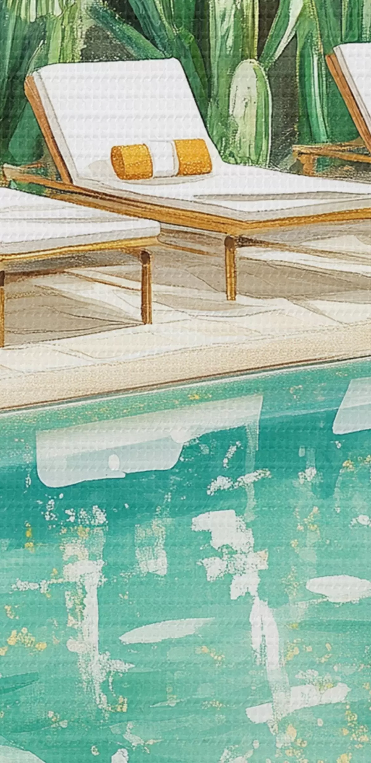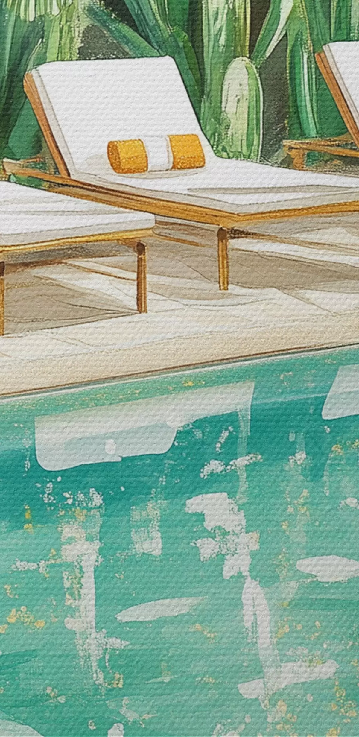 Nuotrauka Atogrąžų gamta, sodas, vasaros baseinas, banglenčių sportas, akvarelės stilius Nr r43190