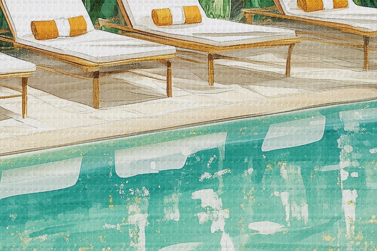 Nuotrauka Atogrąžų gamta, sodas, vasaros baseinas, banglenčių sportas, akvarelės stilius Nr r43190