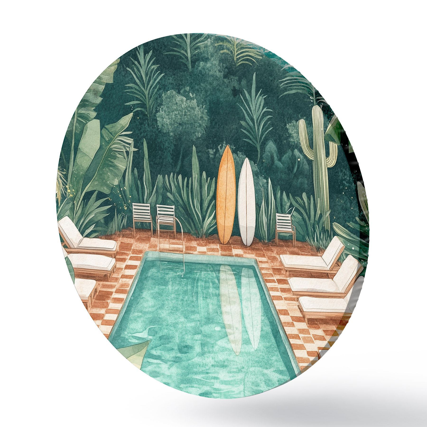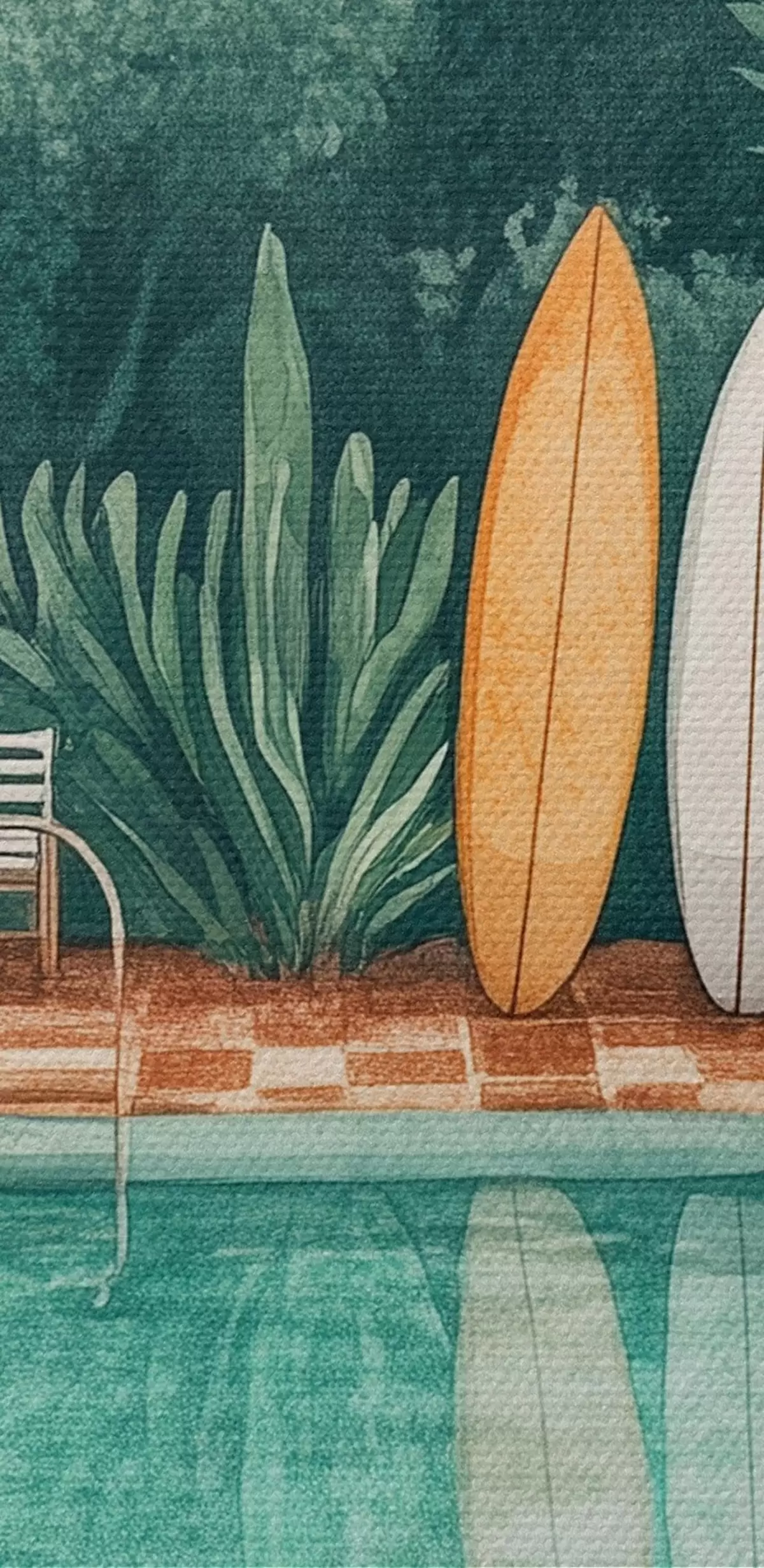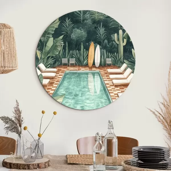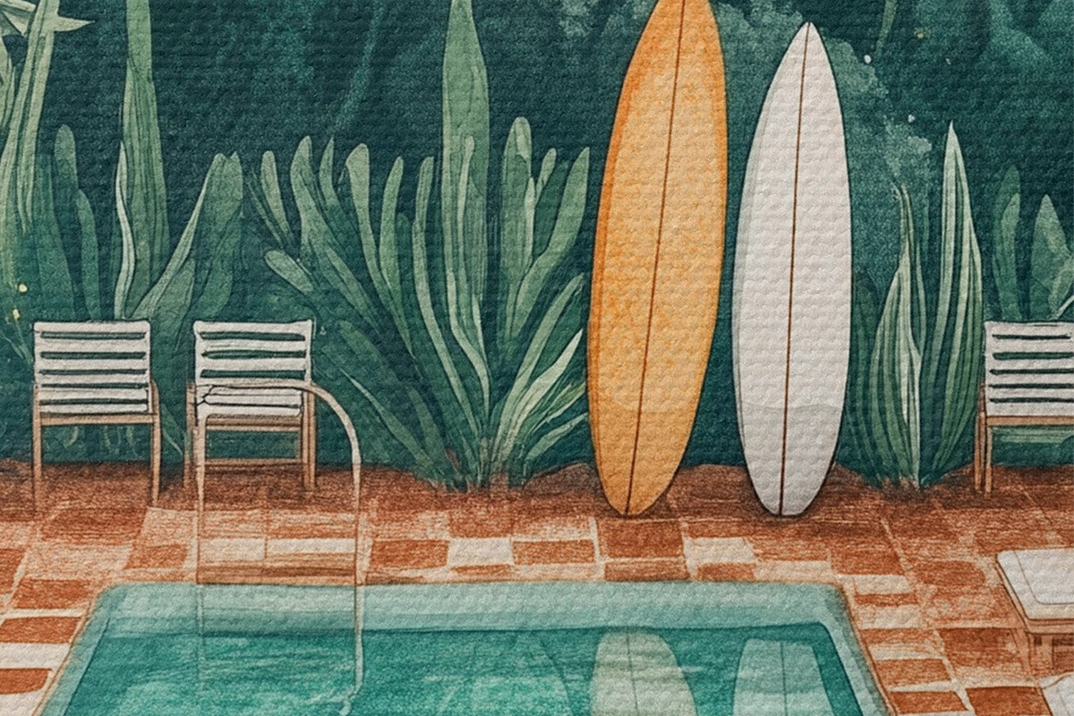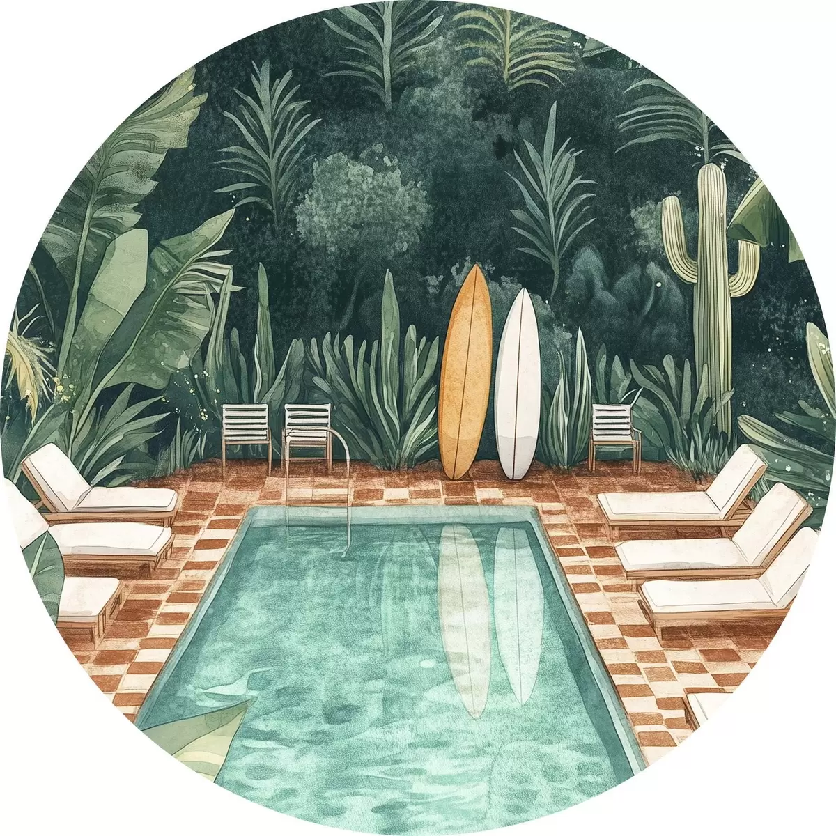 Nuotrauka Senovinis vasaros baseinas, atogrąžų miškas, žaluma, palmės, akvarelės stilius Nr r43191