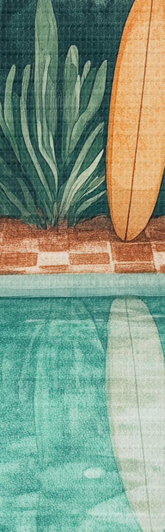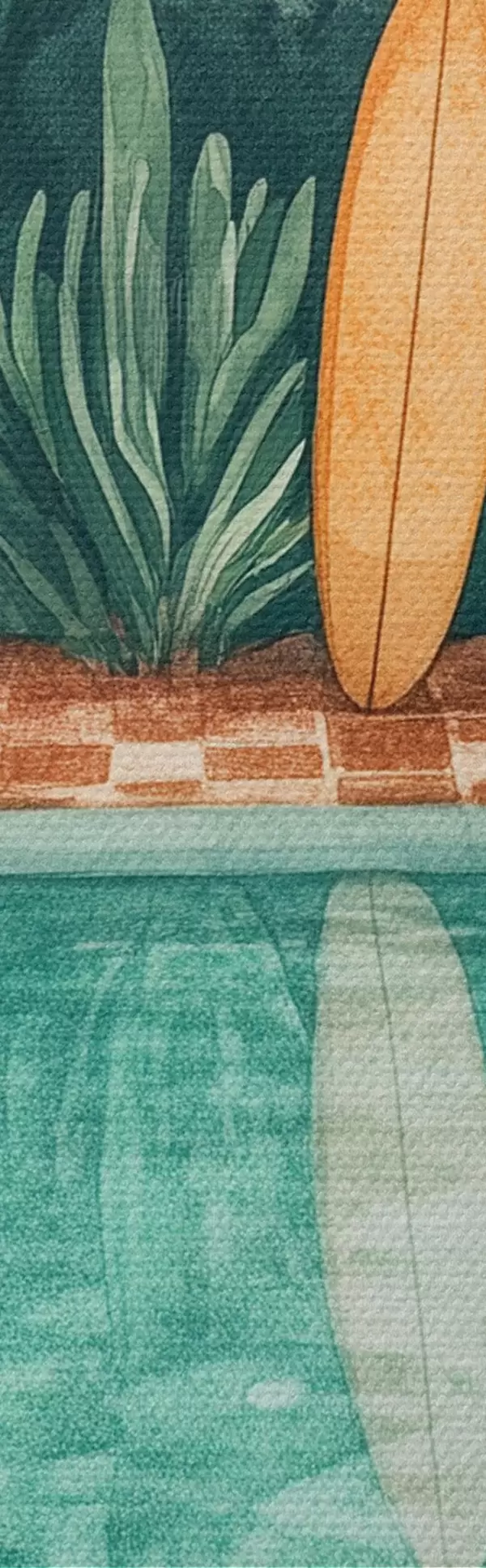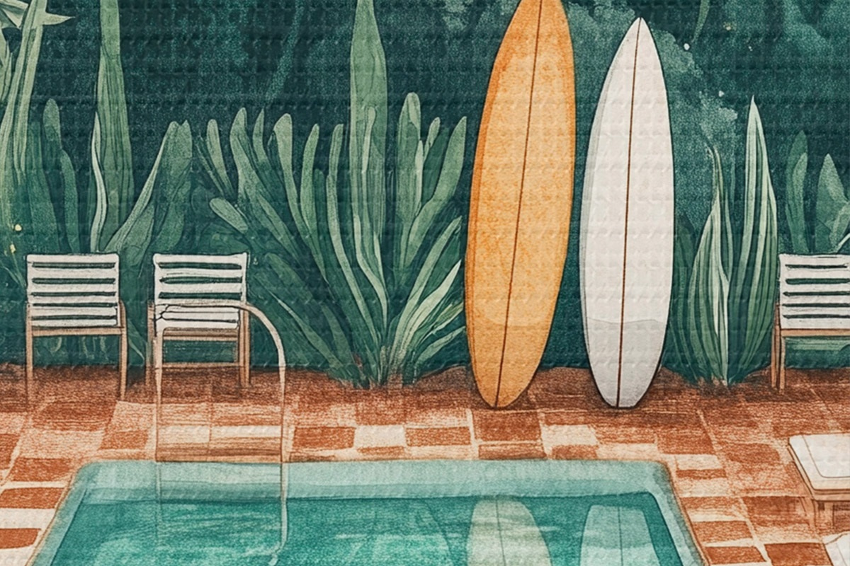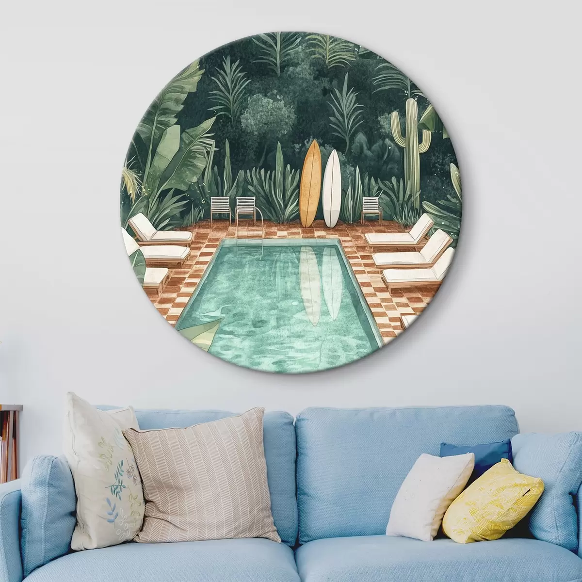 Nuotrauka Senovinis vasaros baseinas, atogrąžų miškas, žaluma, palmės, akvarelės stilius Nr r43191