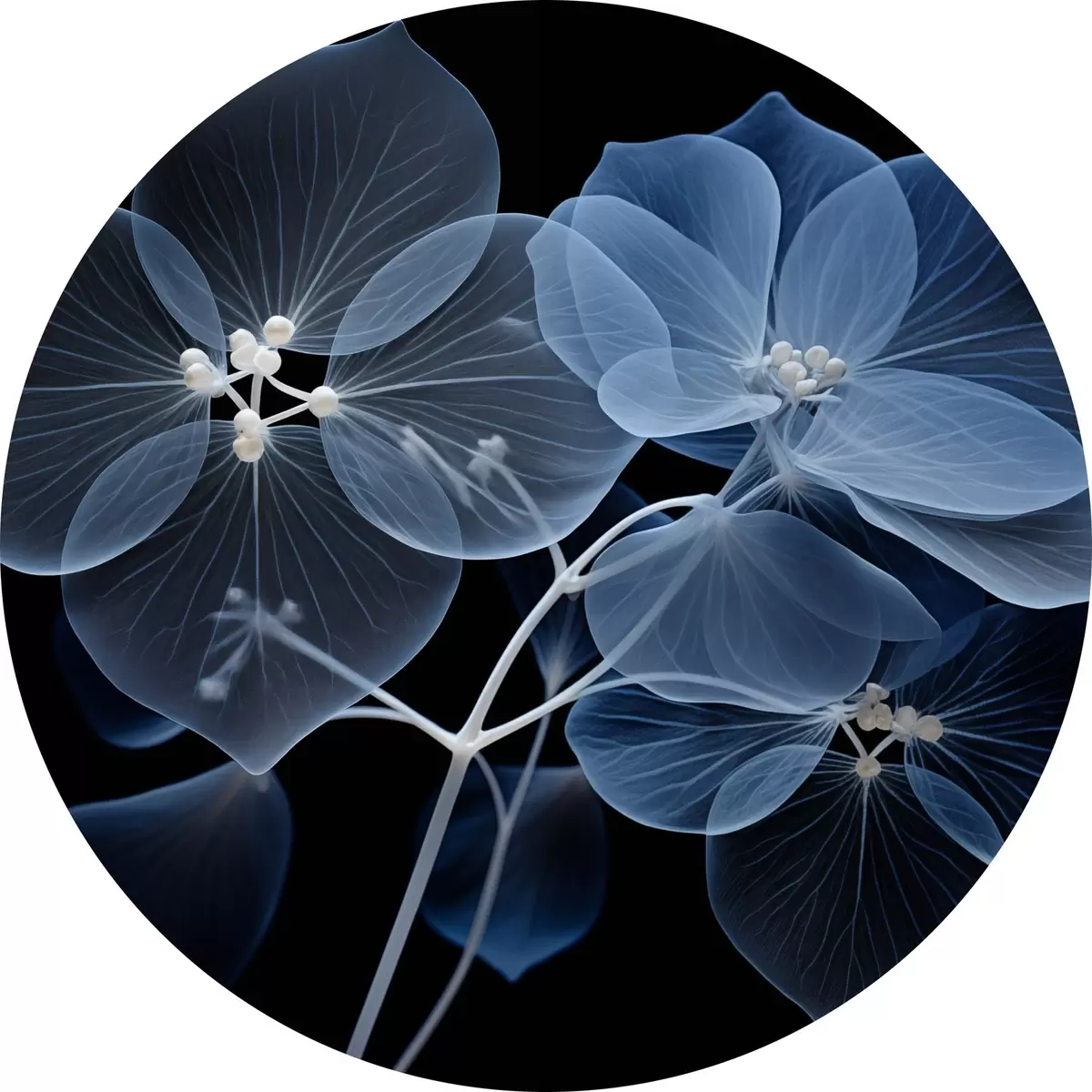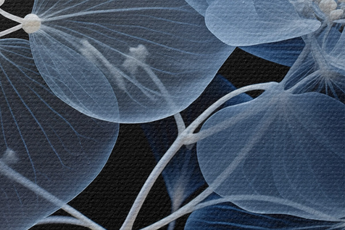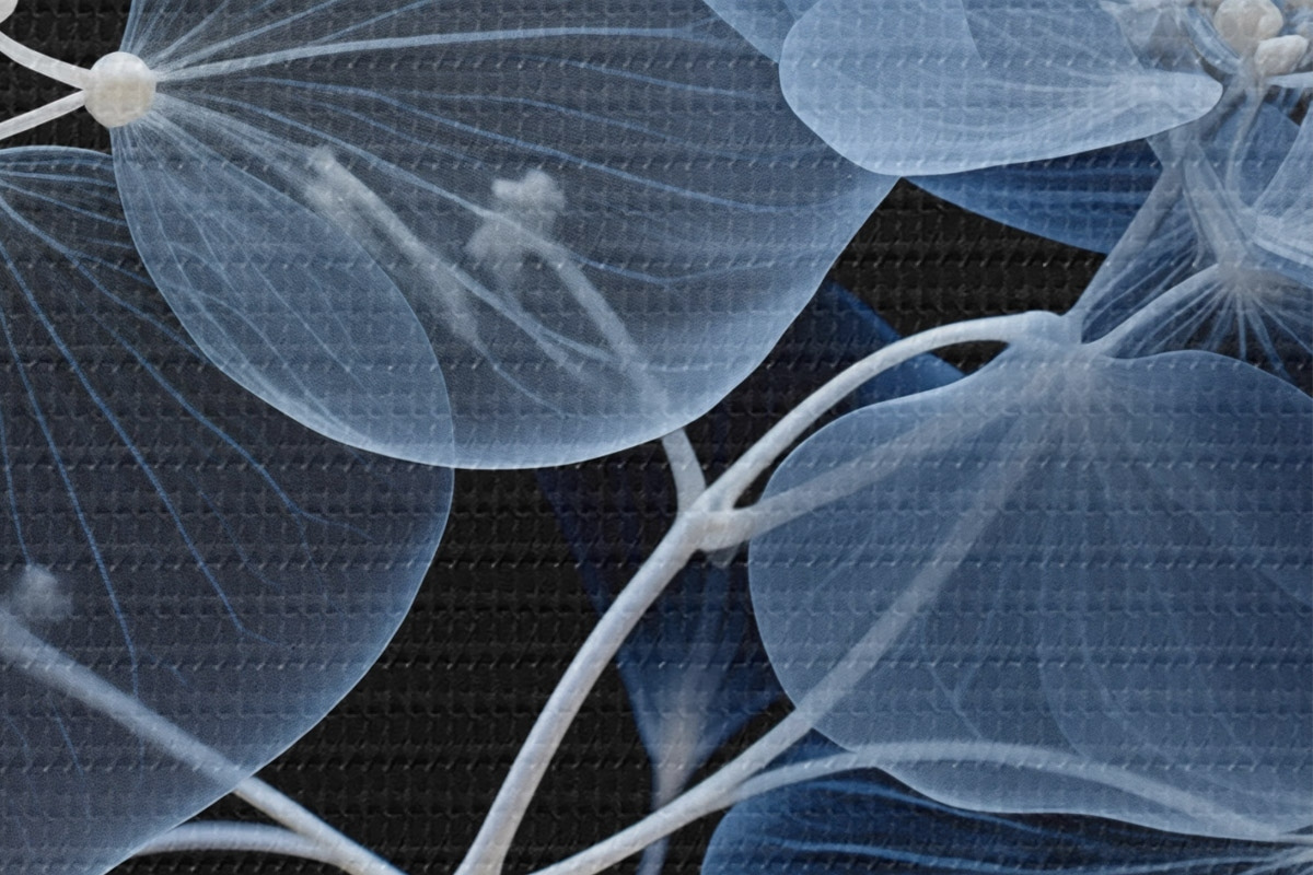 Nuotrauka Permatomas mėlynas hortenzijos žiedas su mėlynais erškėčiais ir švelniu stiebeliu juodame fone Nr r43395