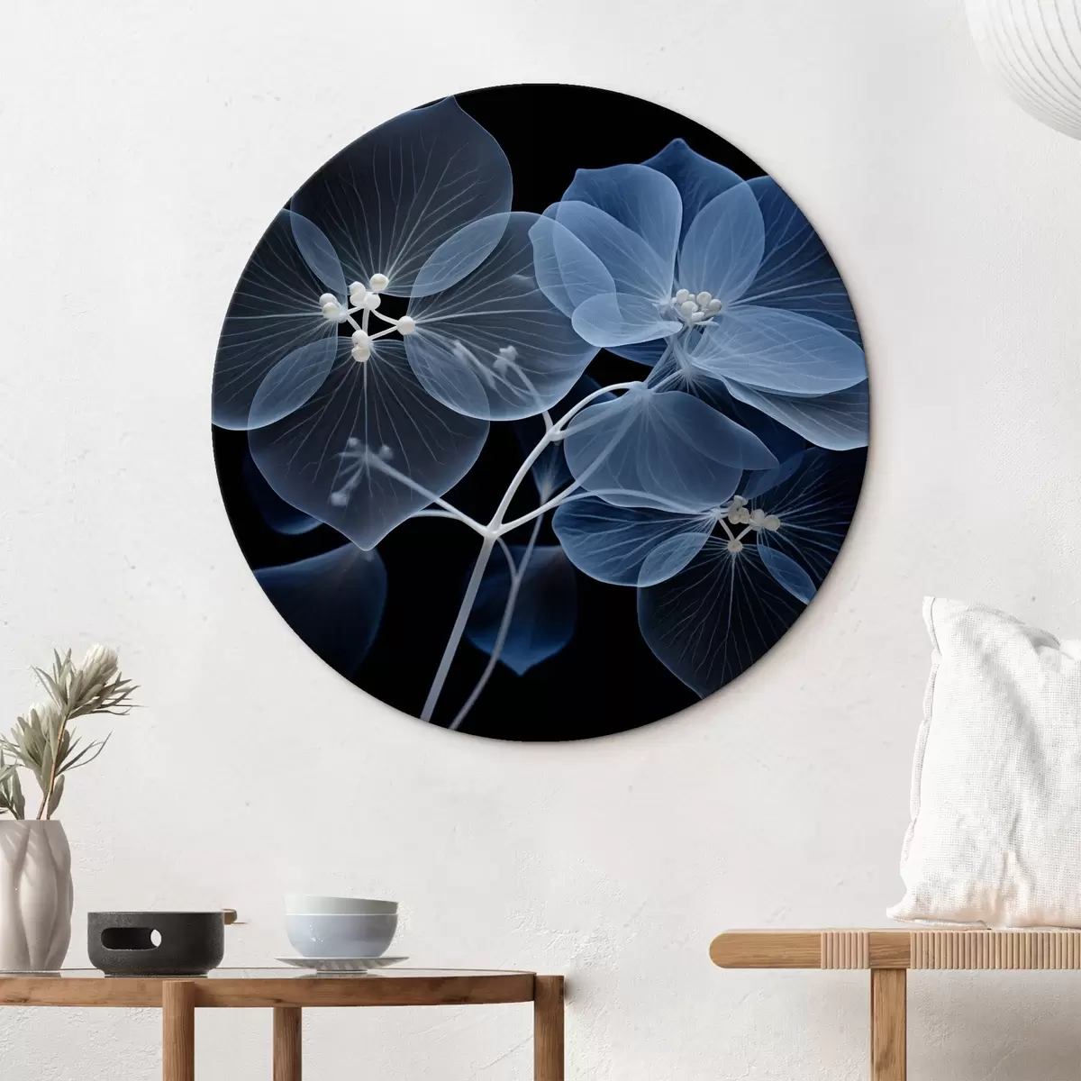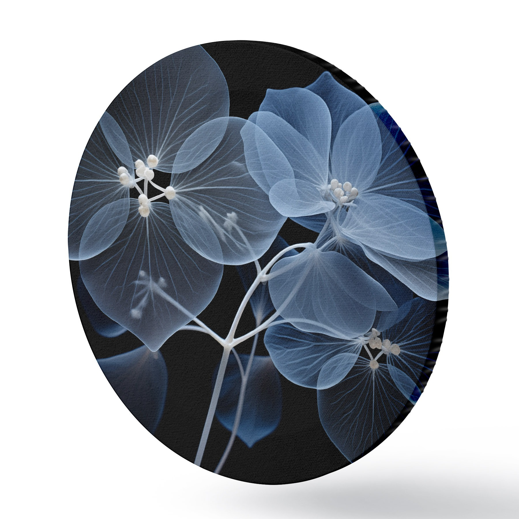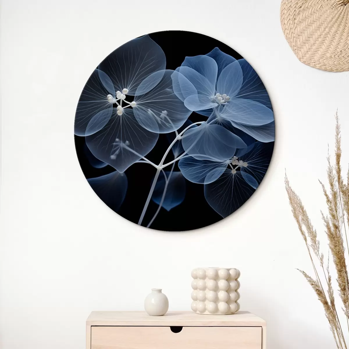 Nuotrauka Permatomas mėlynas hortenzijos žiedas su mėlynais erškėčiais ir švelniu stiebeliu juodame fone Nr r43395