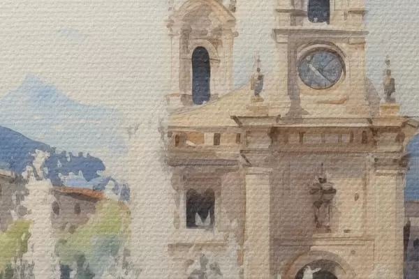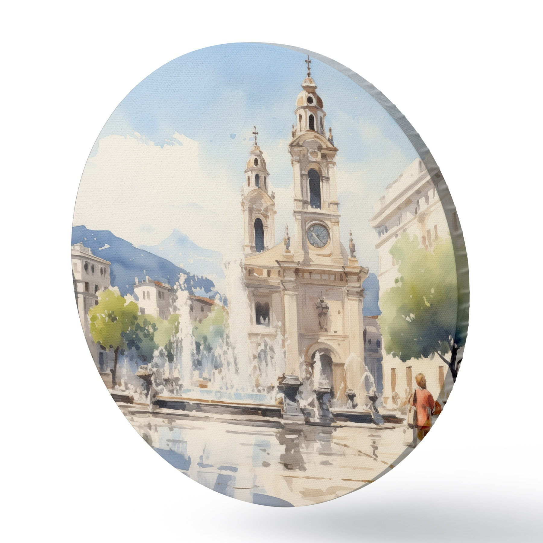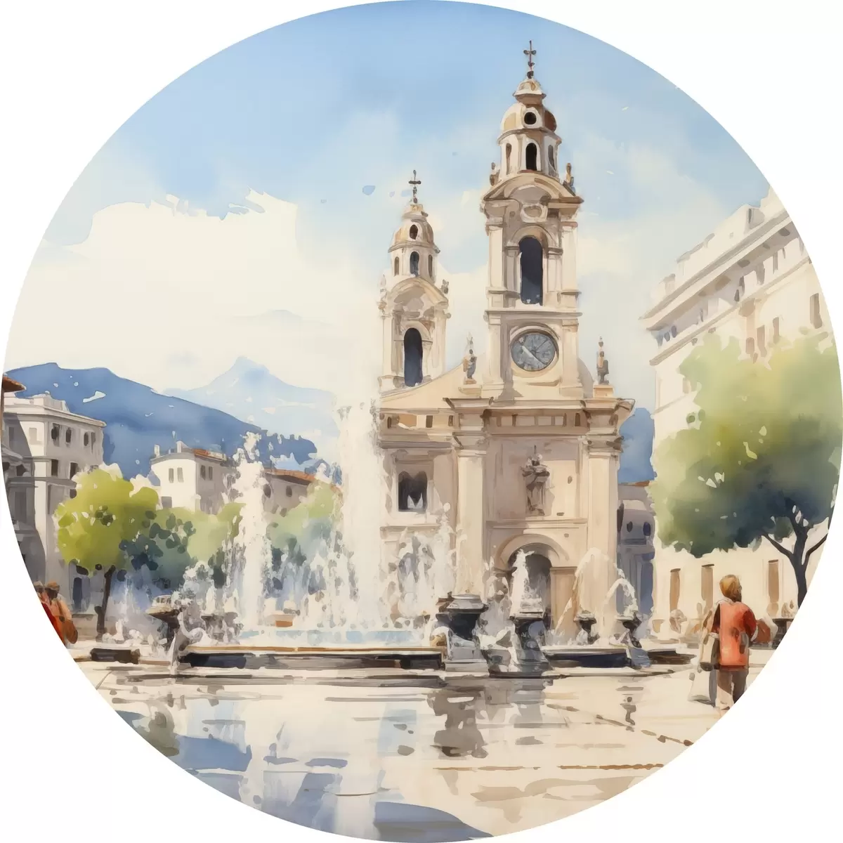 Nuotrauka Abstraktus miesto peizažas su bokštu ir fontanu miesto aikštėje, kalnai tolumoje, akvarelės stilius Nr r43397