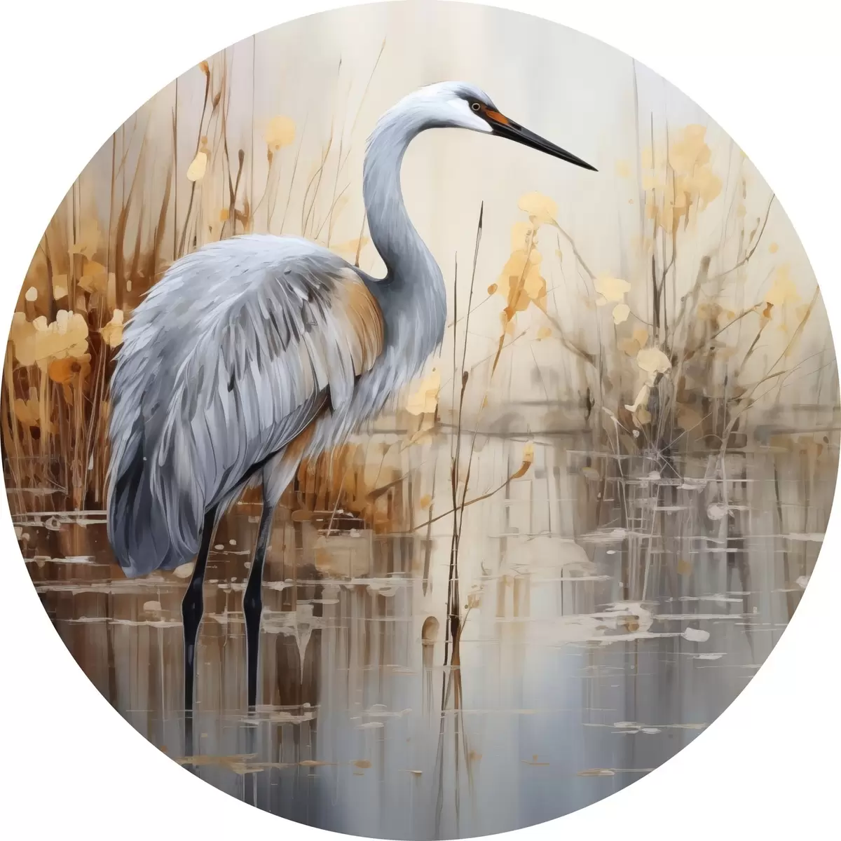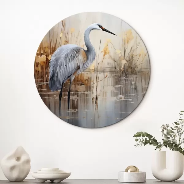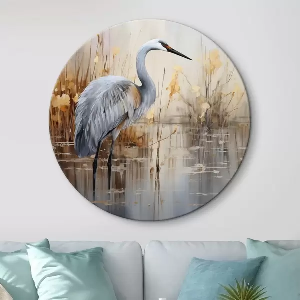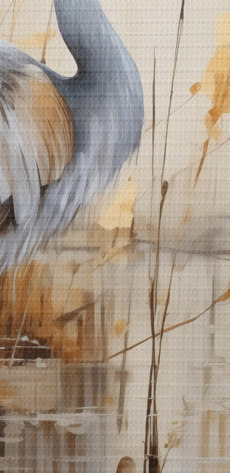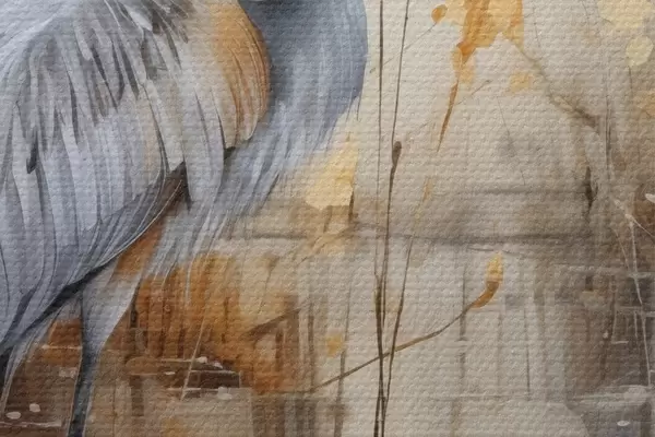 Nuotrauka Pilkasis garnys stovi tvenkinyje, apsuptas aukštų plonų augalų, fonas - švelnus smėlio ir baltos spalvos derinys Nr r43398