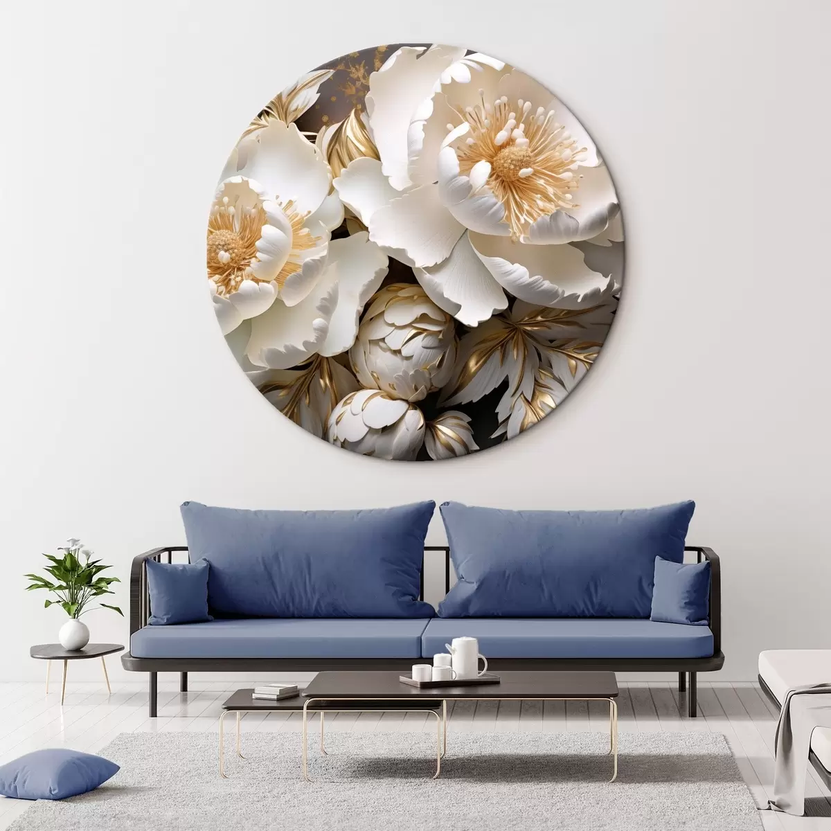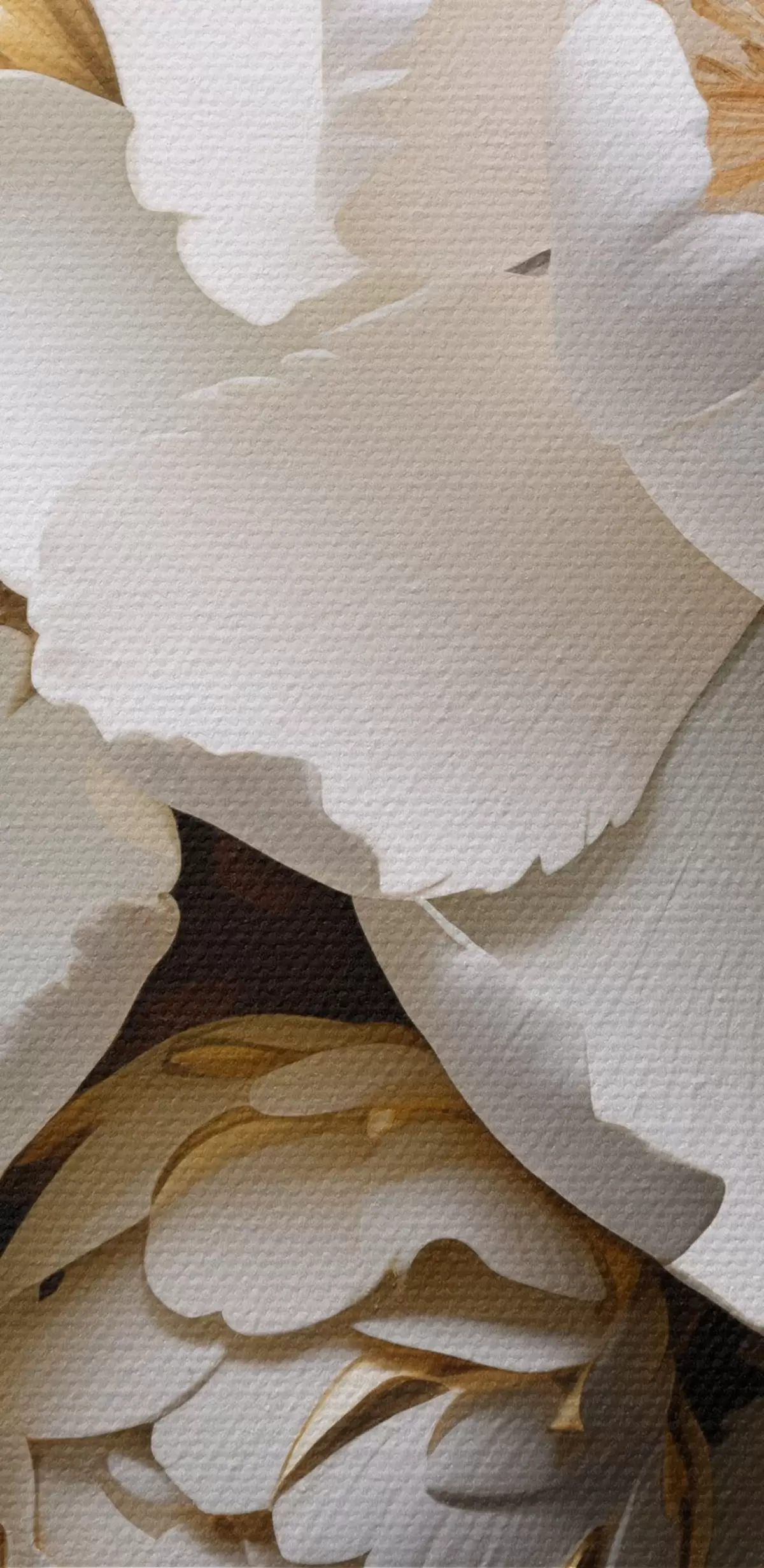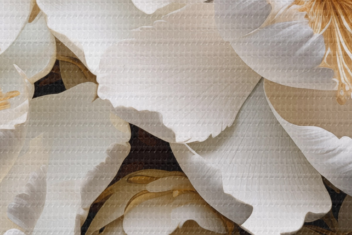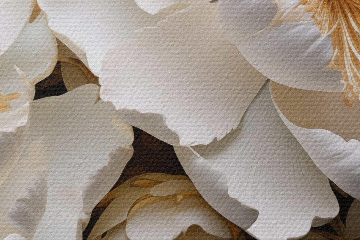 Nuotrauka Balti ir geltoni bijūnai su lapais, sudėtingos detalės, dekoratyvinis menas, tamsus fonas Nr r43399