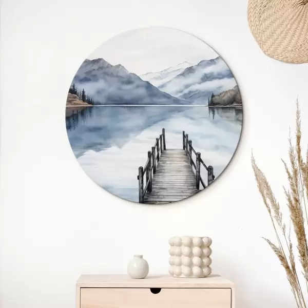 Nuotrauka Akvarelės stiliumi akvarelė - medinis dokas, besidriekiantis į ramų ežerą, apsuptą kalnų ir visžalių medžių Nr r43405