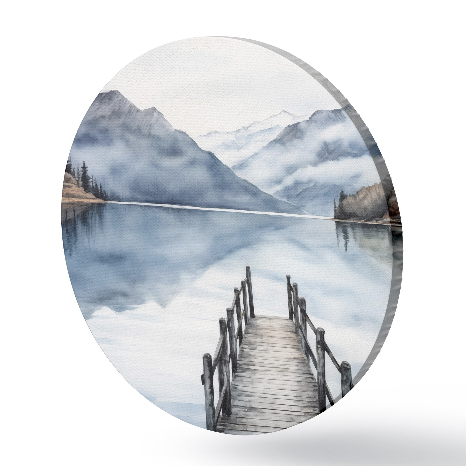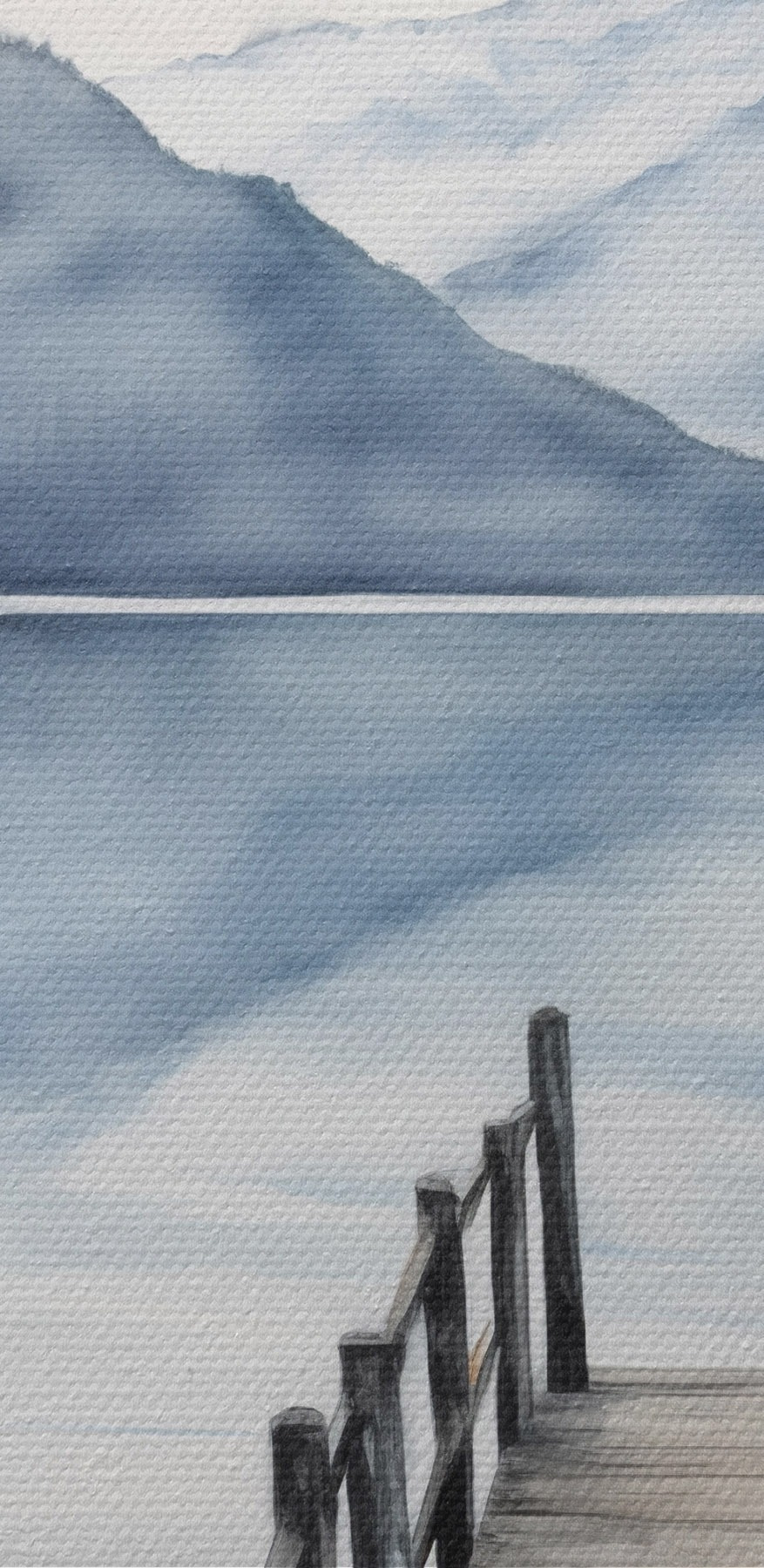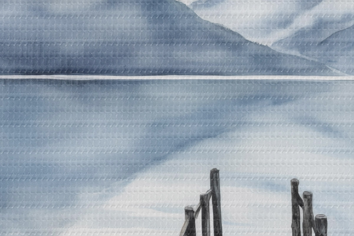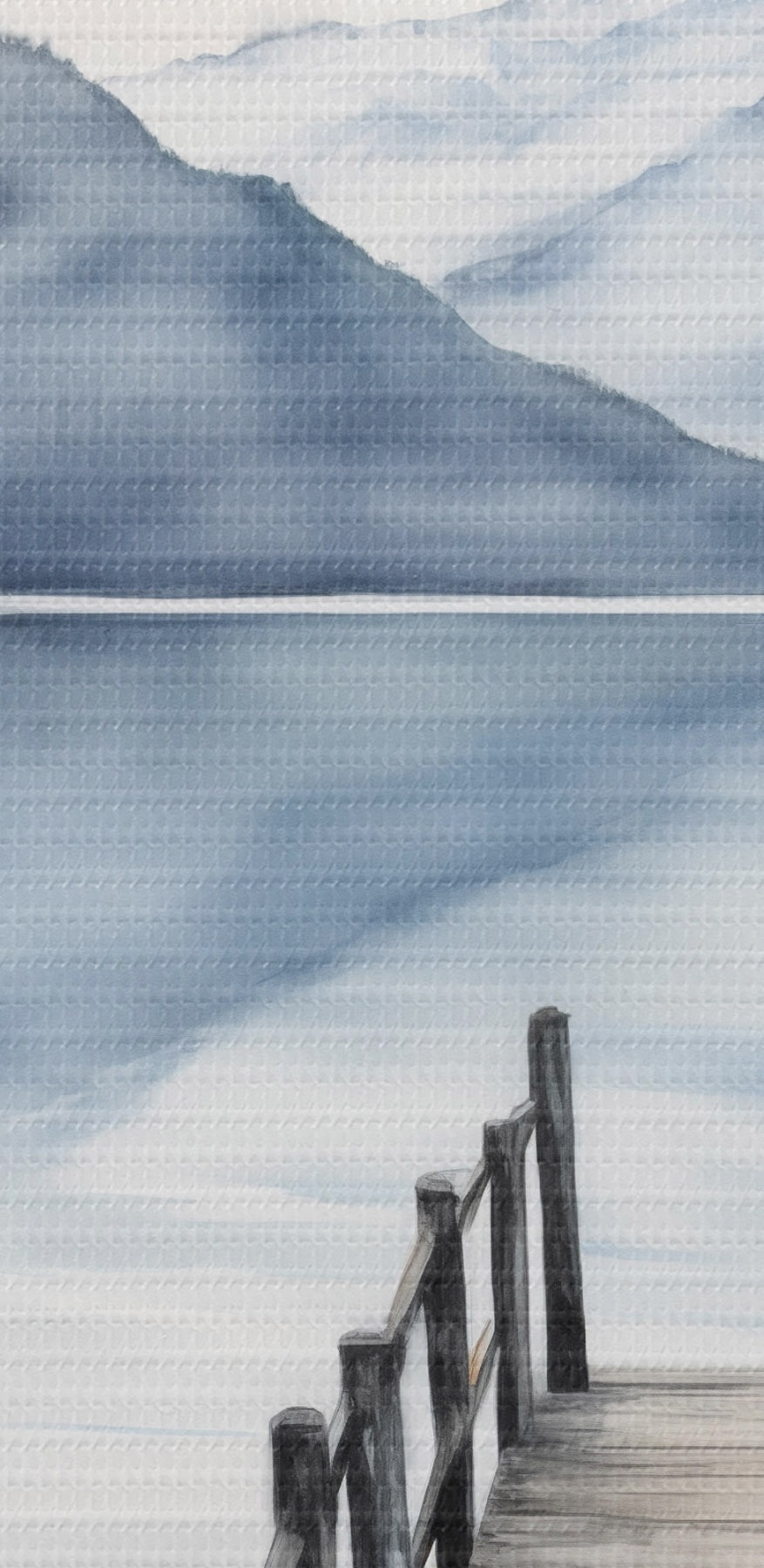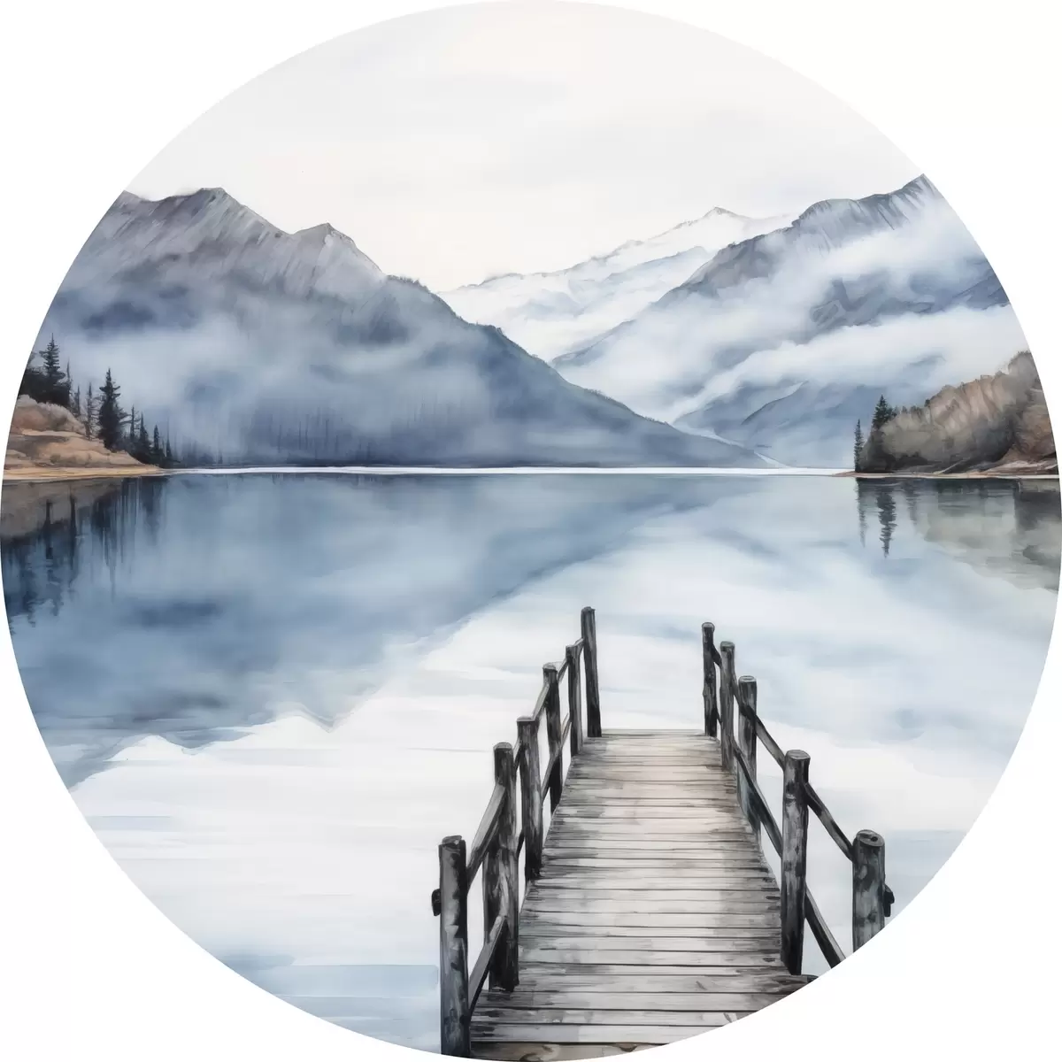 Nuotrauka Akvarelės stiliumi akvarelė - medinis dokas, besidriekiantis į ramų ežerą, apsuptą kalnų ir visžalių medžių Nr r43405