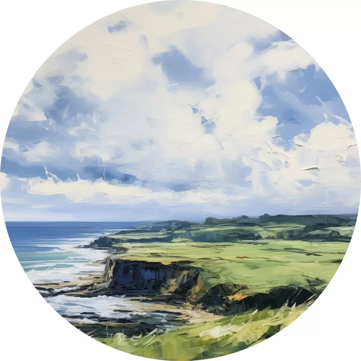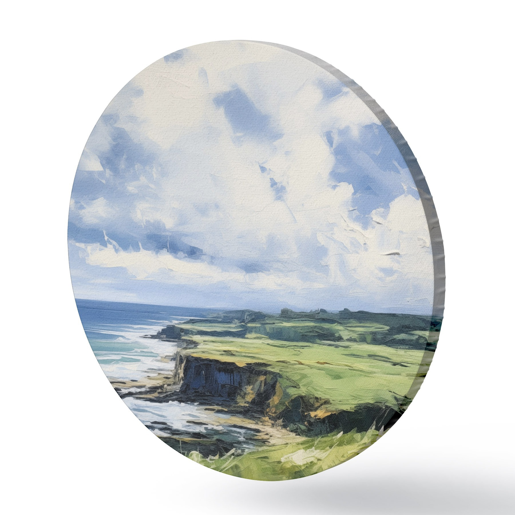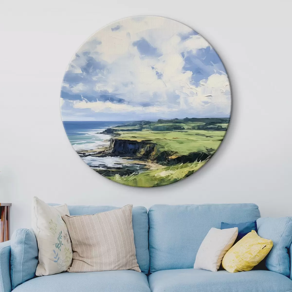 Nuotrauka Žalias laukas su uolos pakrantėje, mėlyna jūra su bangomis, debesuotas dangus, minimalistinis modernus aliejaus tapybai imitacija Nr r43406