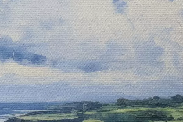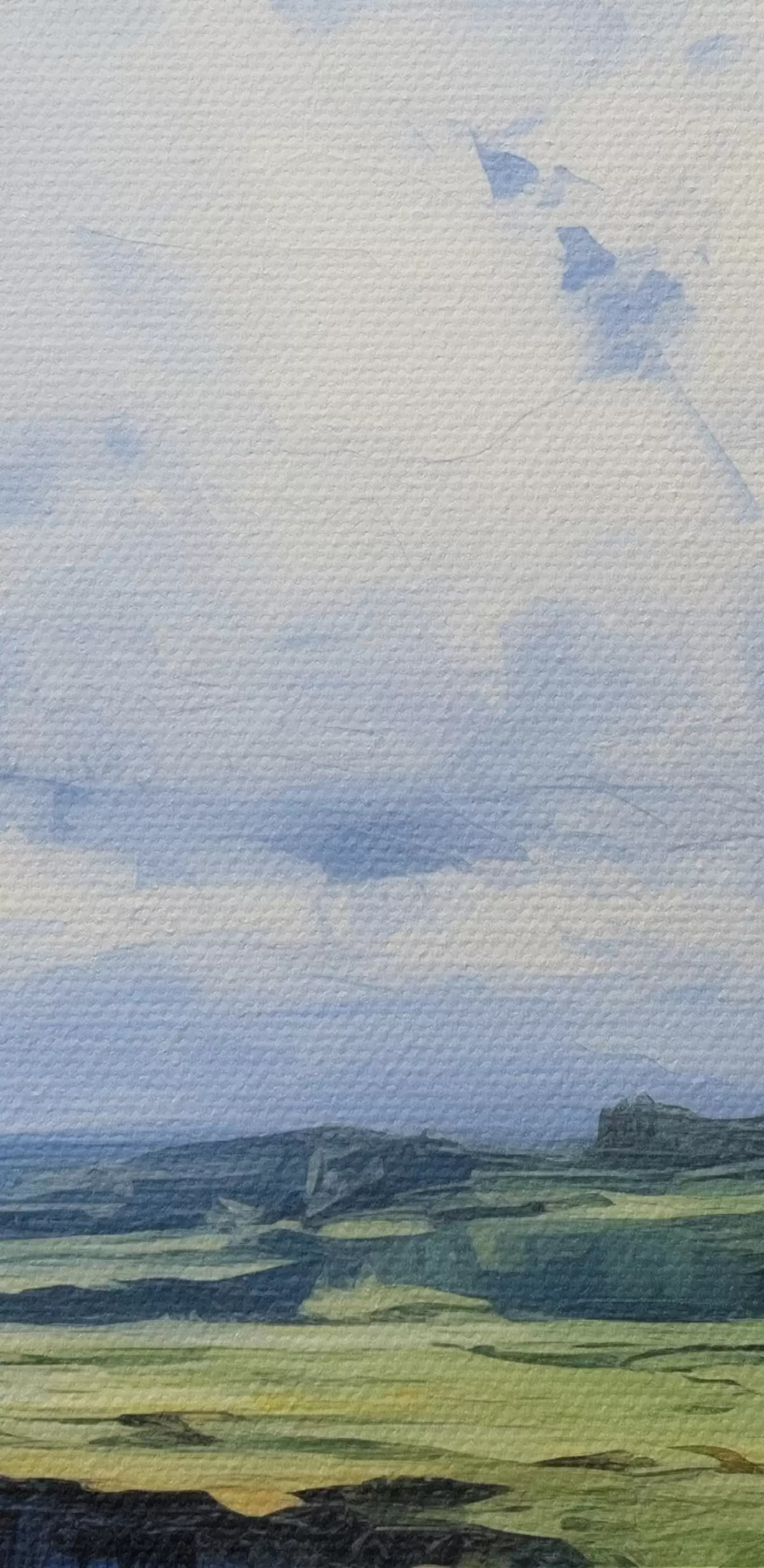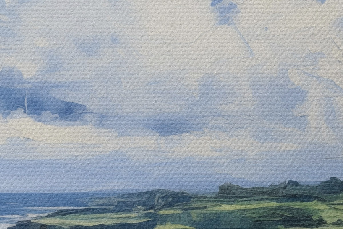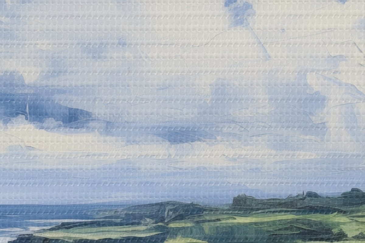 Nuotrauka Žalias laukas su uolos pakrantėje, mėlyna jūra su bangomis, debesuotas dangus, minimalistinis modernus aliejaus tapybai imitacija Nr r43406