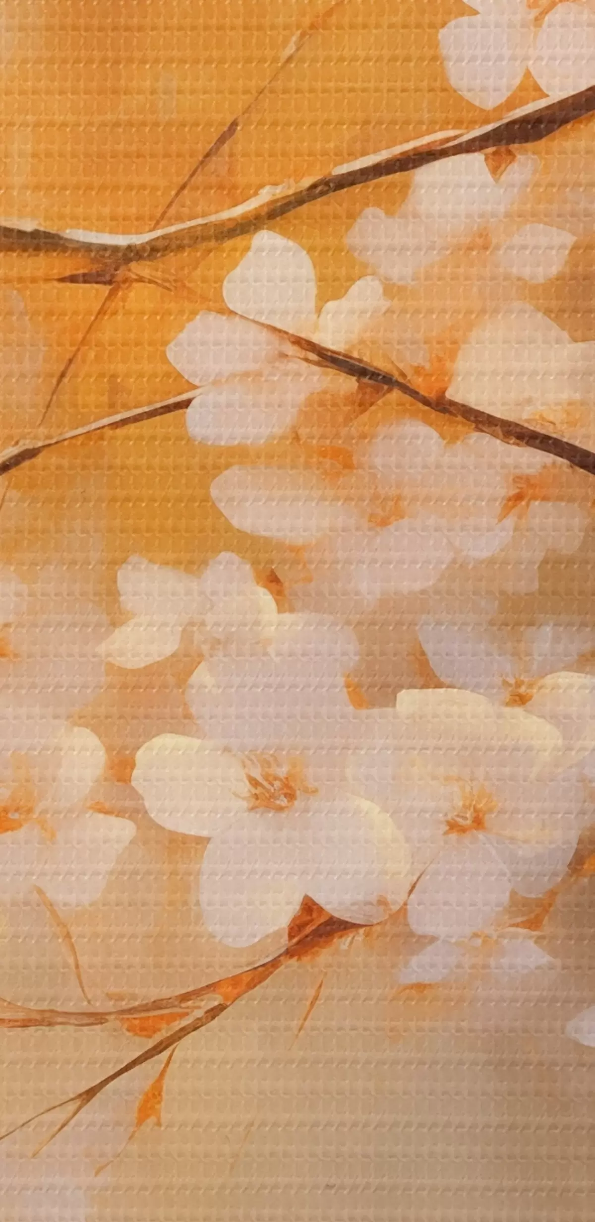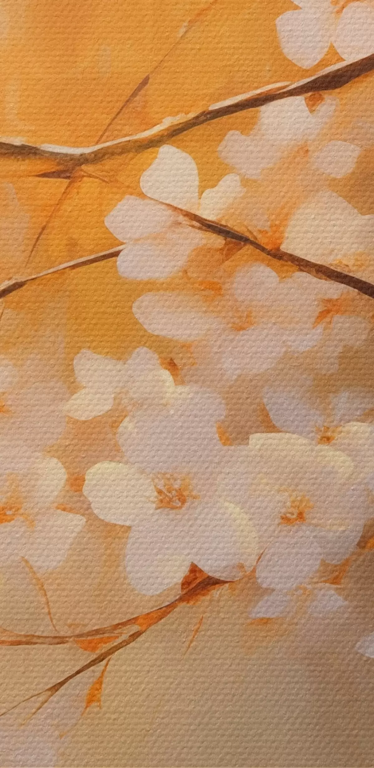 Nuotrauka Vyšnių žiedų šakos su oranžiniais žiedais, šiltų spalvų paletė, neryškiame geltonų atspalvių fone Nr r43407