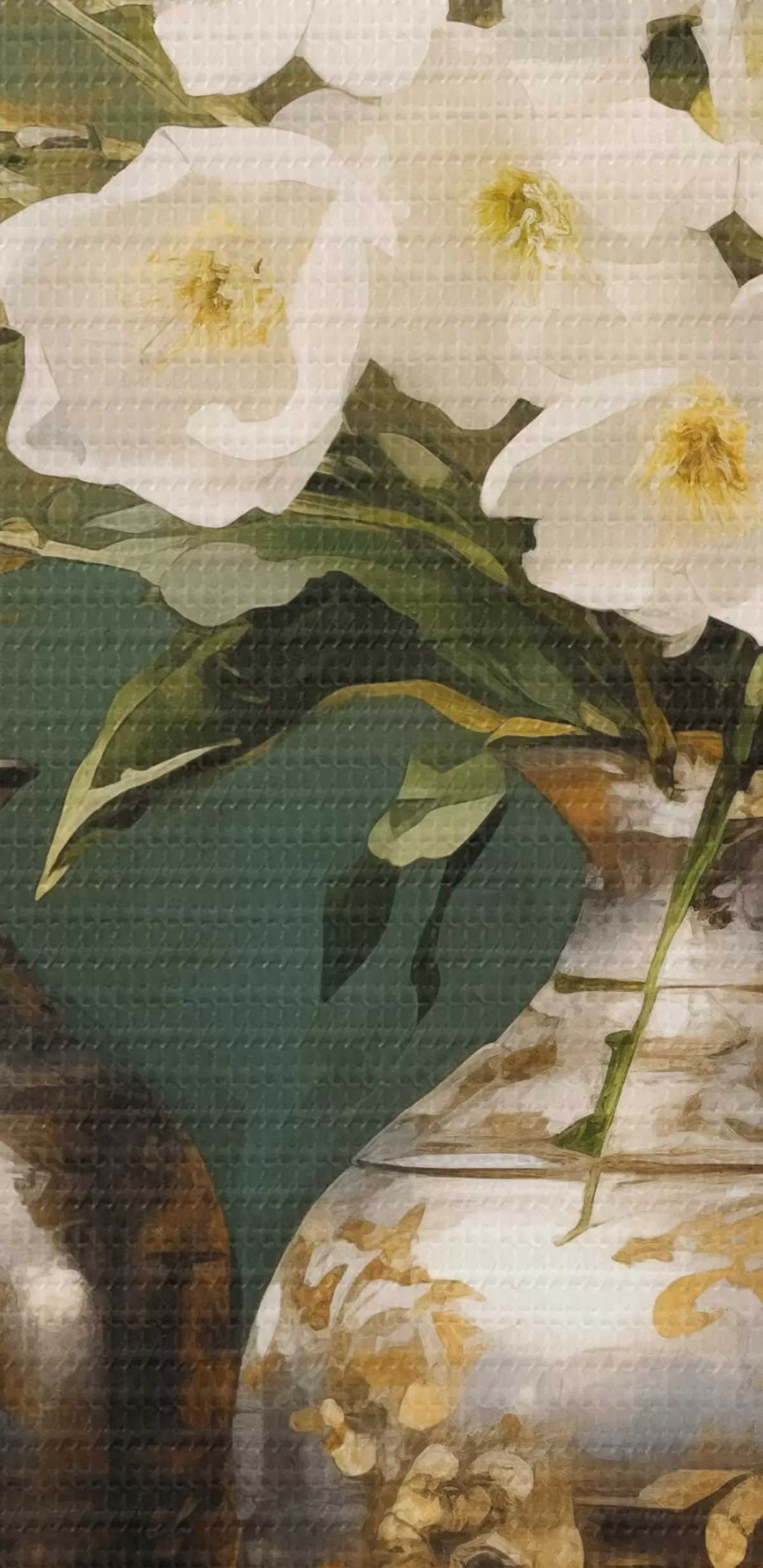 Nuotrauka Baltų gėlių vazoje natiurmortas, dekoratyvinės vazos ir dubuo ant žalio stalo, tamsiai žalias fonas Nr r43408