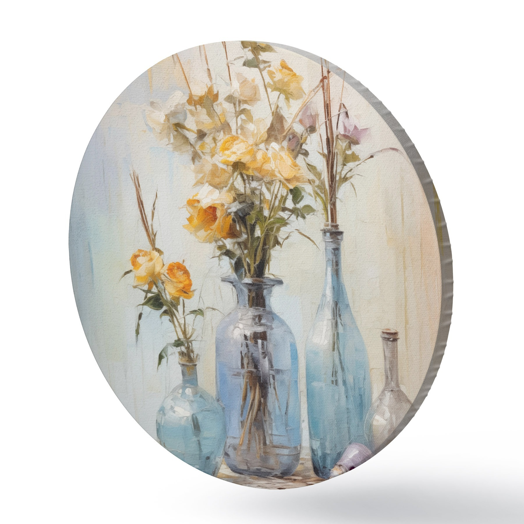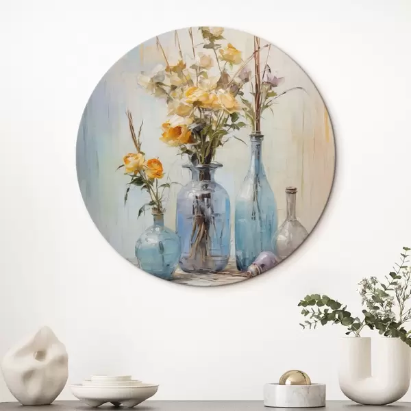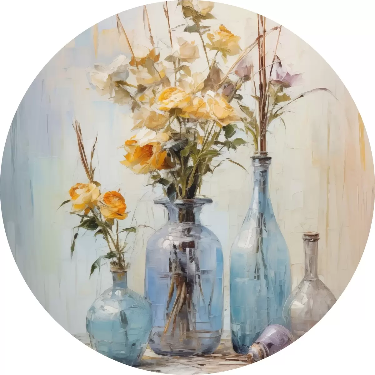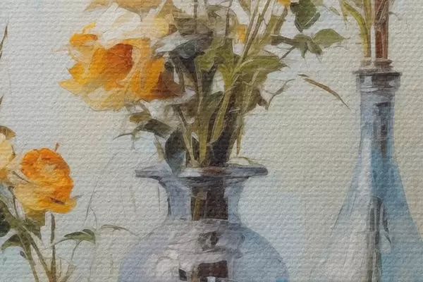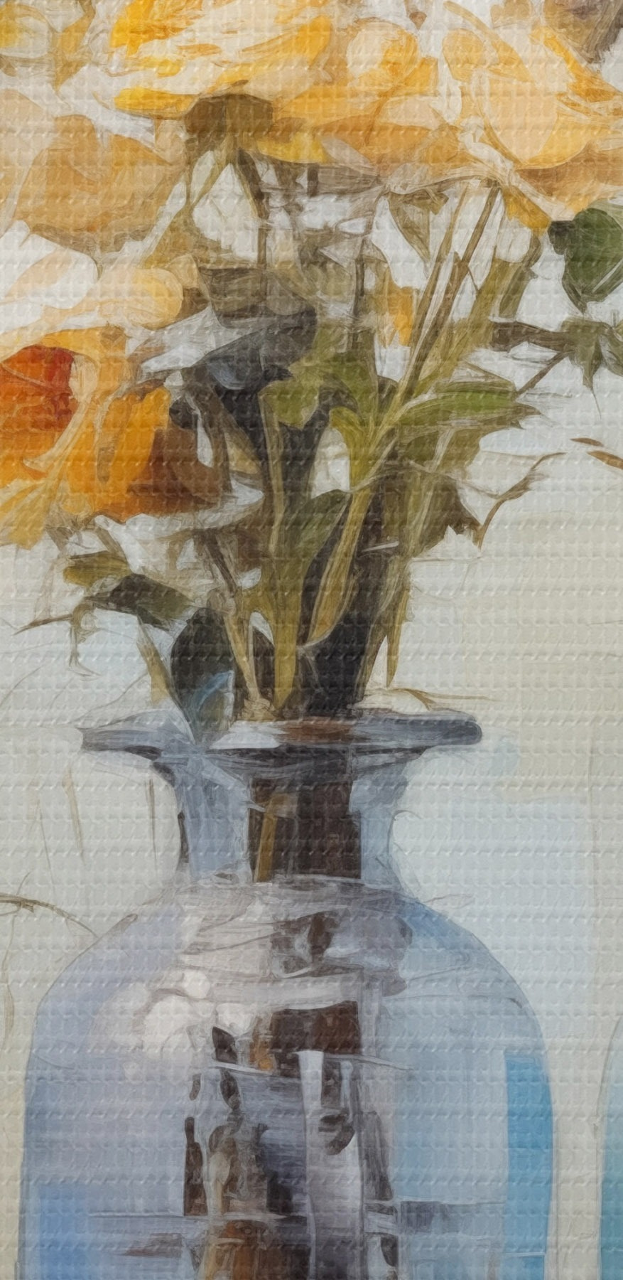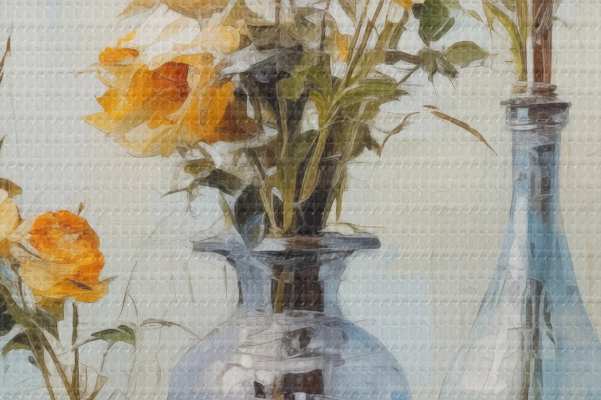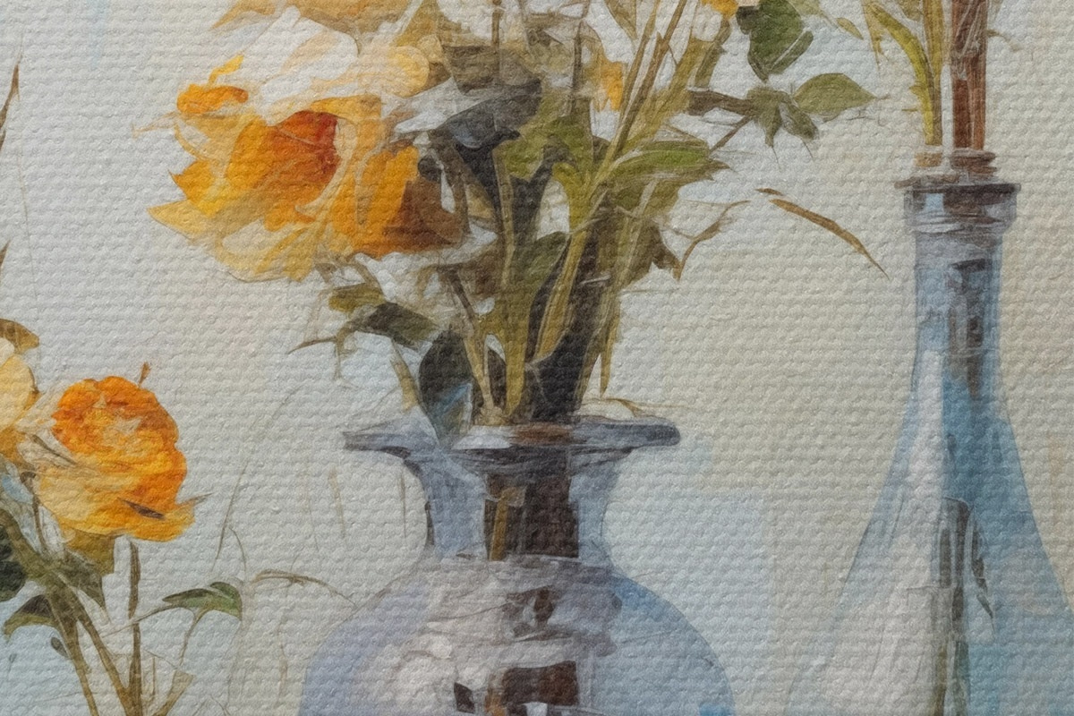Nuotrauka Geltonų rožių natiurmortas mėlynose stiklinėse vazose, lengvos tekstūros fonas, švelnūs teptuko potėpiai, aliejinės tapybos stilius Nr r43409