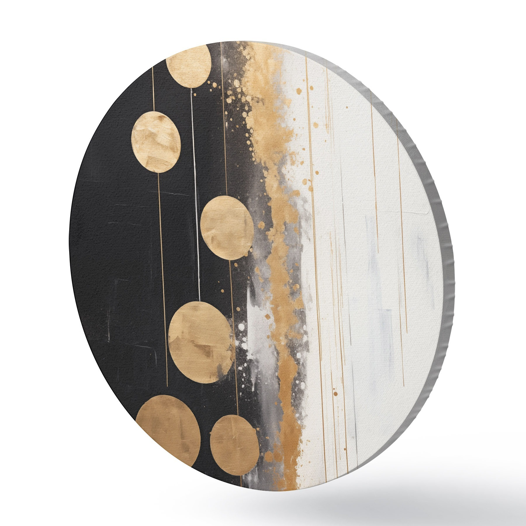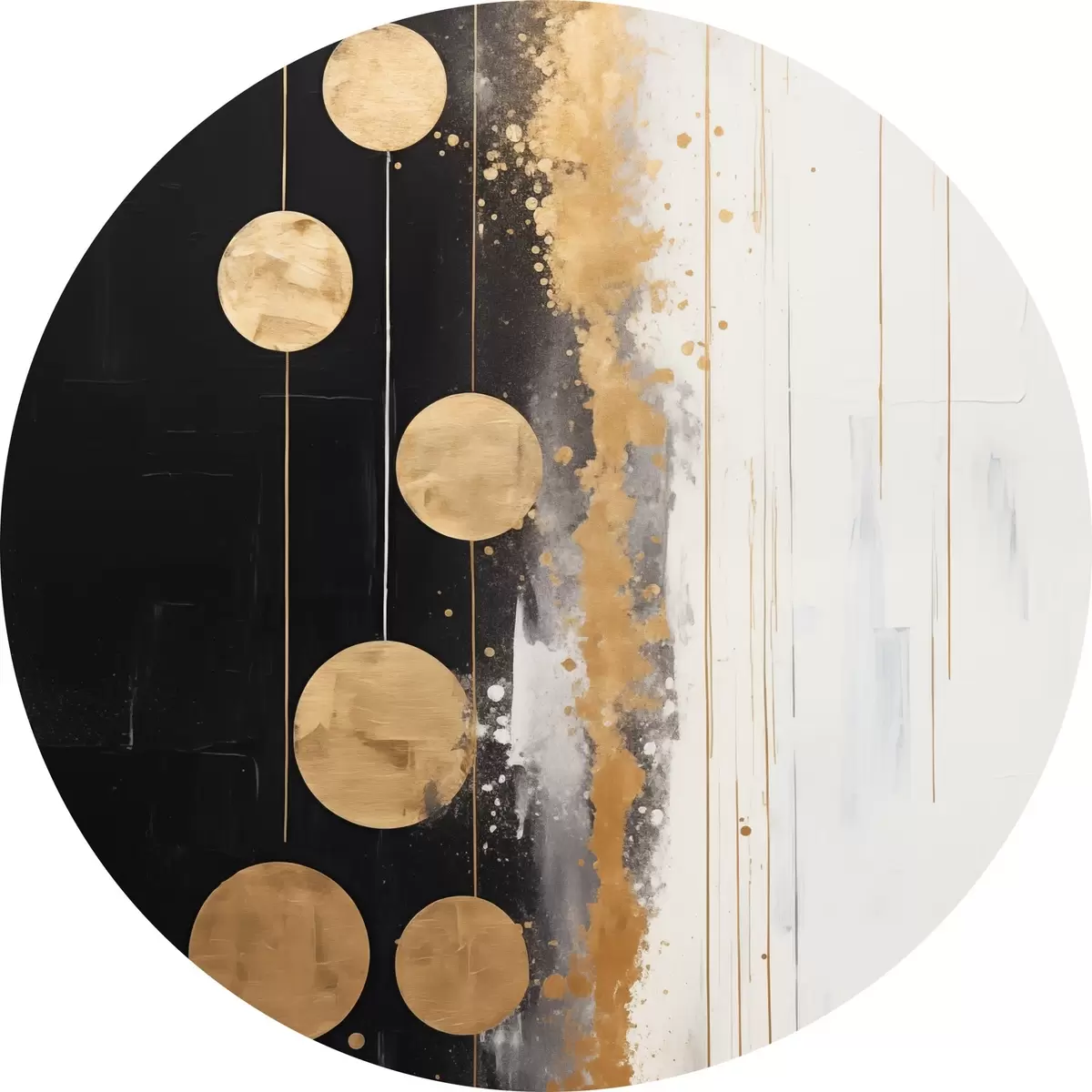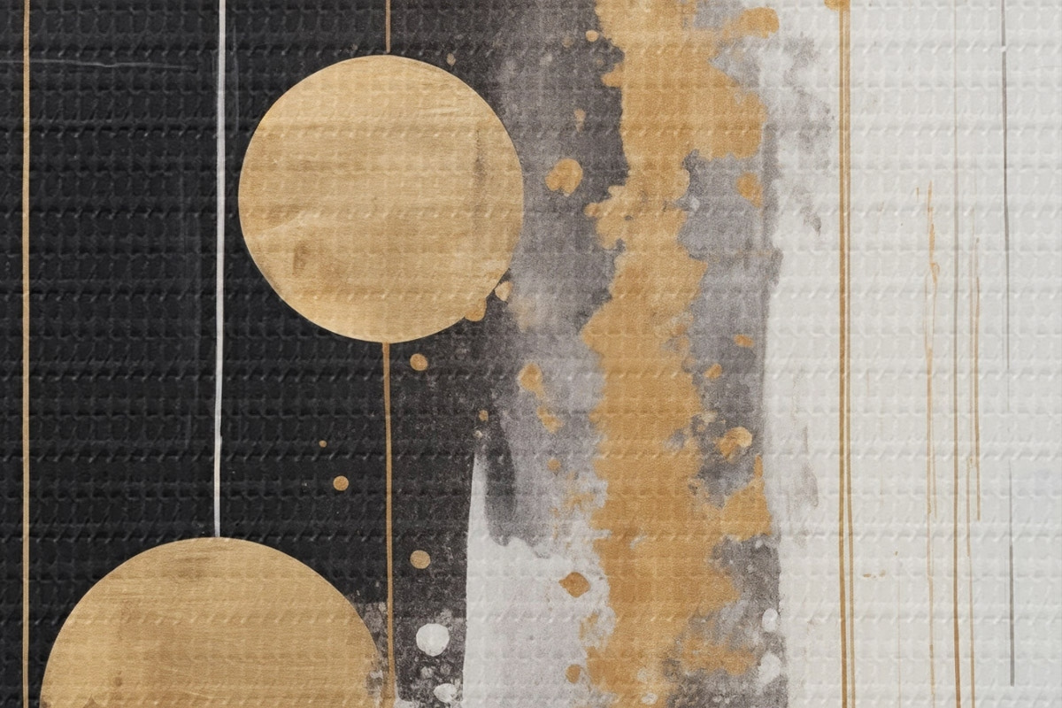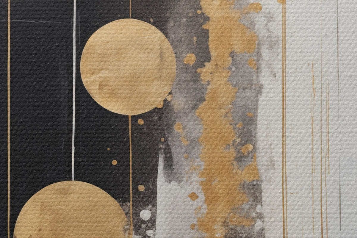 Nuotrauka Abstraktus menas su geltonais apskritimais, kabančiais juodai baltame fone su baltomis ir geltonomis dėmėmis Nr r43410