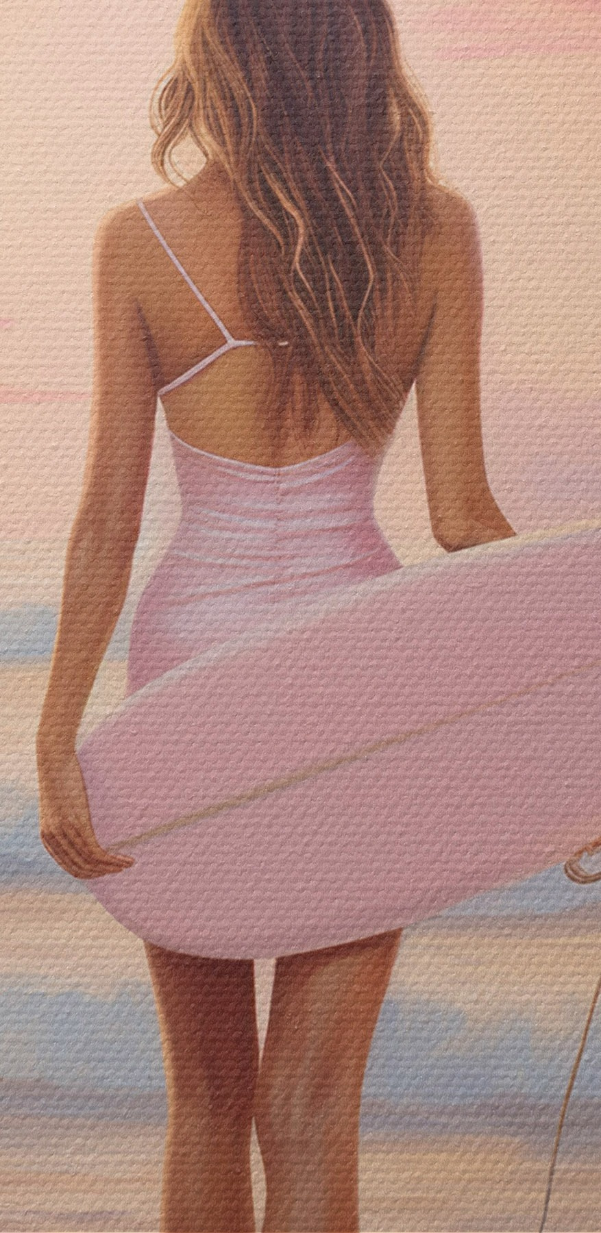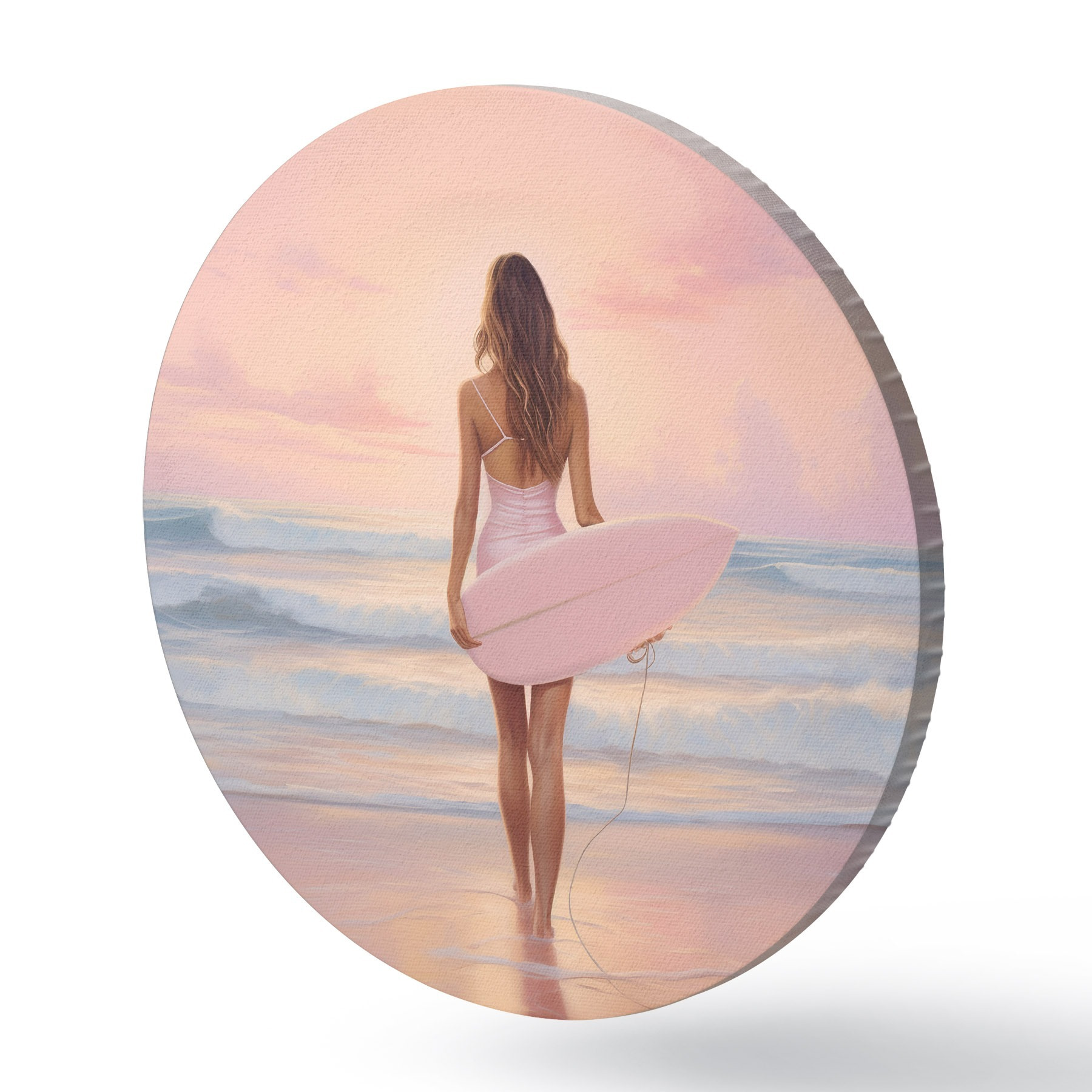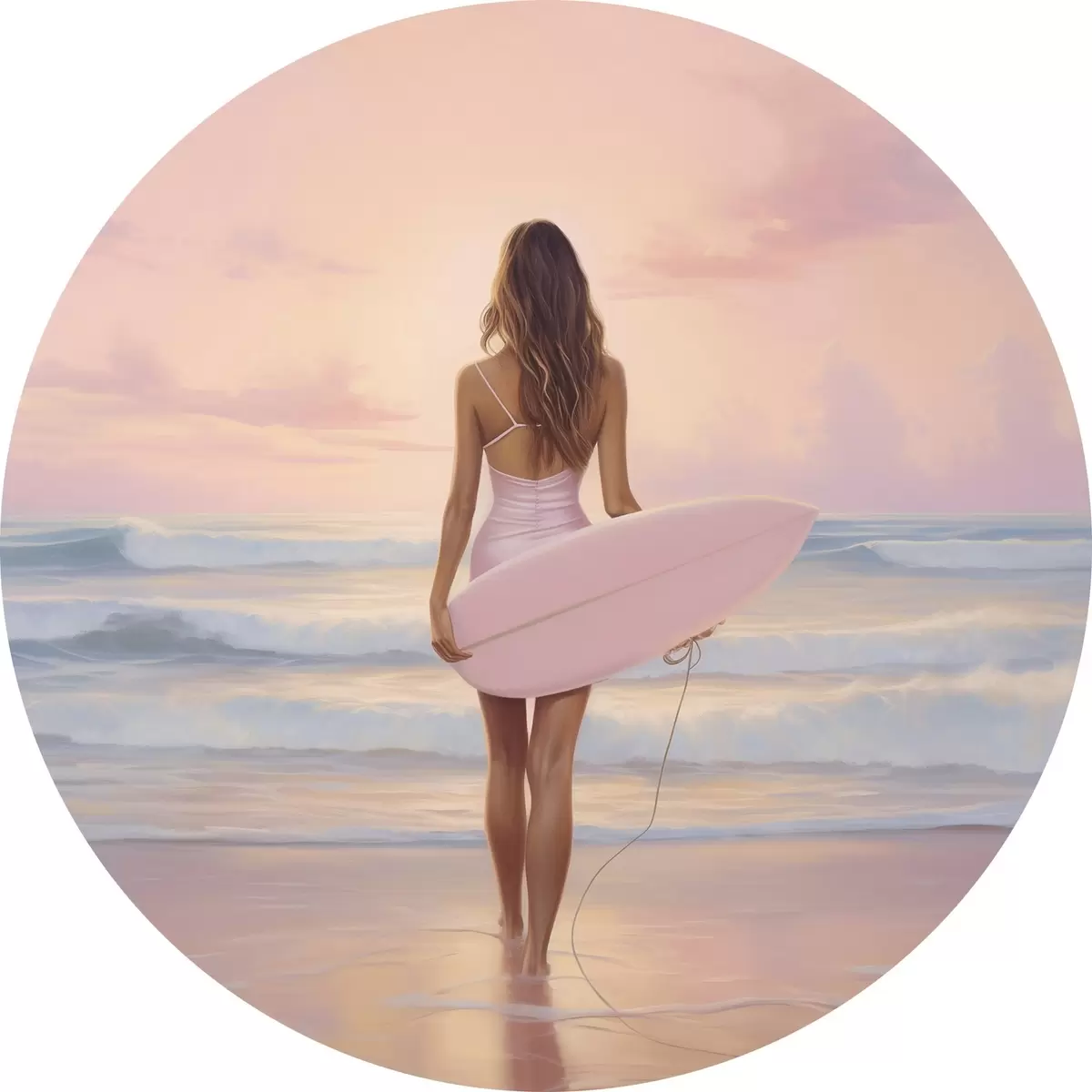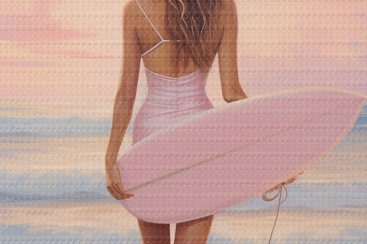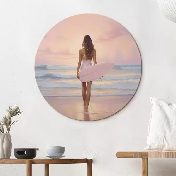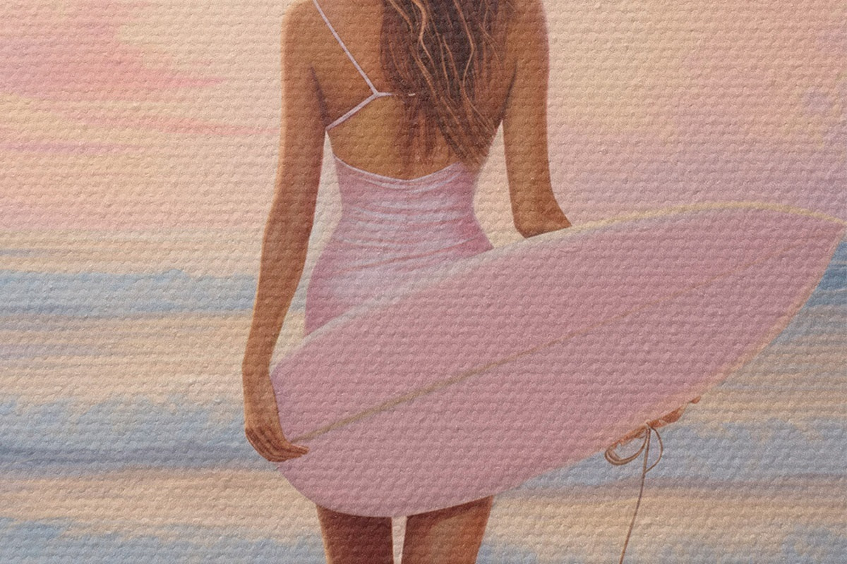 Nuotrauka Mergina su banglente vandenyno paplūdimyje, saulėlydis, akrilo stiliaus piešinys Nr r43881