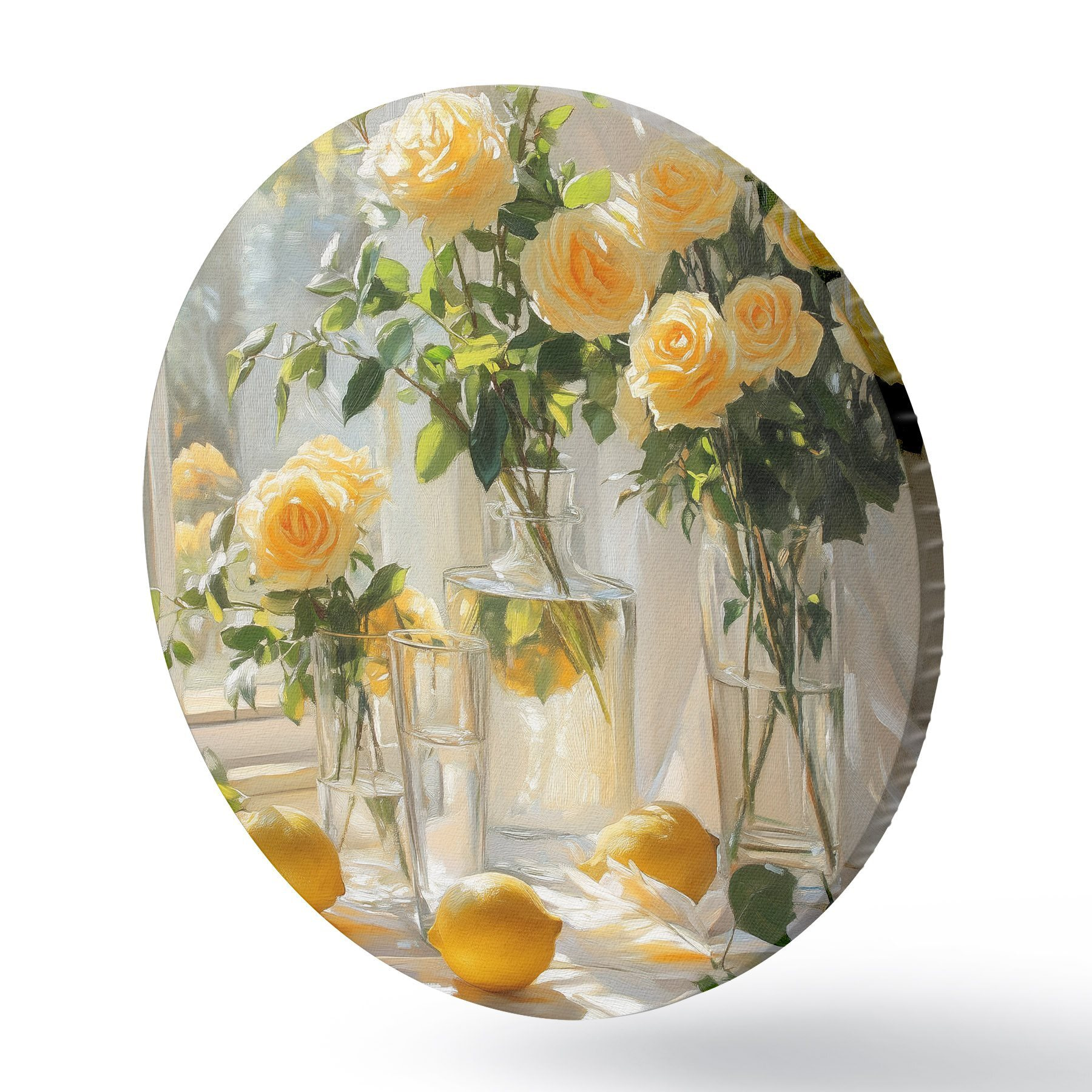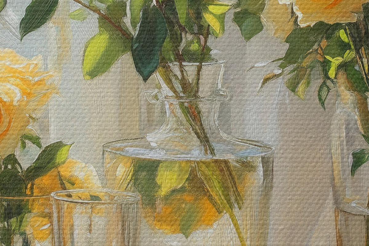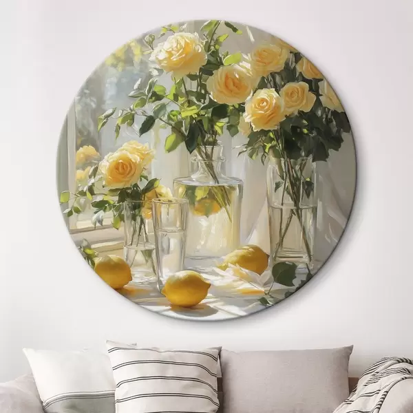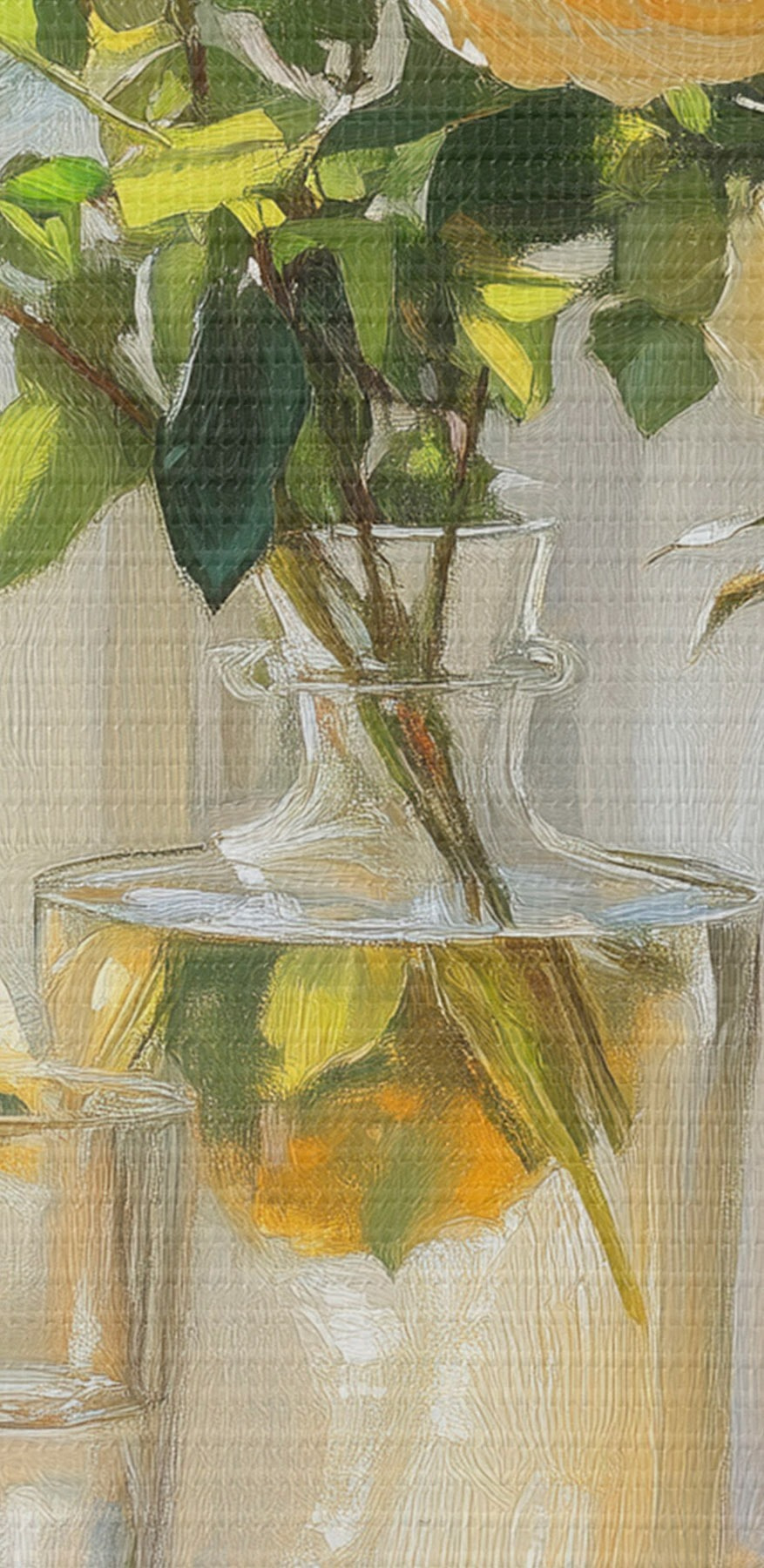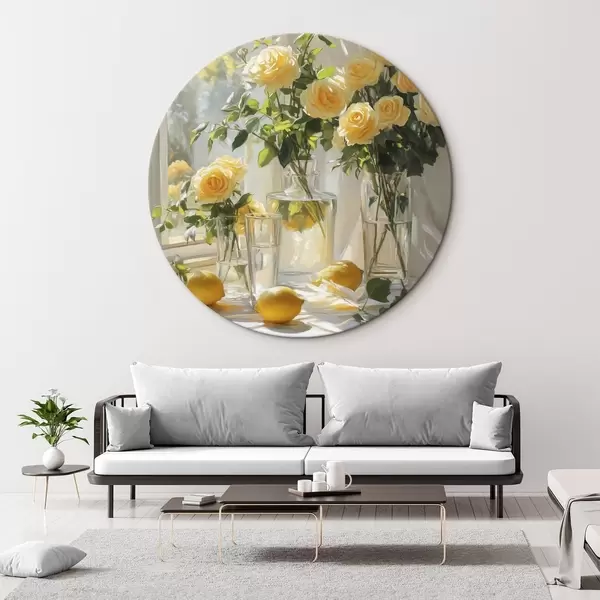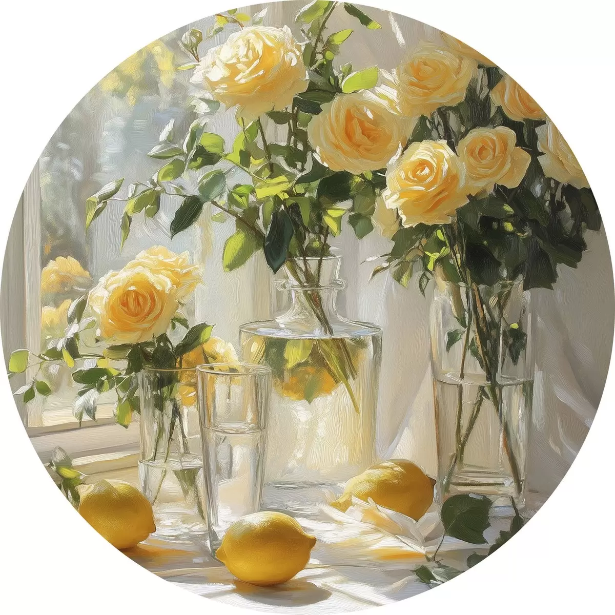 Nuotrauka Rožės vazose, aliejaus stiliaus piešinys, švelni saulės šviesa, citrinos, pavasaris Nr r43887
