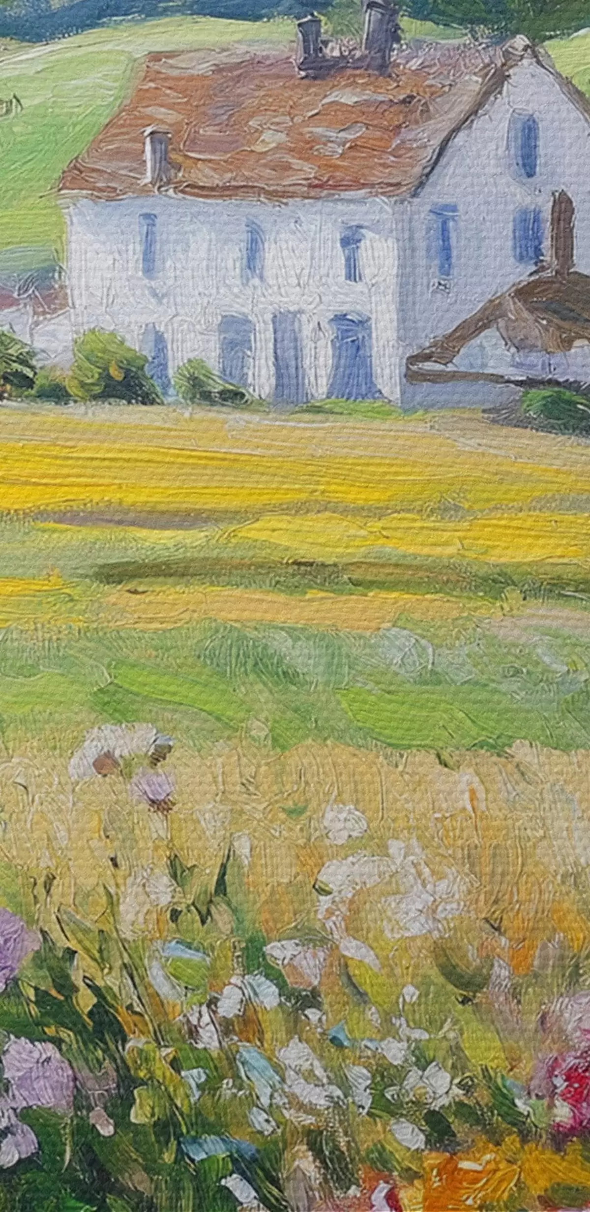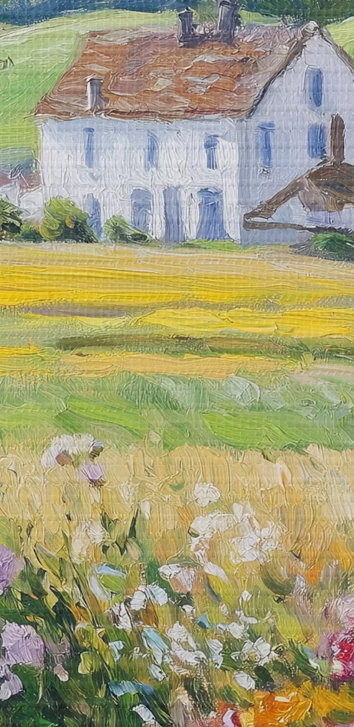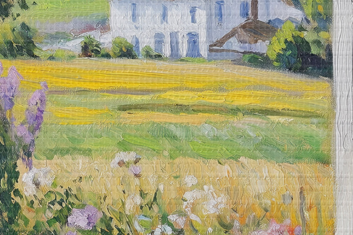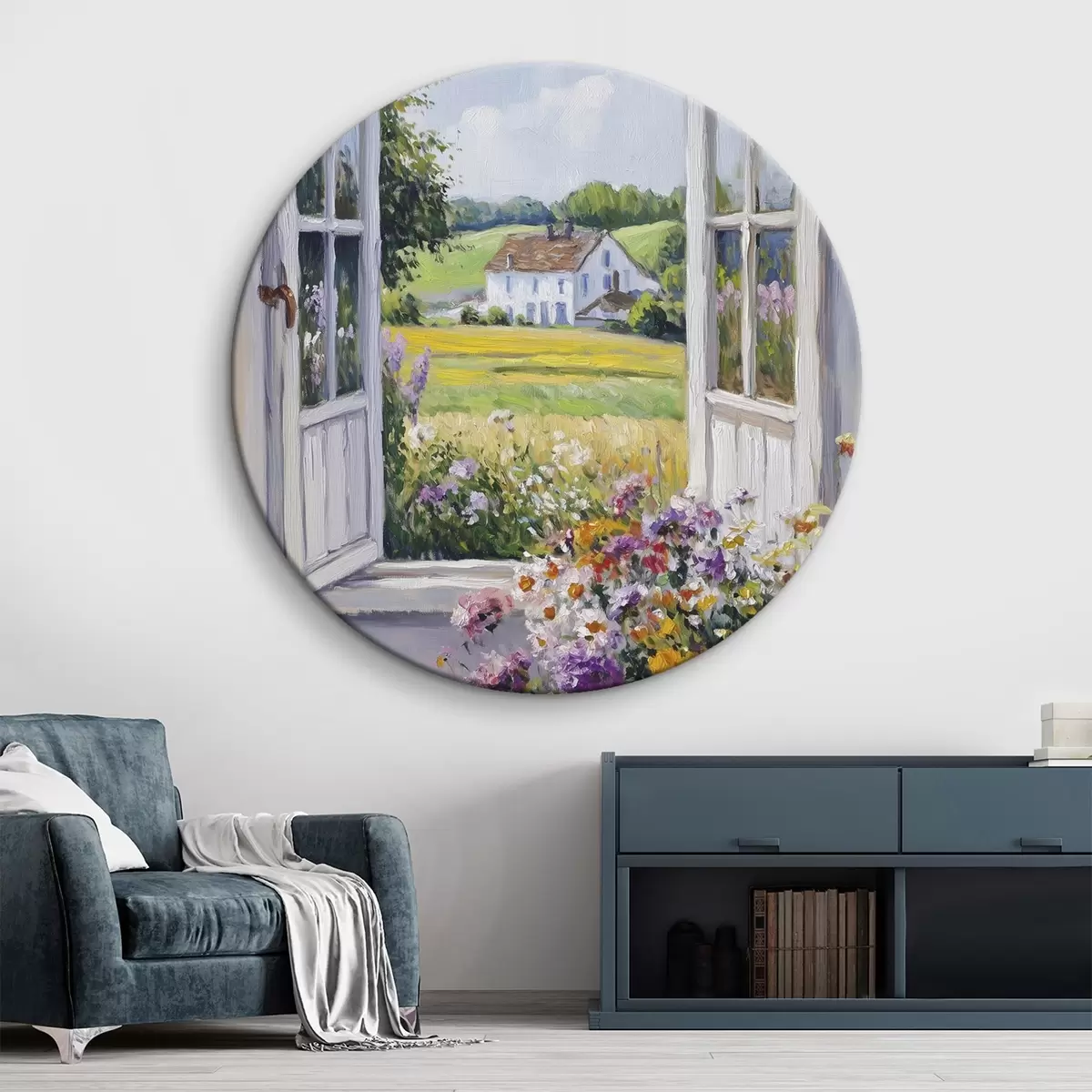 Nuotrauka Kaimo peizažai mediniame lange, gėlės, laukai, aliejinis stilius, ūkinis pastatas Nr r43888