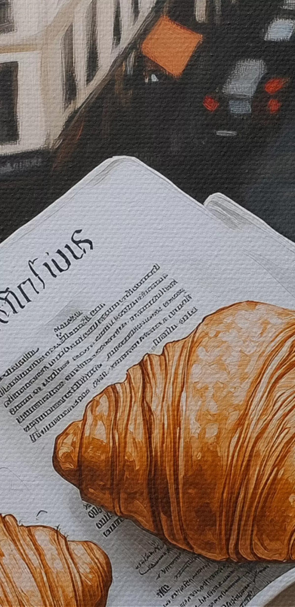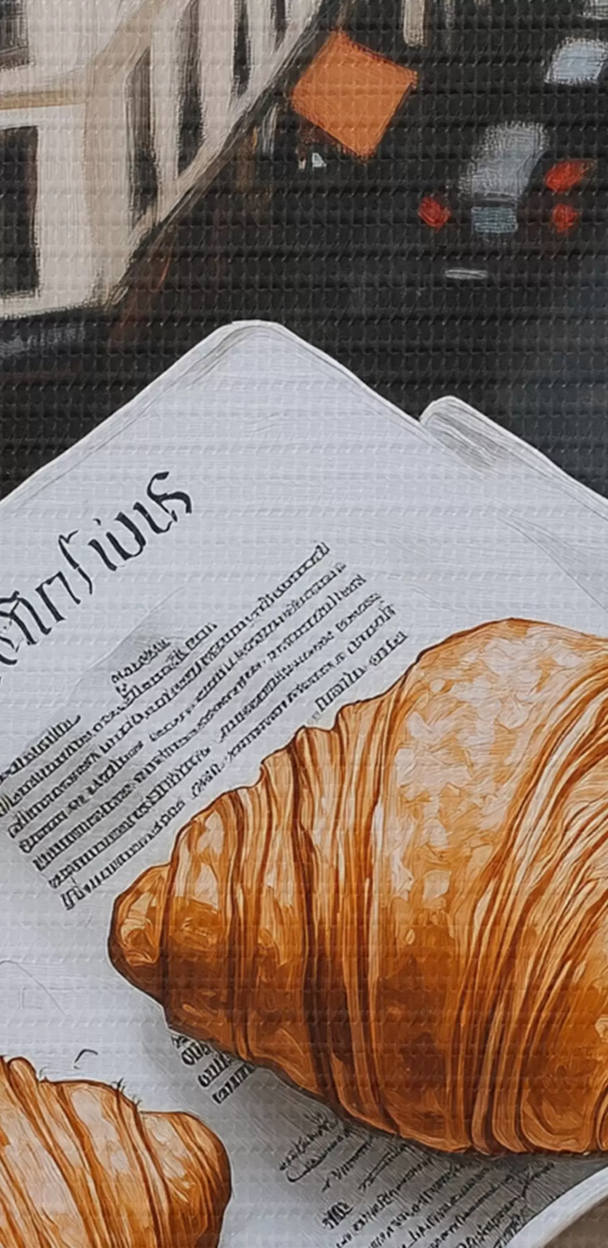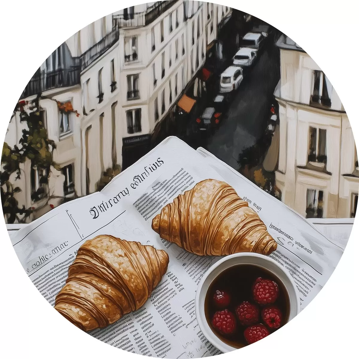 Nuotrauka Rytinė kava su kruasanais, miesto gatvė, architektūrinis, aliejinis stilius Nr r43891