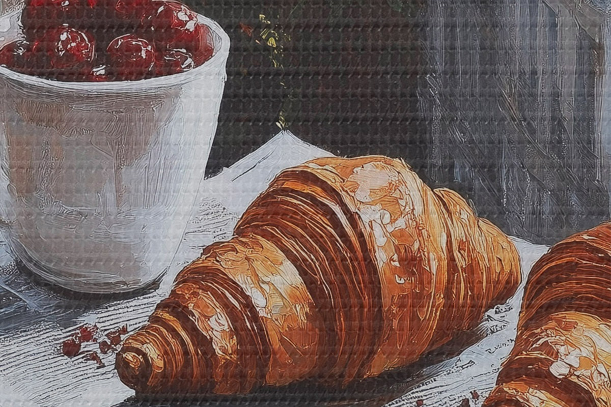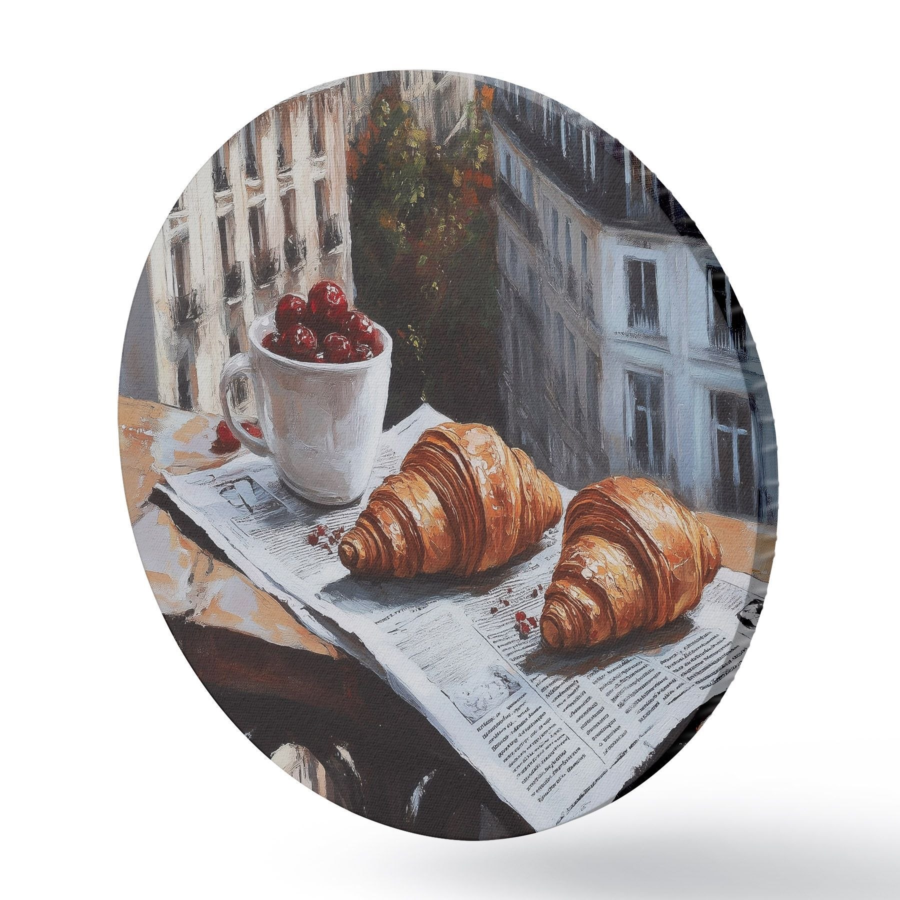 Nuotrauka Paryžiaus rytas, kava su kruasanais, miesto vaizdas, piešinys aliejiniais dažais Nr r43892