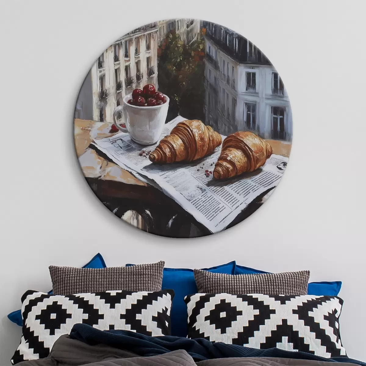 Apvalūs paveikslai Paryžiaus rytas, kava su kruasanais, miesto vaizdas, piešinys aliejiniais dažais r43892