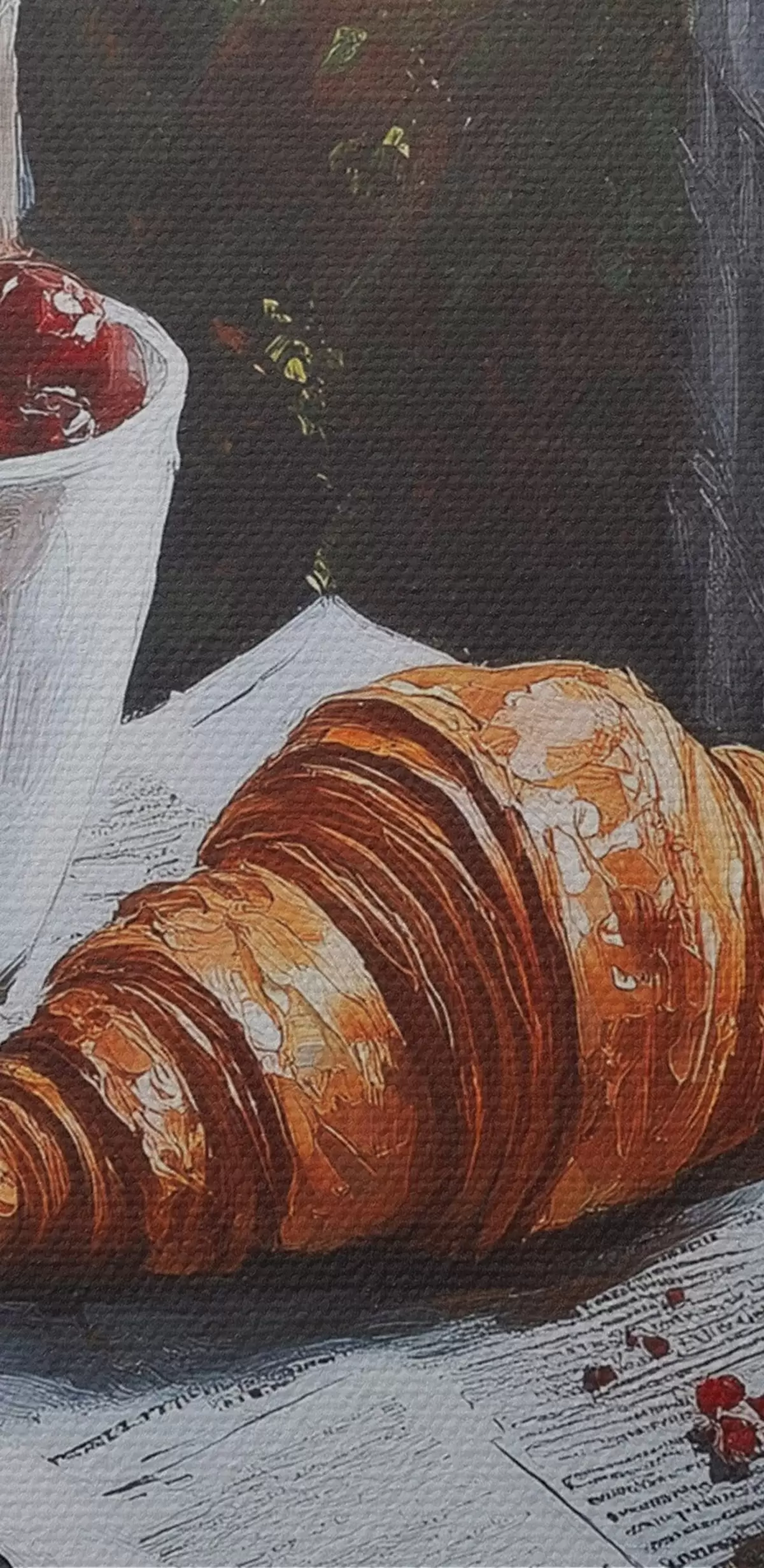 Nuotrauka Paryžiaus rytas, kava su kruasanais, miesto vaizdas, piešinys aliejiniais dažais Nr r43892