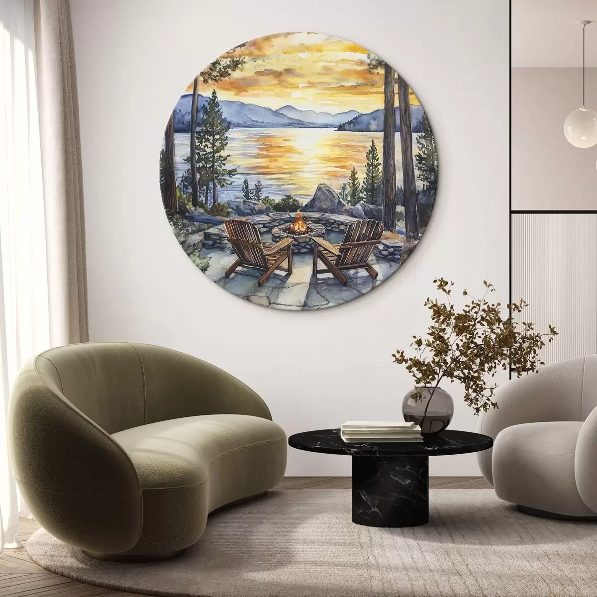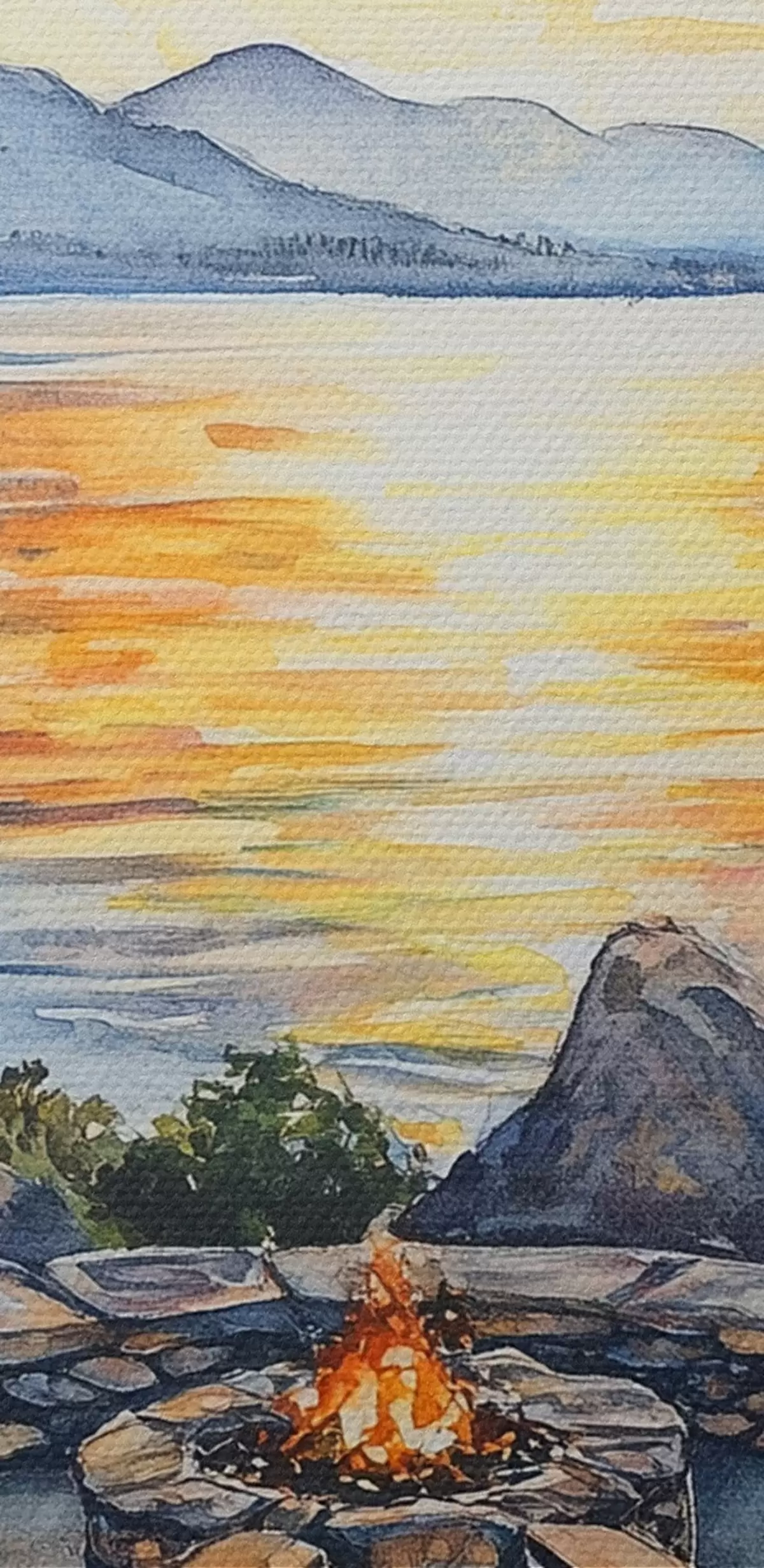 Nuotrauka Ežeras su kalnais saulėlydyje, kelionės, jaukus židinys, akvarelė Nr r44018
