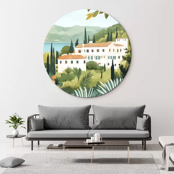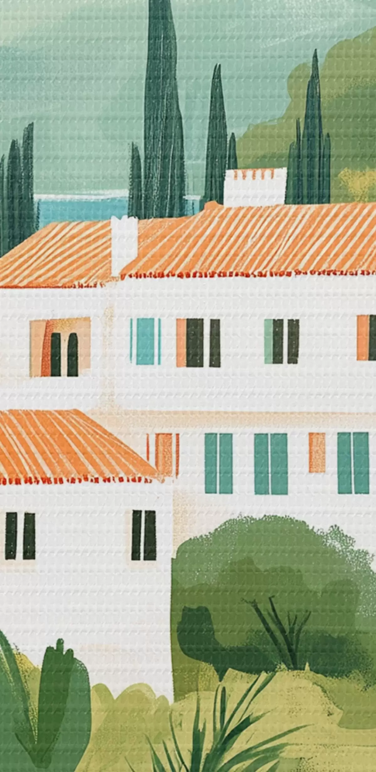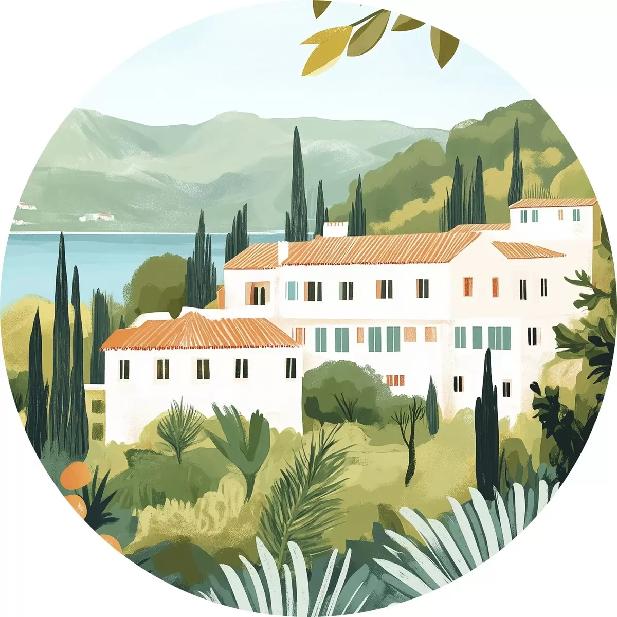 Nuotrauka Viduržemio jūros kraštovaizdis su apelsinmedžiais ir namais, jūros pakrantė Nr r44027