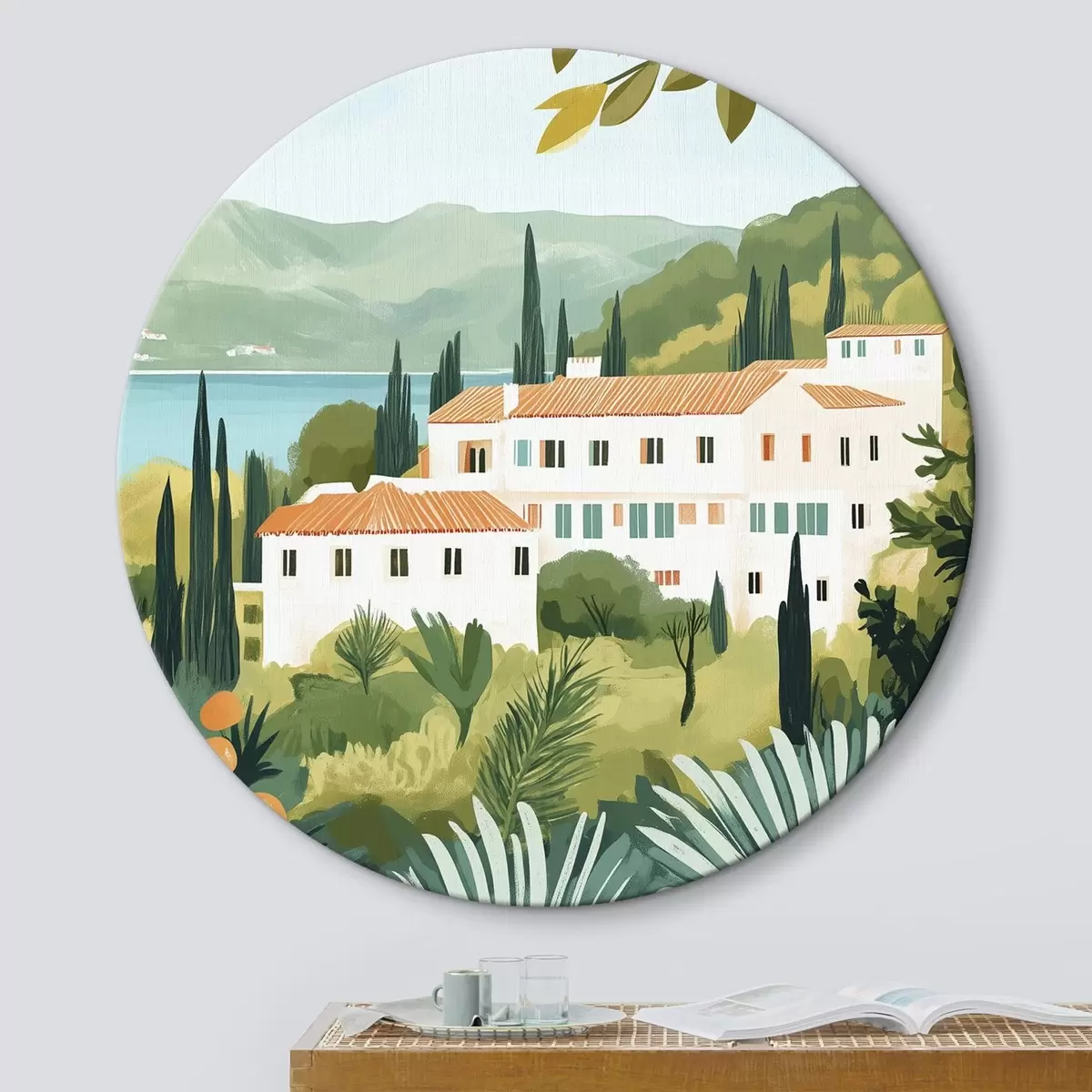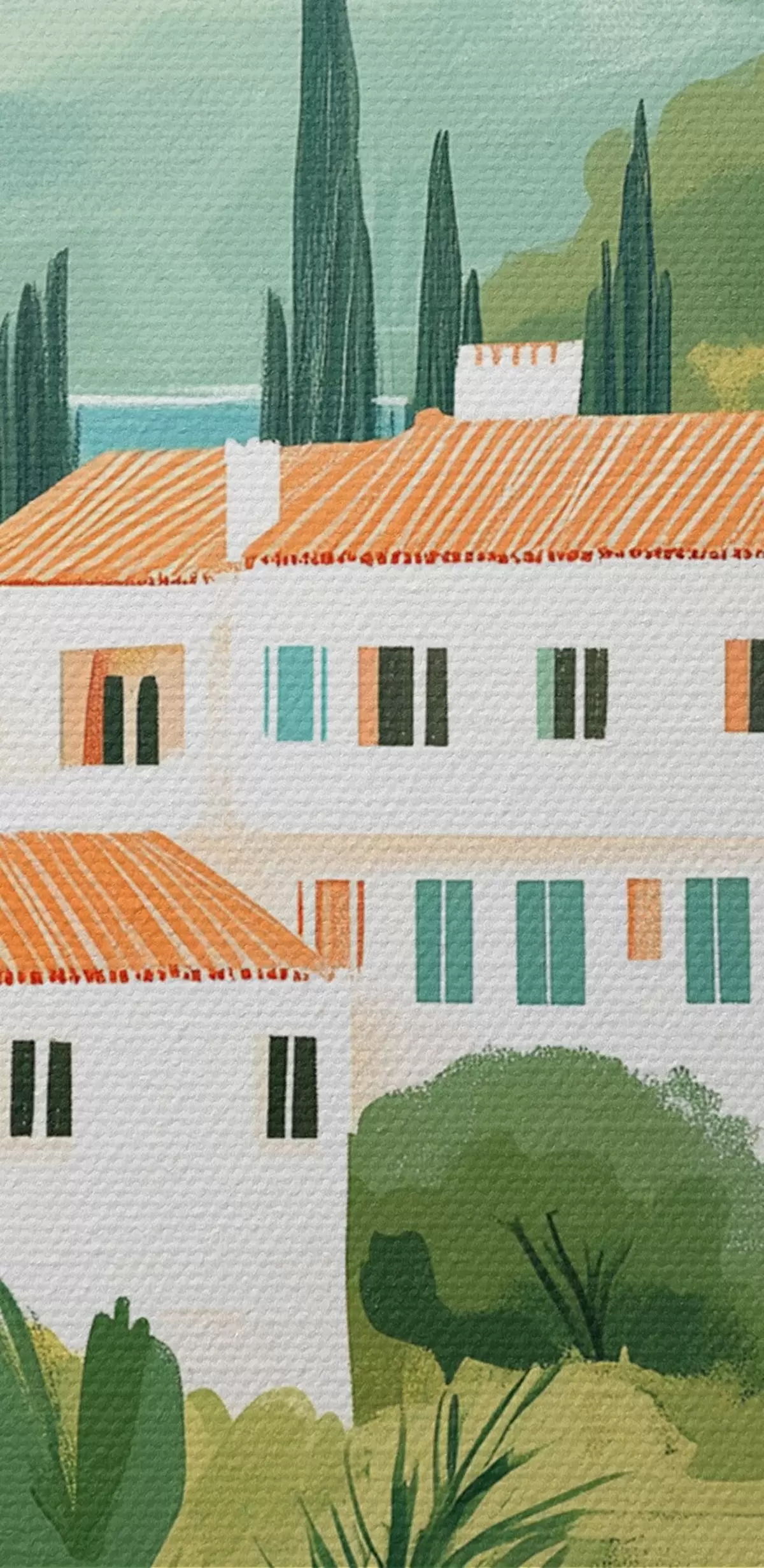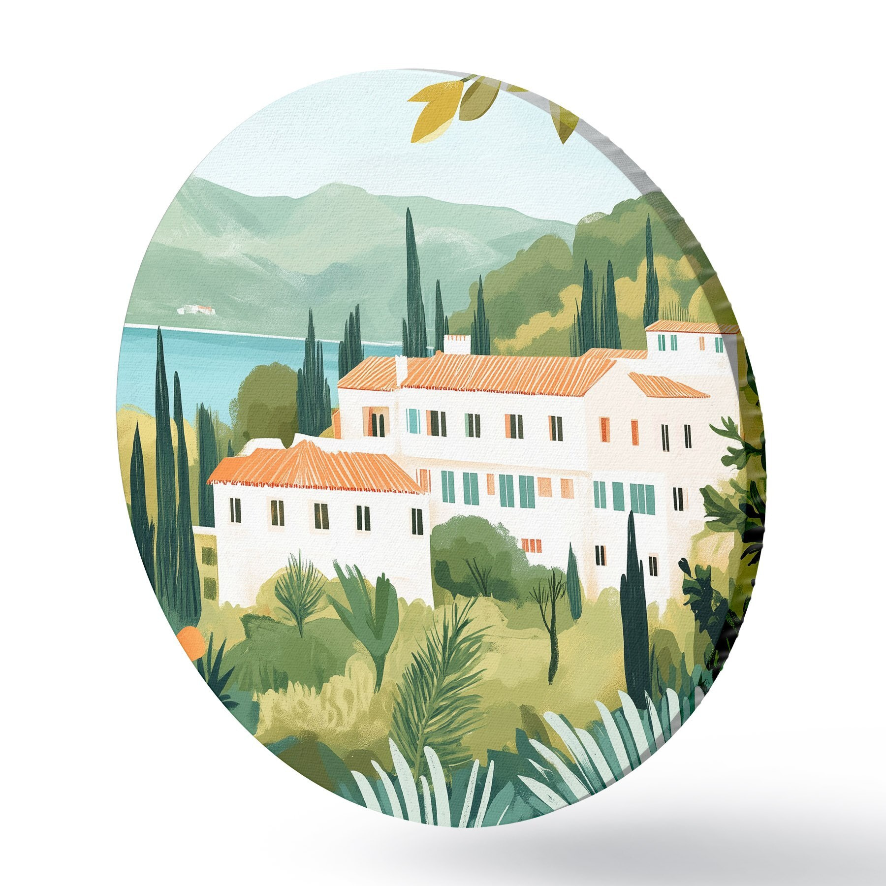 Nuotrauka Viduržemio jūros kraštovaizdis su apelsinmedžiais ir namais, jūros pakrantė Nr r44027