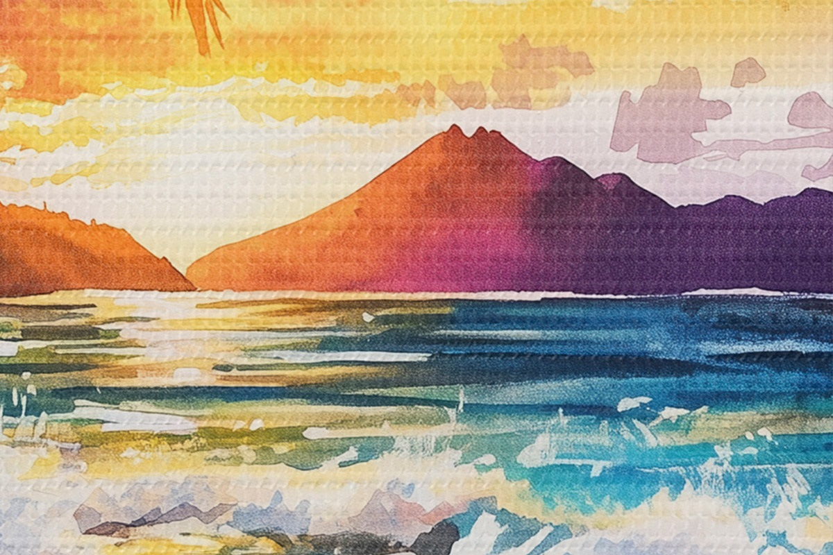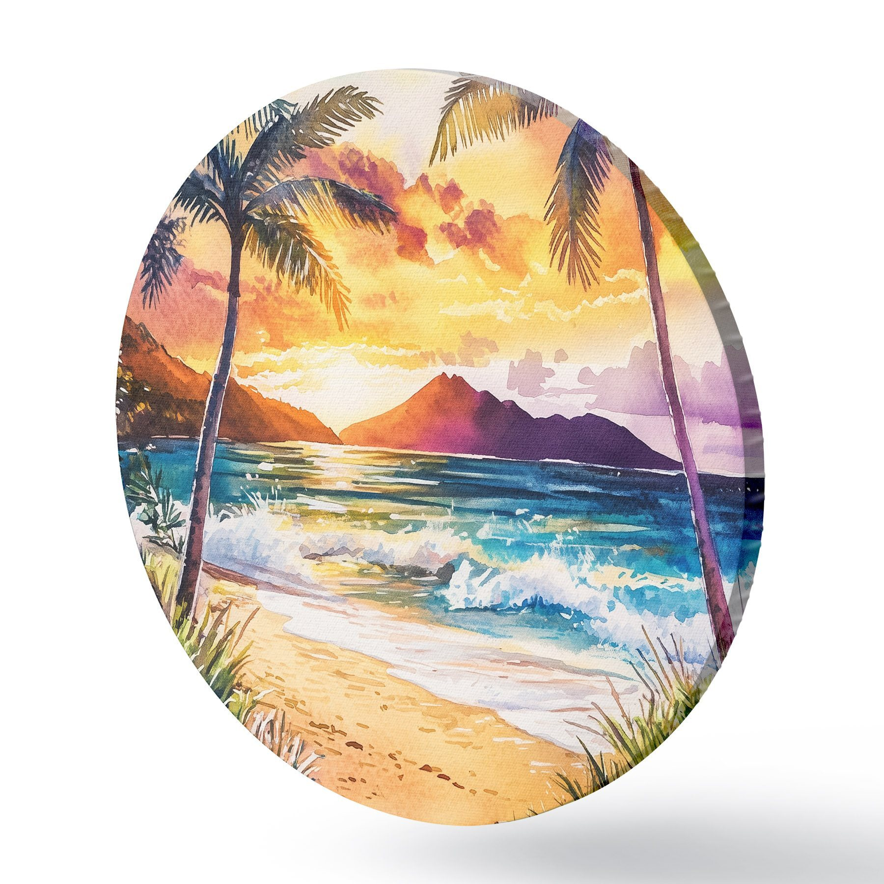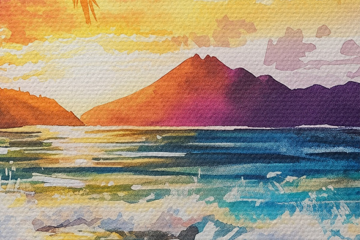Nuotrauka Saulėlydis Havajų saloje, palmės, vandenynas, spalvingas dangus, akvarelės stilius Nr r44142
