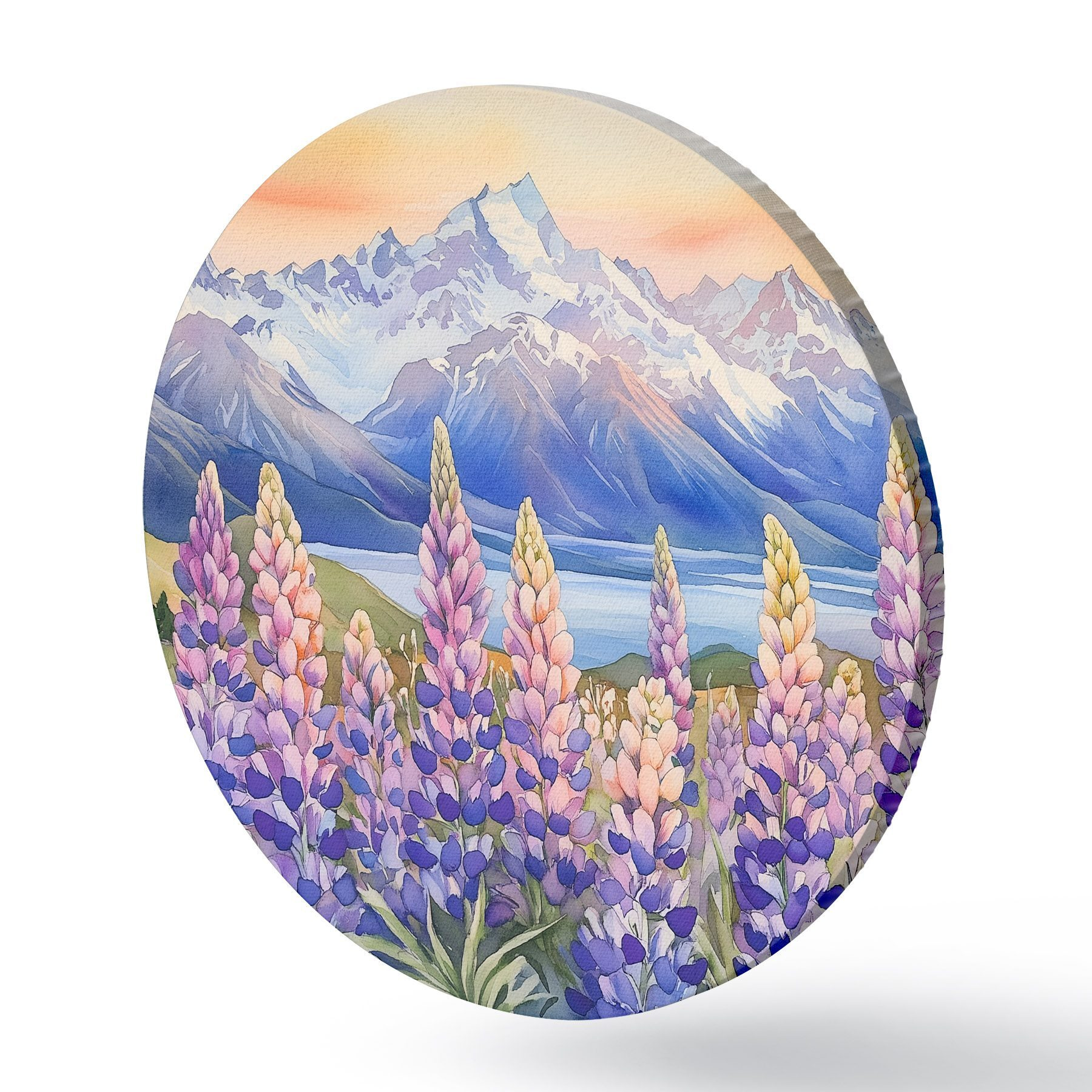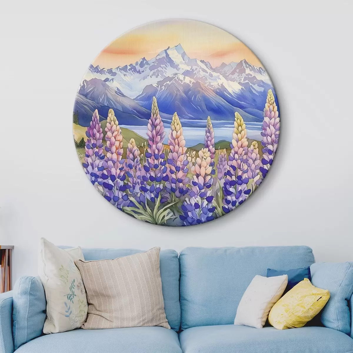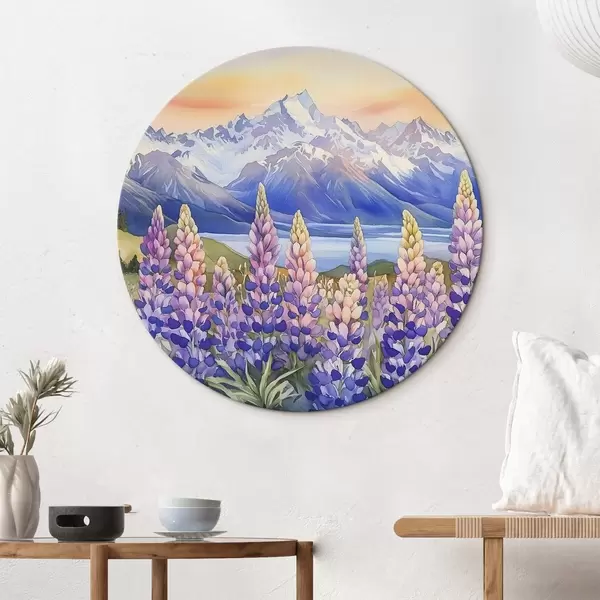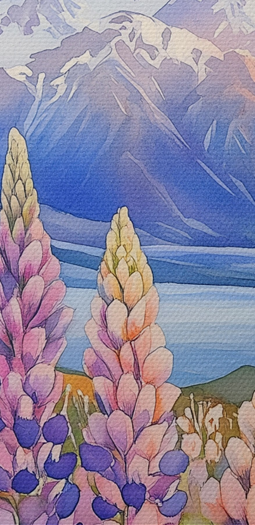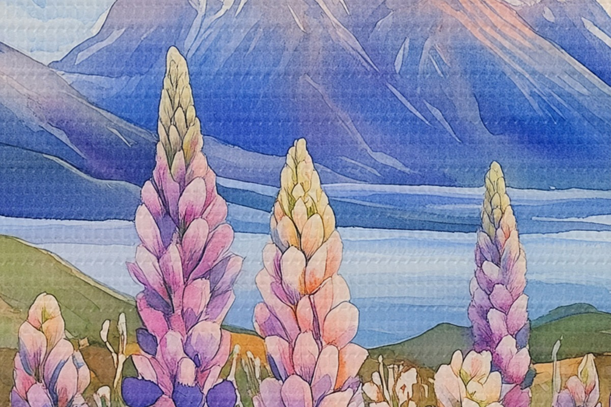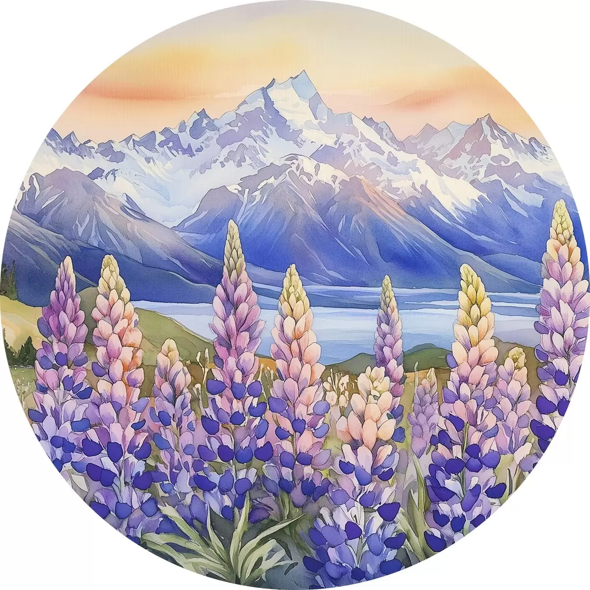 Nuotrauka Lupinų gėlės, pieva, kalnai, akvarelės stilius, saulėlydžio dangus Nr r44146