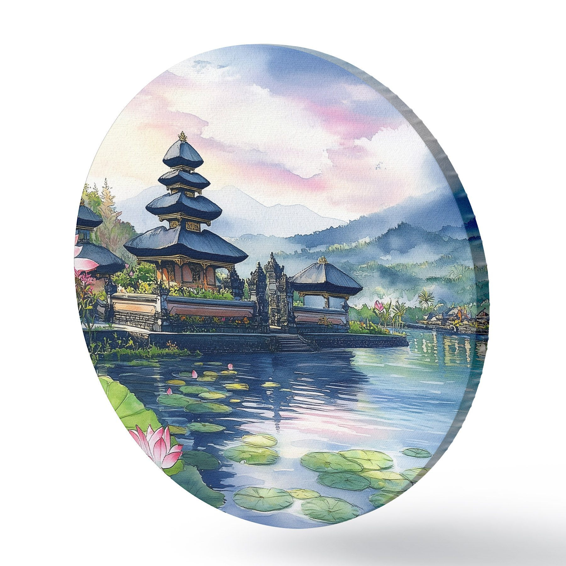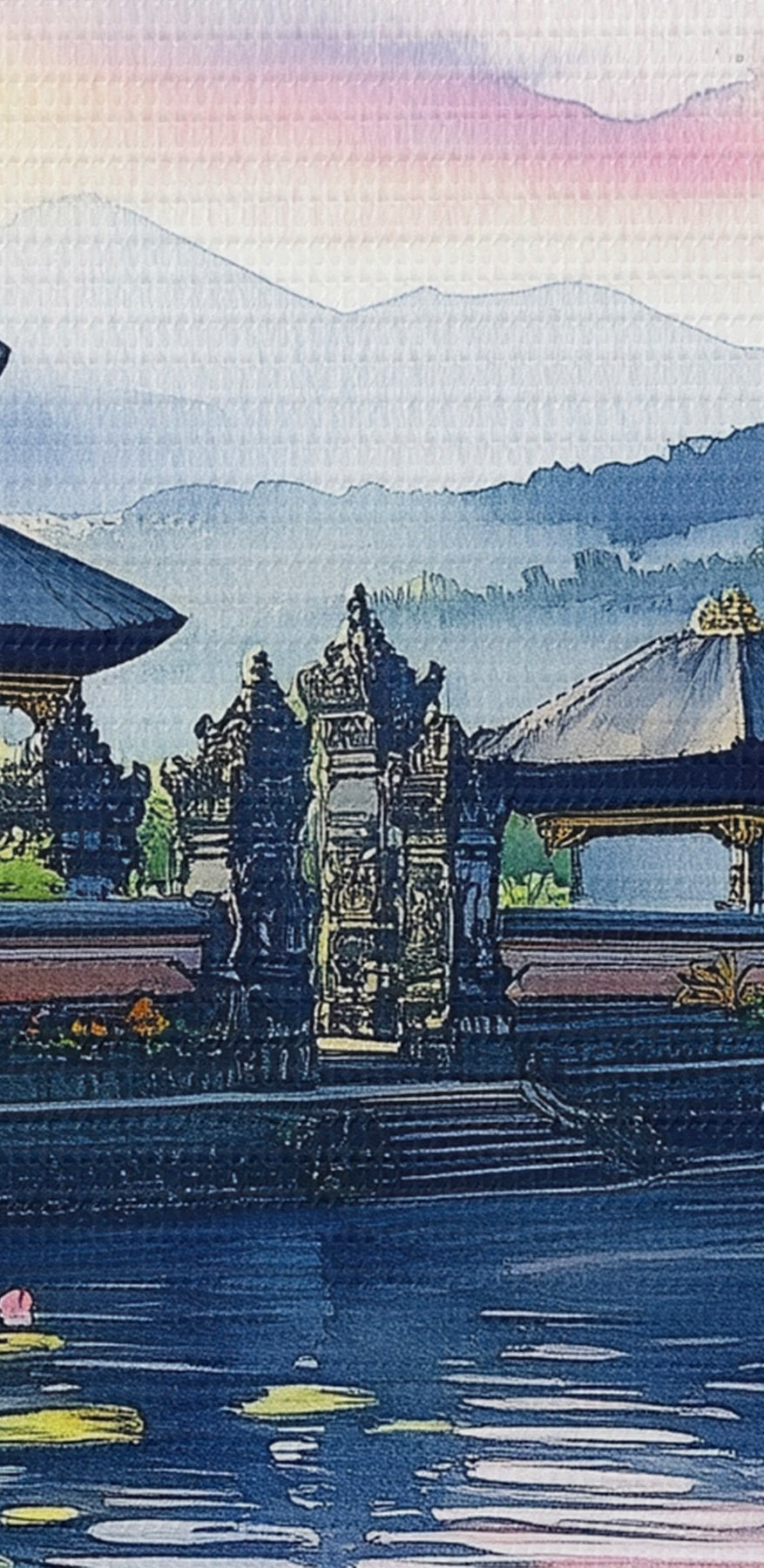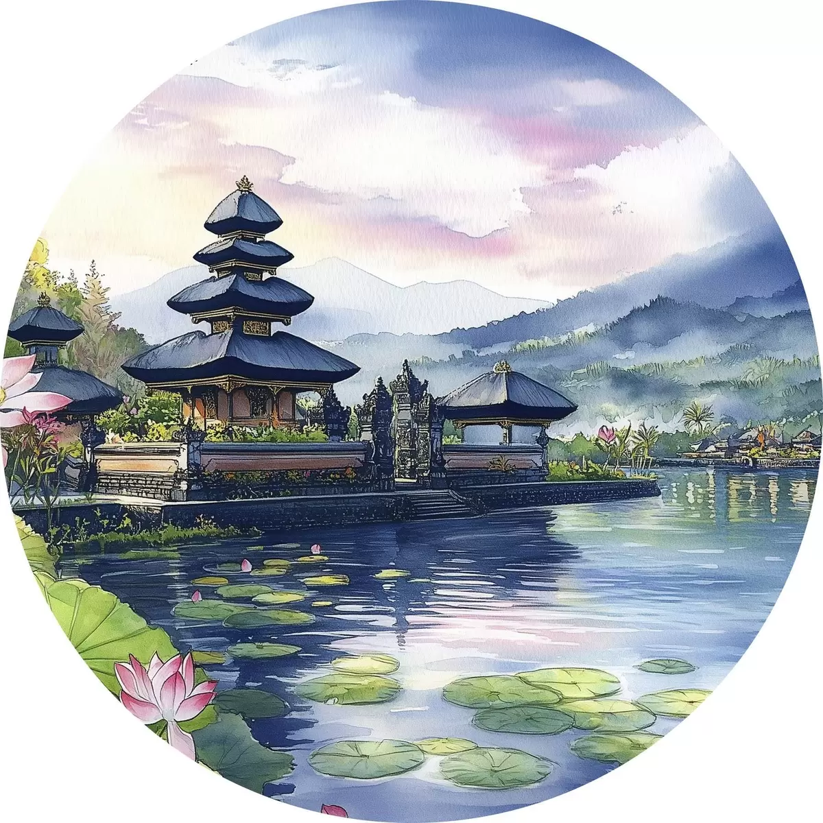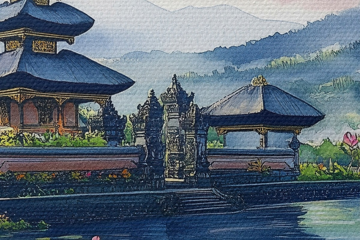 Nuotrauka Indonezijos sala, šventykla, budizmas, atogrąžų gamta, akvarelės stilius Nr r44148