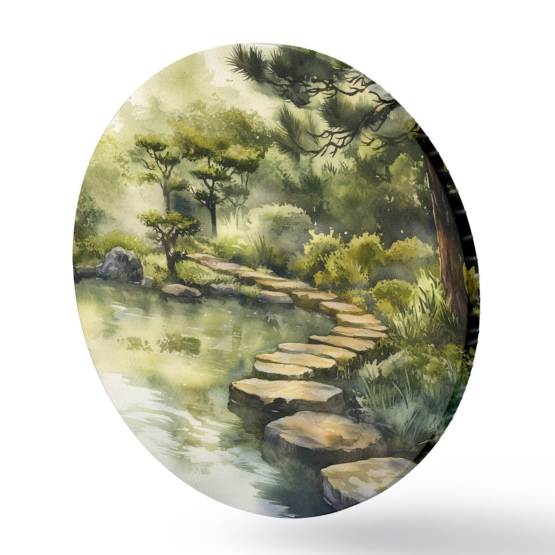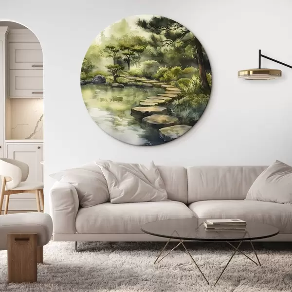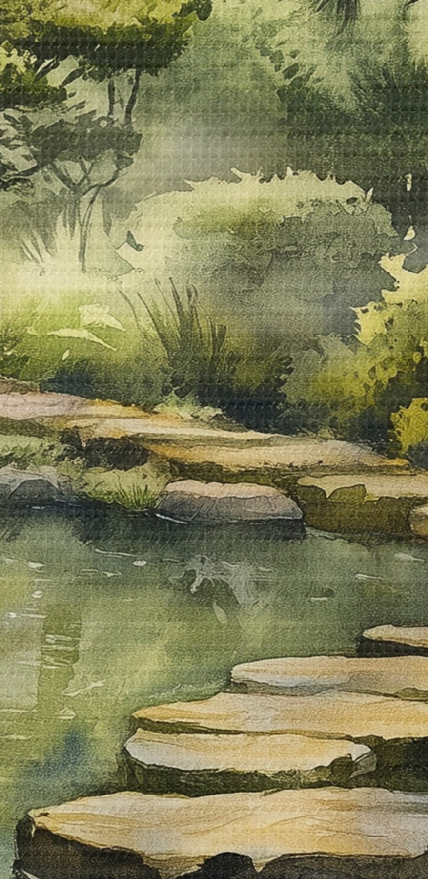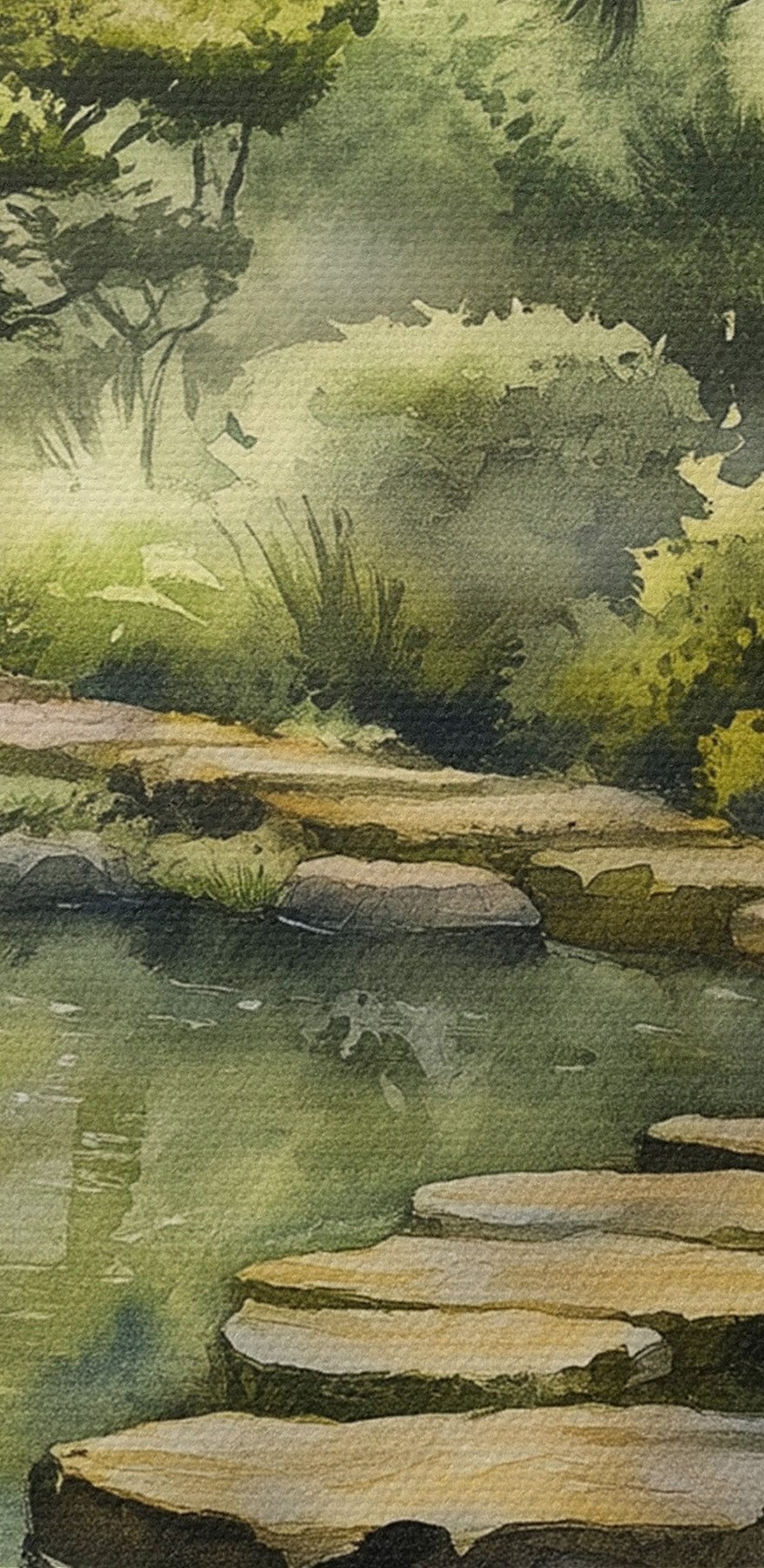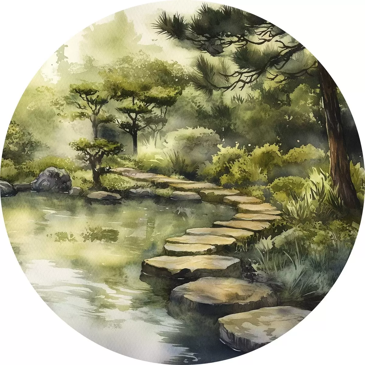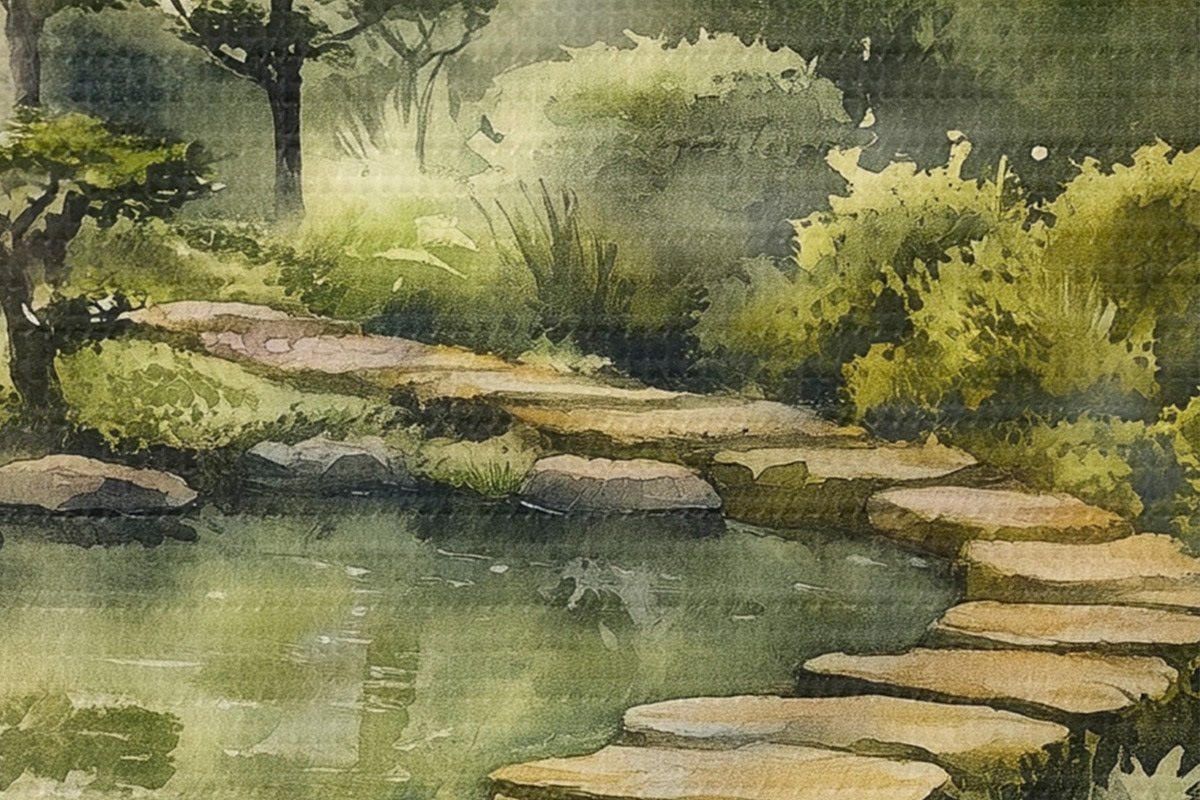 Nuotrauka Rytietiškas miškas su akmenimis, tvenkiniu ir pušimis, žaluma, akvarelės stilius Nr r44311