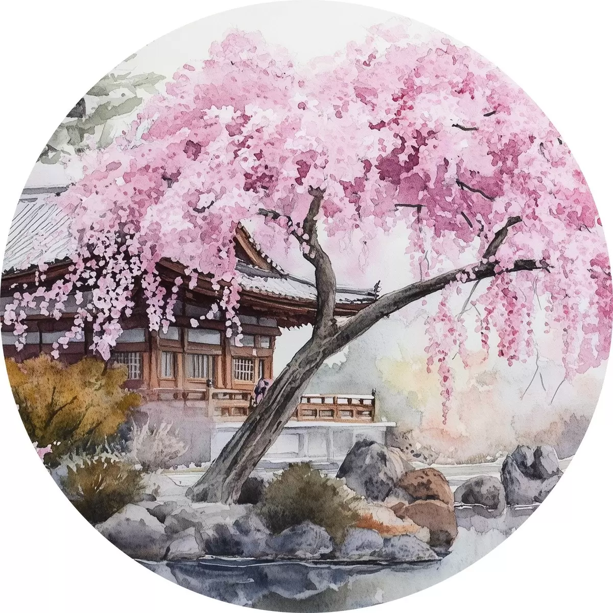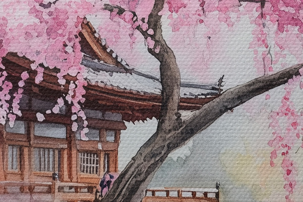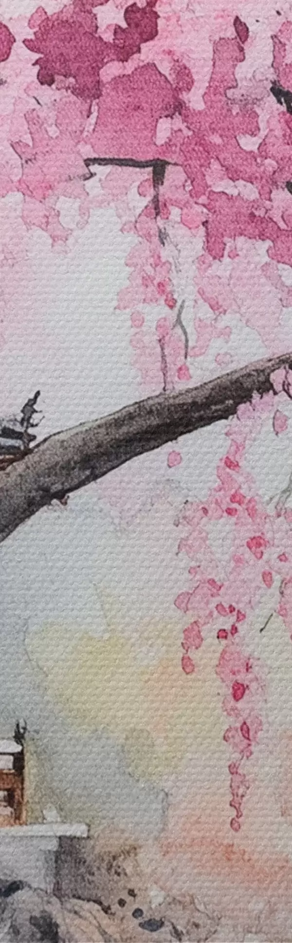 Nuotrauka Rožinis vyšnių medis prie namo ant ežero, Japonija, rytietiškas, akvarelės stilius Nr r44312