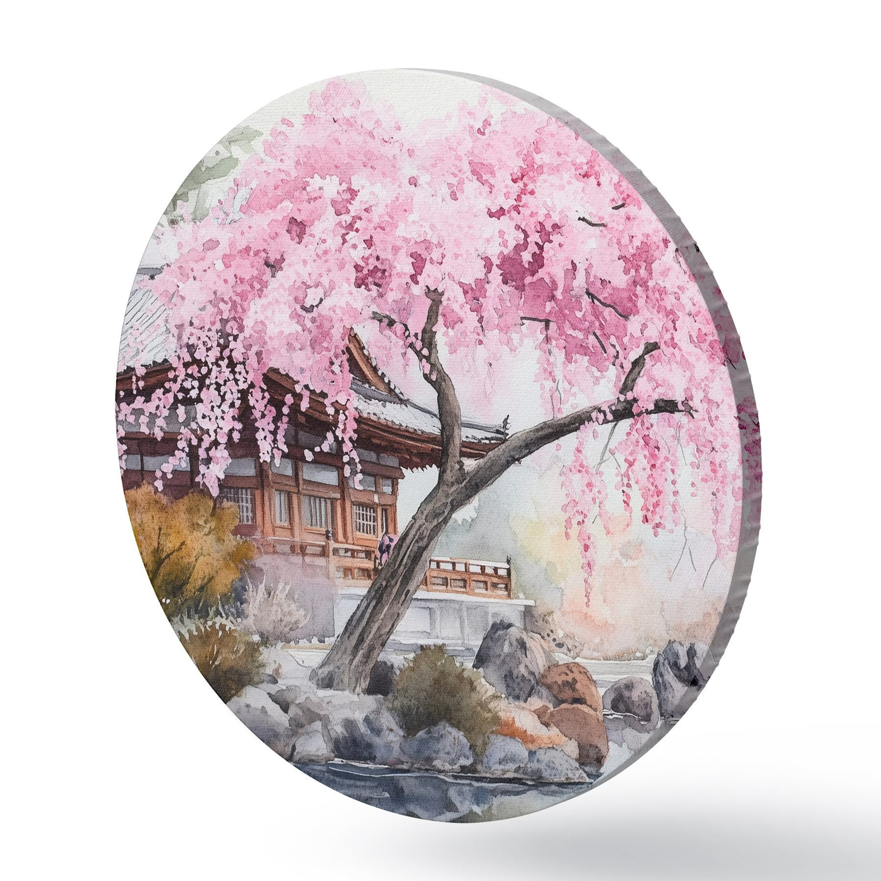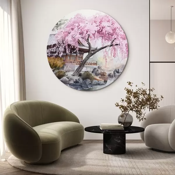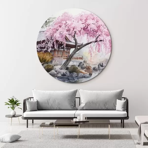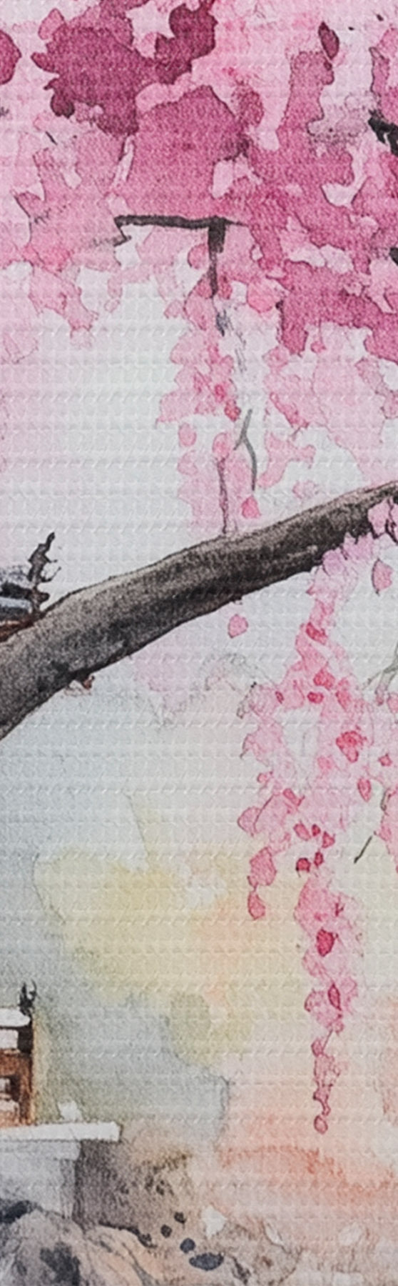 Nuotrauka Rožinis vyšnių medis prie namo ant ežero, Japonija, rytietiškas, akvarelės stilius Nr r44312