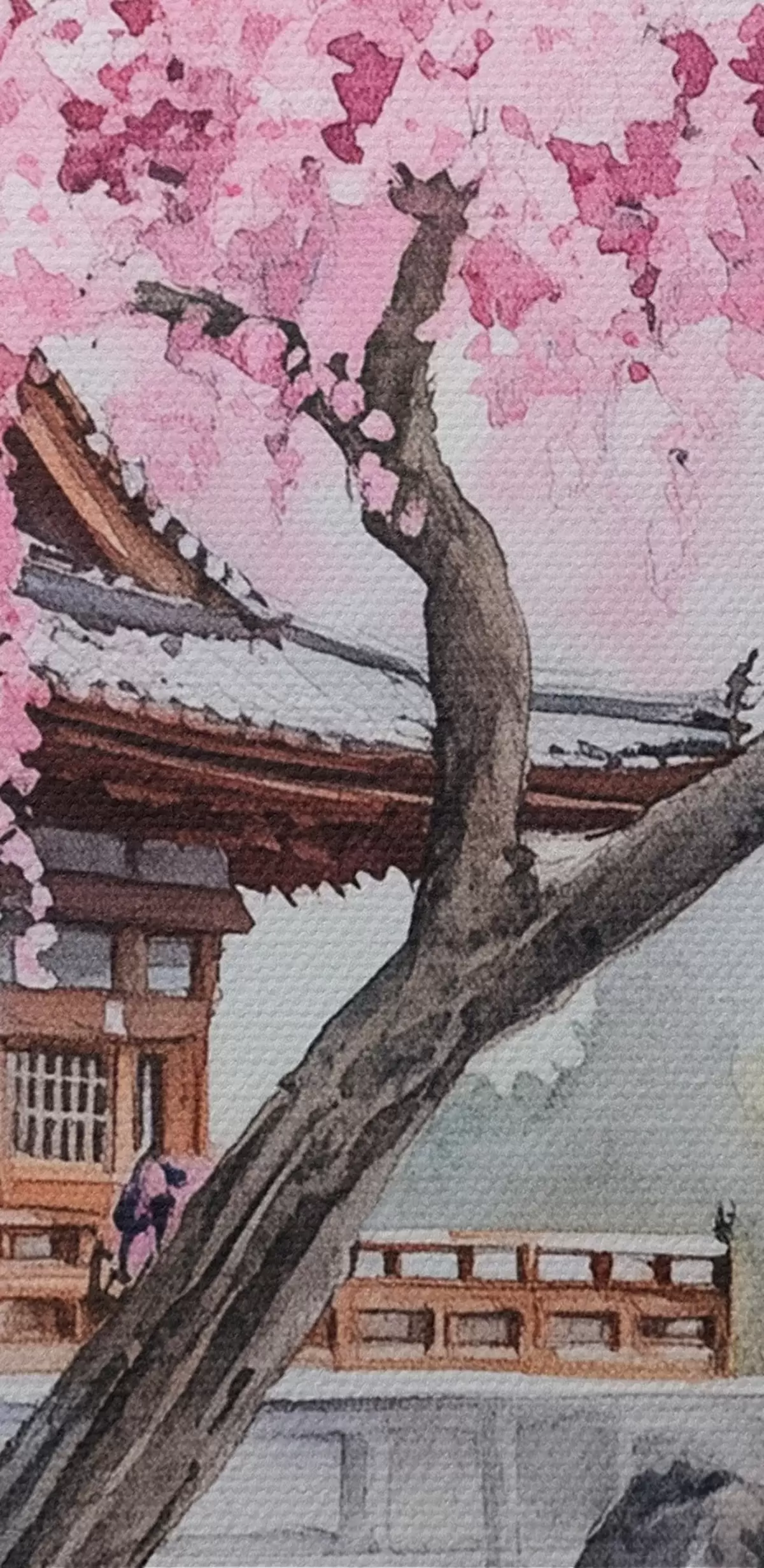 Nuotrauka Rožinis vyšnių medis prie namo ant ežero, Japonija, rytietiškas, akvarelės stilius Nr r44312