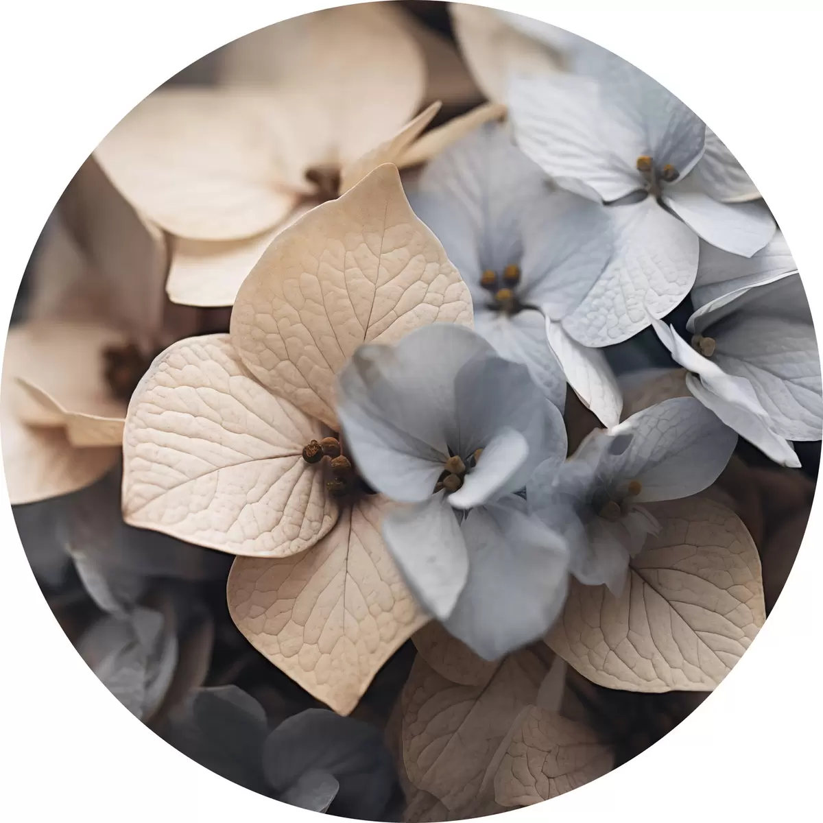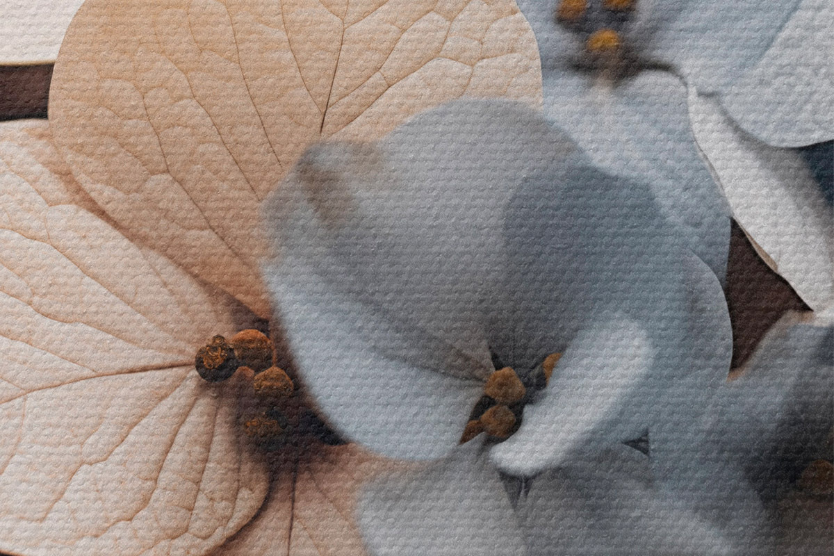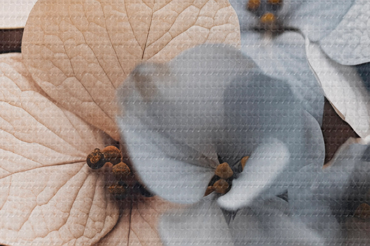 Nuotrauka Hortenzijos gėlės, šviesiai mėlyni ir smėlio spalvos žiedlapiai, su detalių tekstūrų, elegantiška gėlių kompozicija Nr r44394