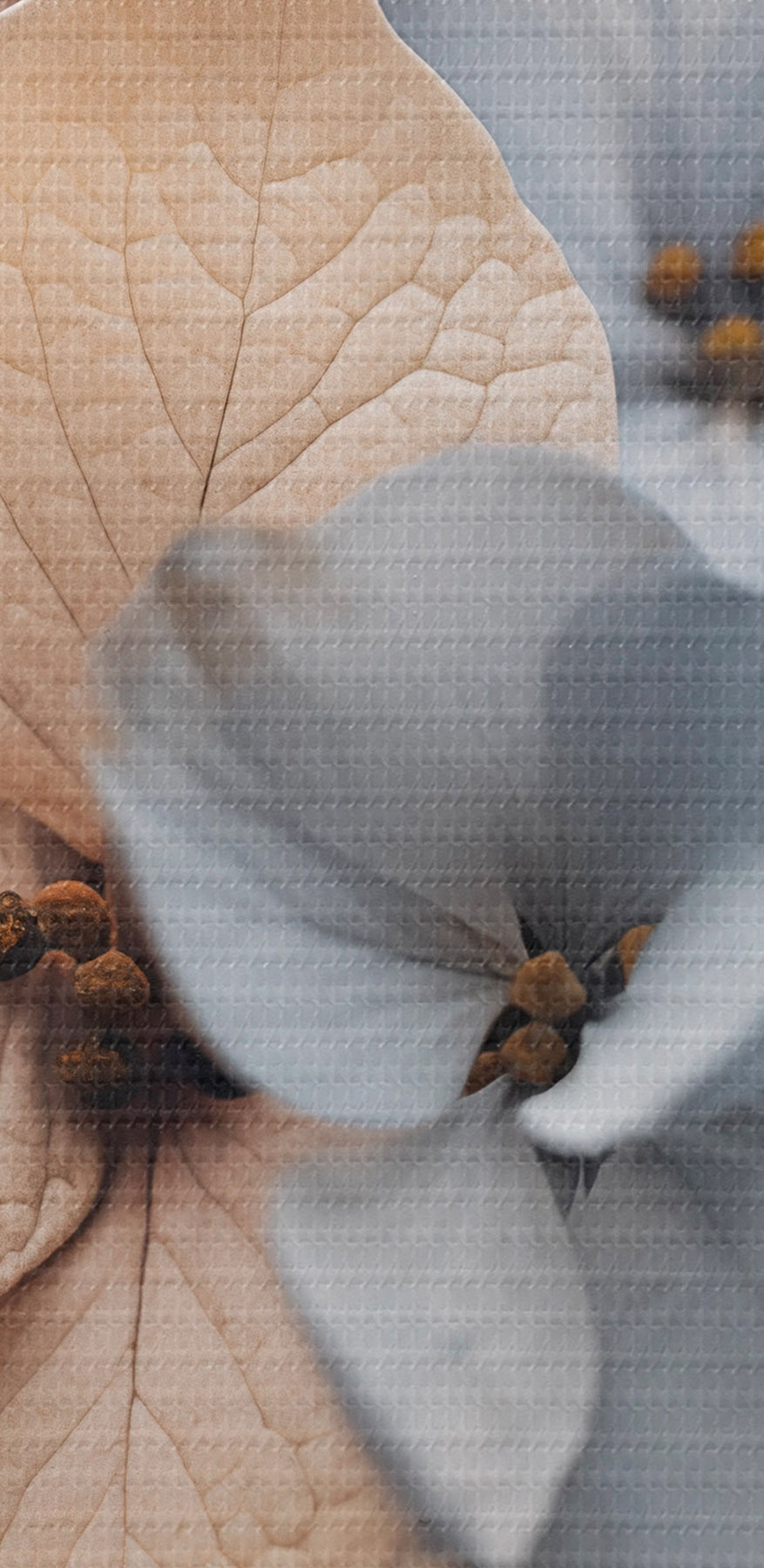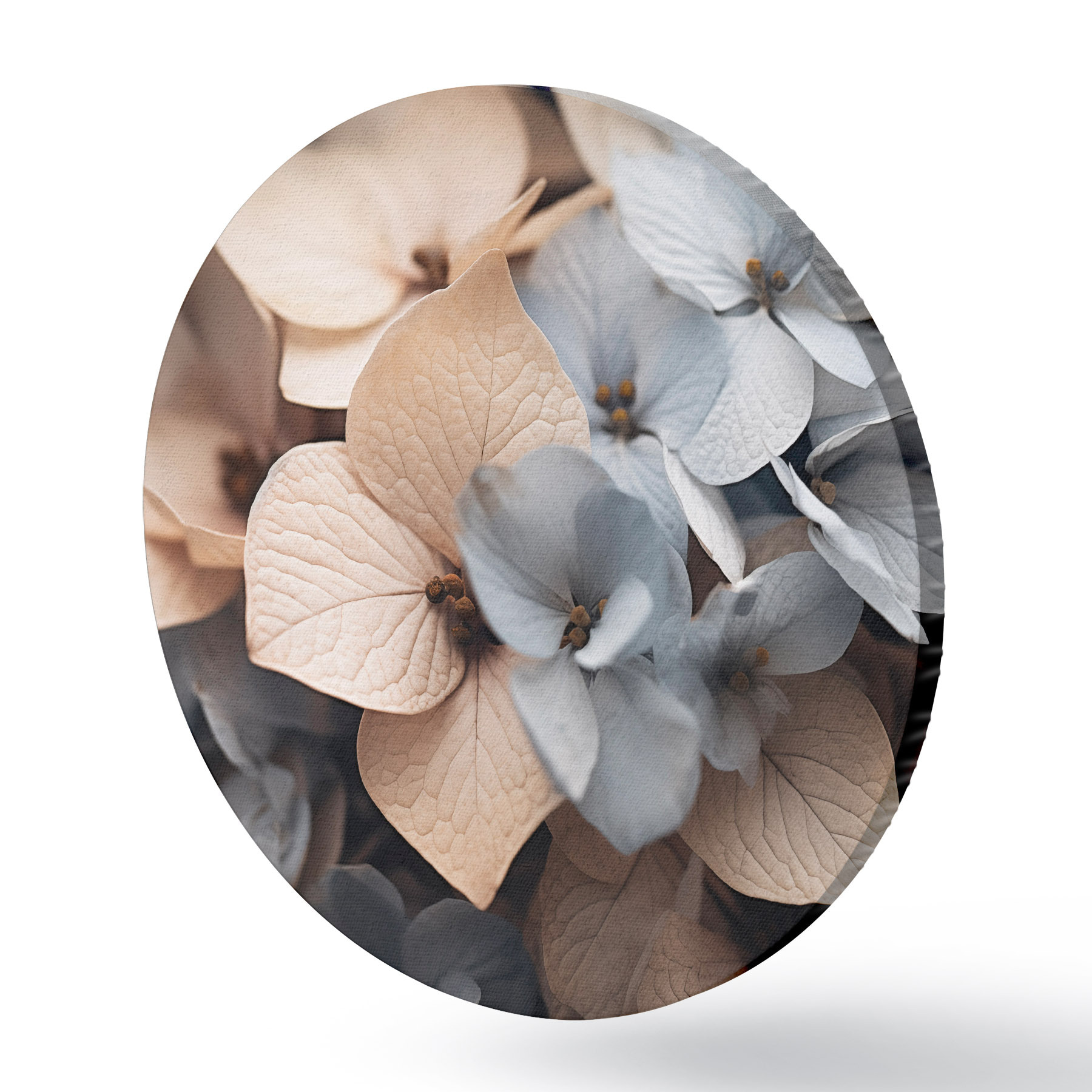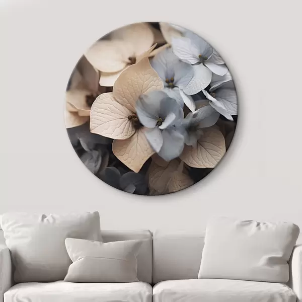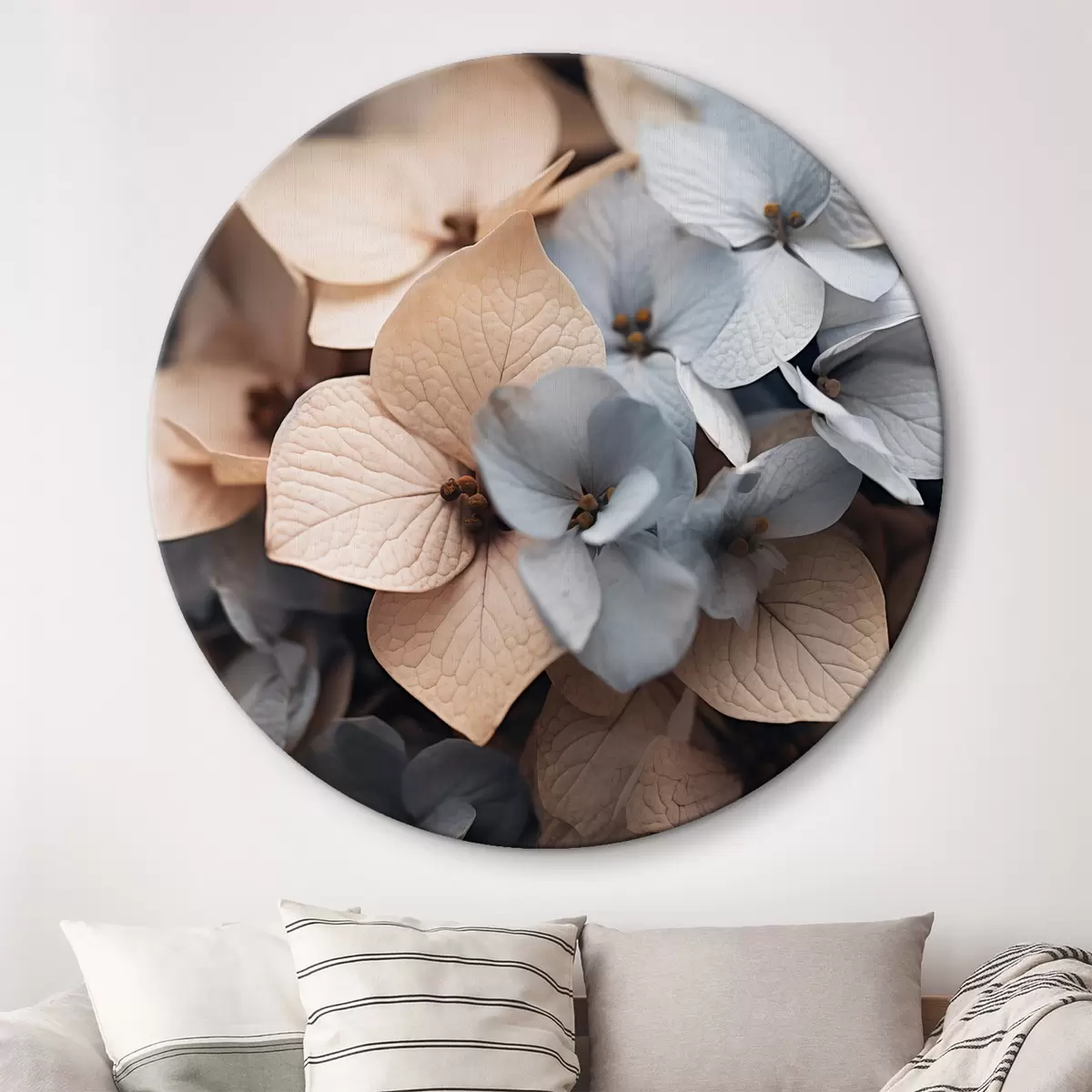 Nuotrauka Hortenzijos gėlės, šviesiai mėlyni ir smėlio spalvos žiedlapiai, su detalių tekstūrų, elegantiška gėlių kompozicija Nr r44394