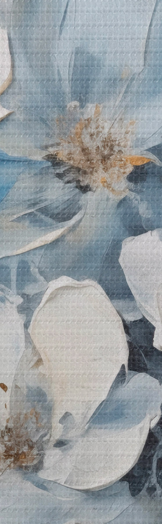 Nuotrauka Baltos gėlės su mėlynais lapais šviesiai smėlio spalvos fone, su matomais teptuko potėpiais Nr r44395